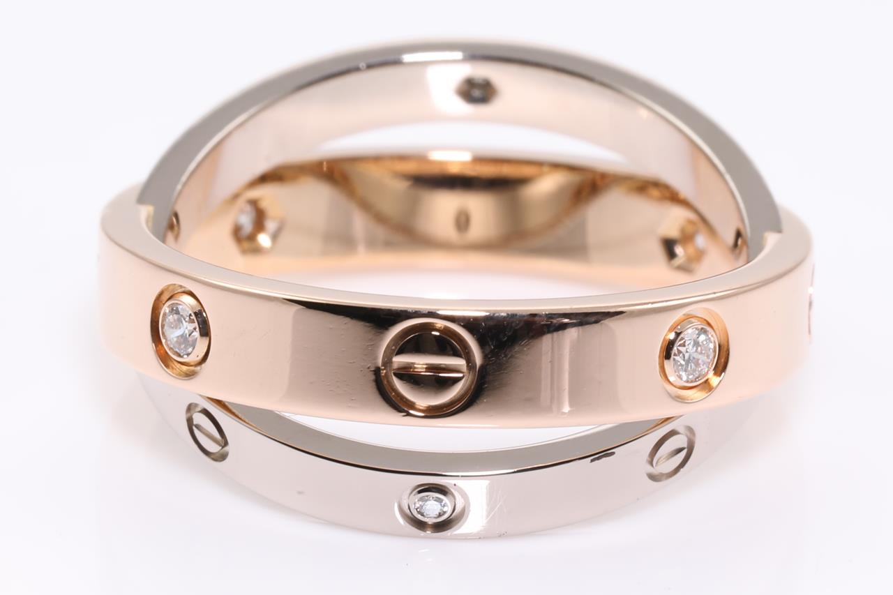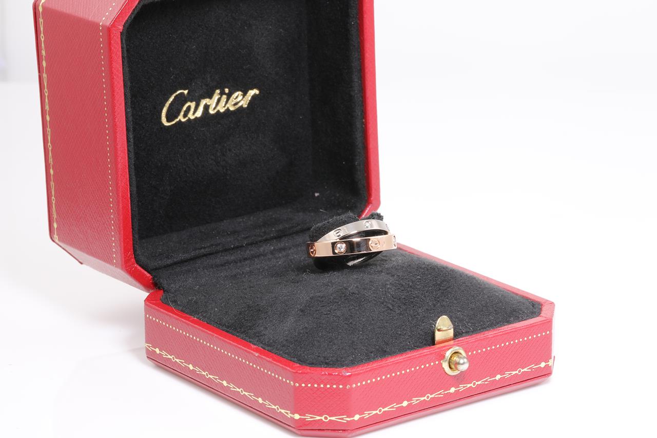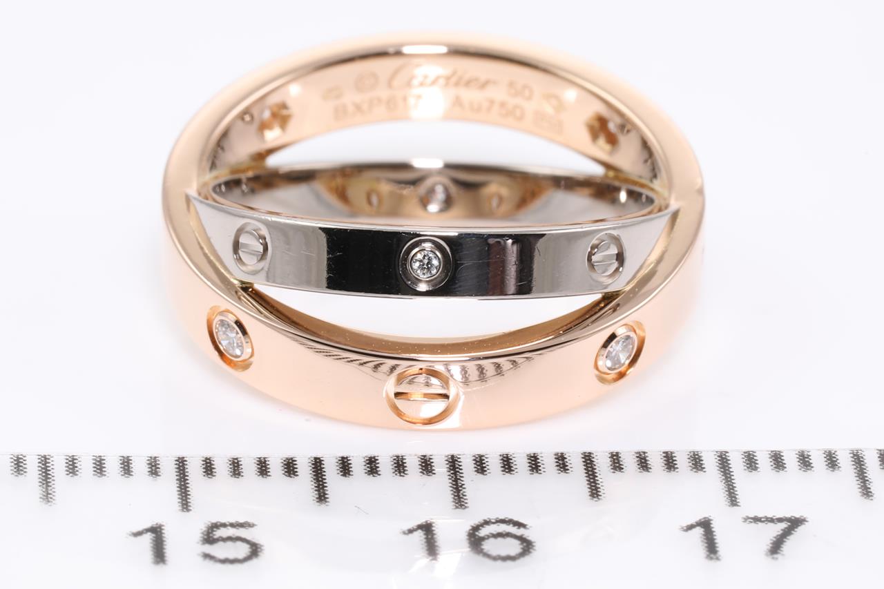 Cartier Be Love Diamond ring with Diamonds totalling 0.07cts. 18ct rose & white gold. Ref# BXP617. Cartier stamped size 50 - ring resizing is not recommended. Weight: 6.7g. With Cartier box. With certificate #414557. (Pre-owned)