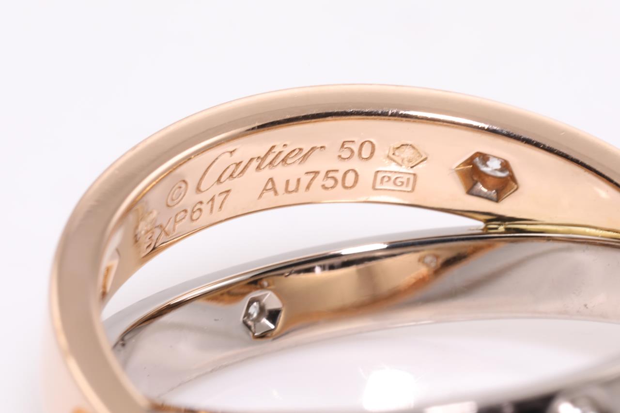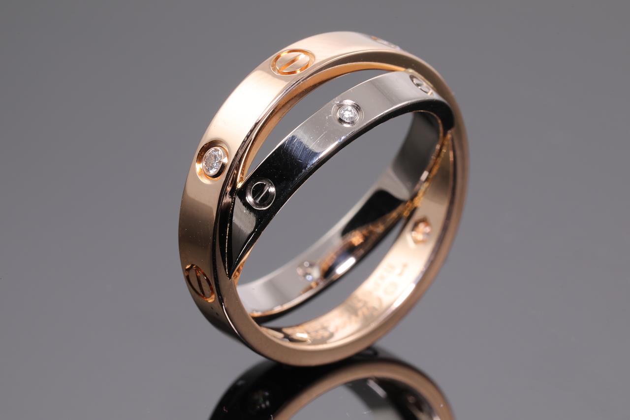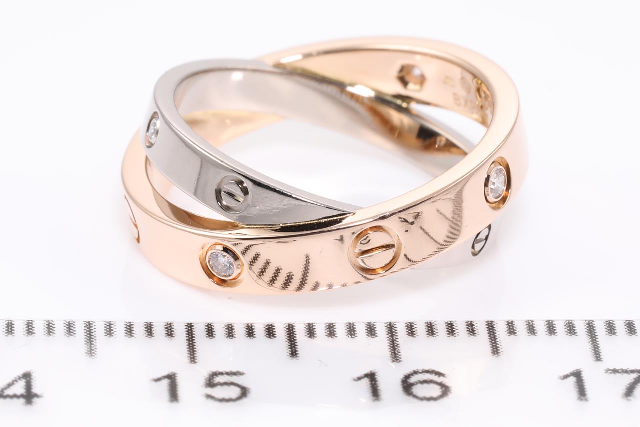 Cartier Be Love Diamond ring with Diamonds totalling 0.07cts. 18ct rose & white gold. Ref# BXP617. Cartier stamped size 50 - ring resizing is not recommended. Weight: 6.7g. With Cartier box. With certificate #414557. (Pre-owned)