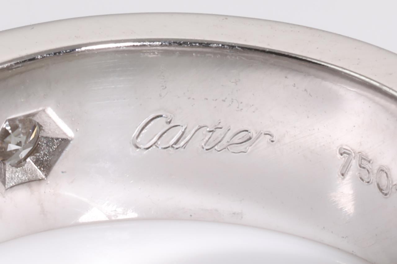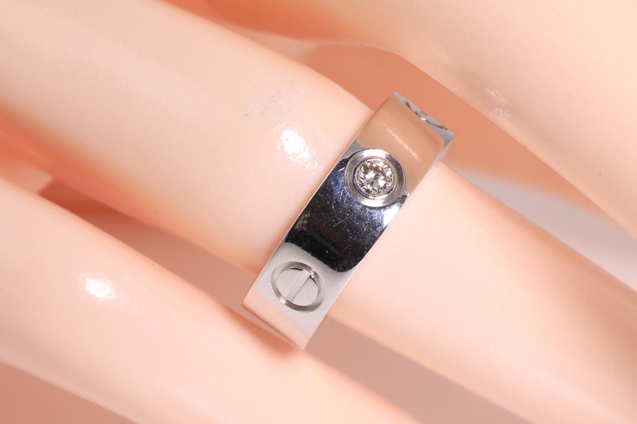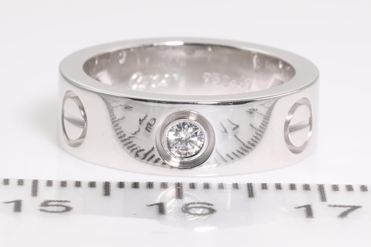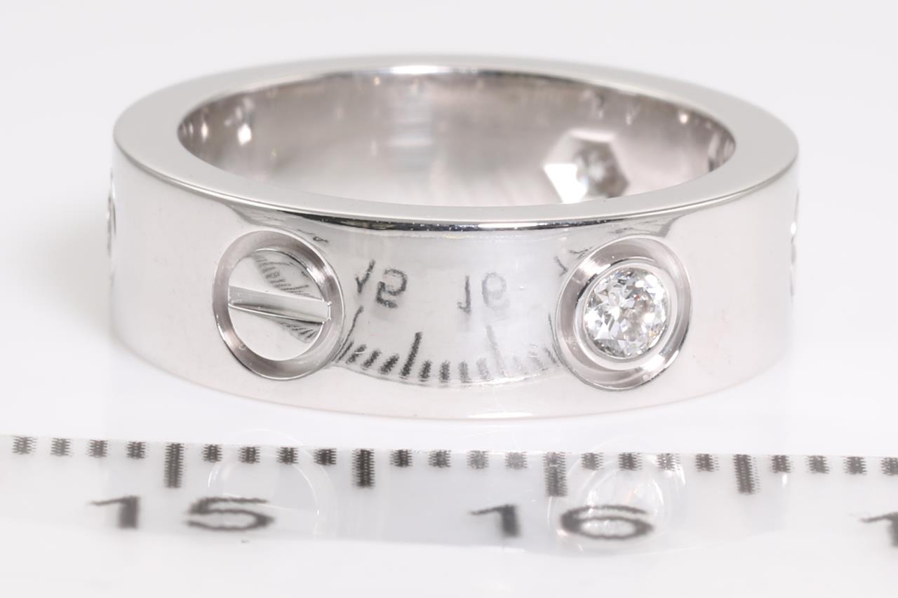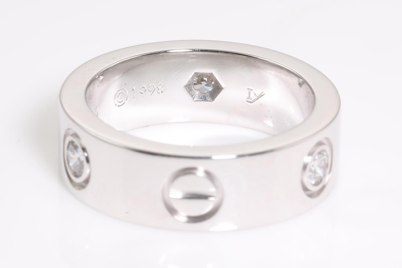 Cartier Love ring with 3 round Diamonds totalling 0.22cts (Estimated grading: F VS). 18ct white gold. Circa 1998. Cartier stamped size 47, H1/2 - ring resizing is not recommended. Weight: 8.3g. With certificate #414597. (Pre-owned)