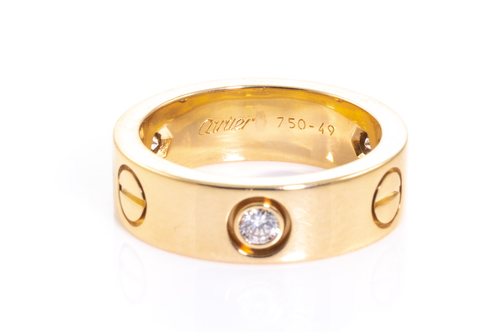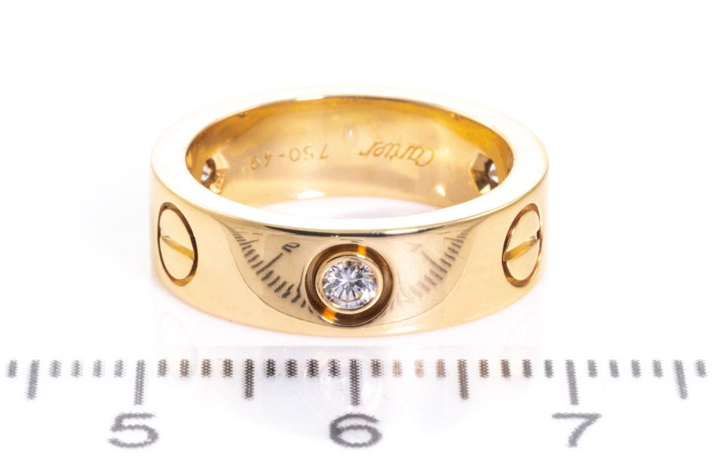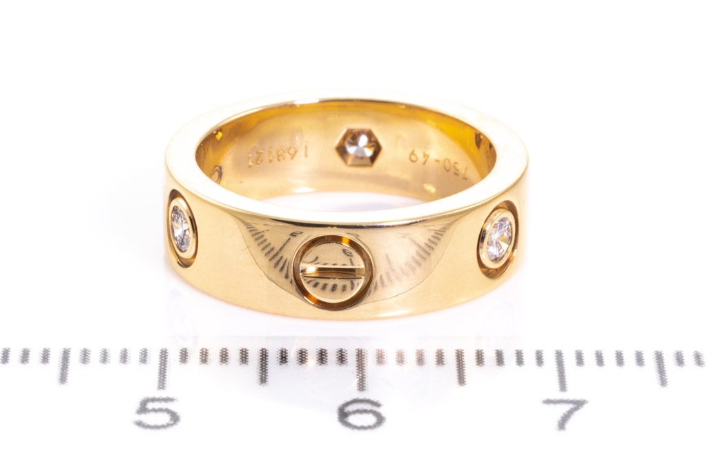 Cartier Love Diamond ring with 3 round Diamonds totalling 0.21cts. 18ct yellow gold. Circa: 1998. Cartier stamped size 49, J - ring resizing is not recommended. Width: 5.5mm. Weight: 8.4g. With Cartier box. (Pre-owned)