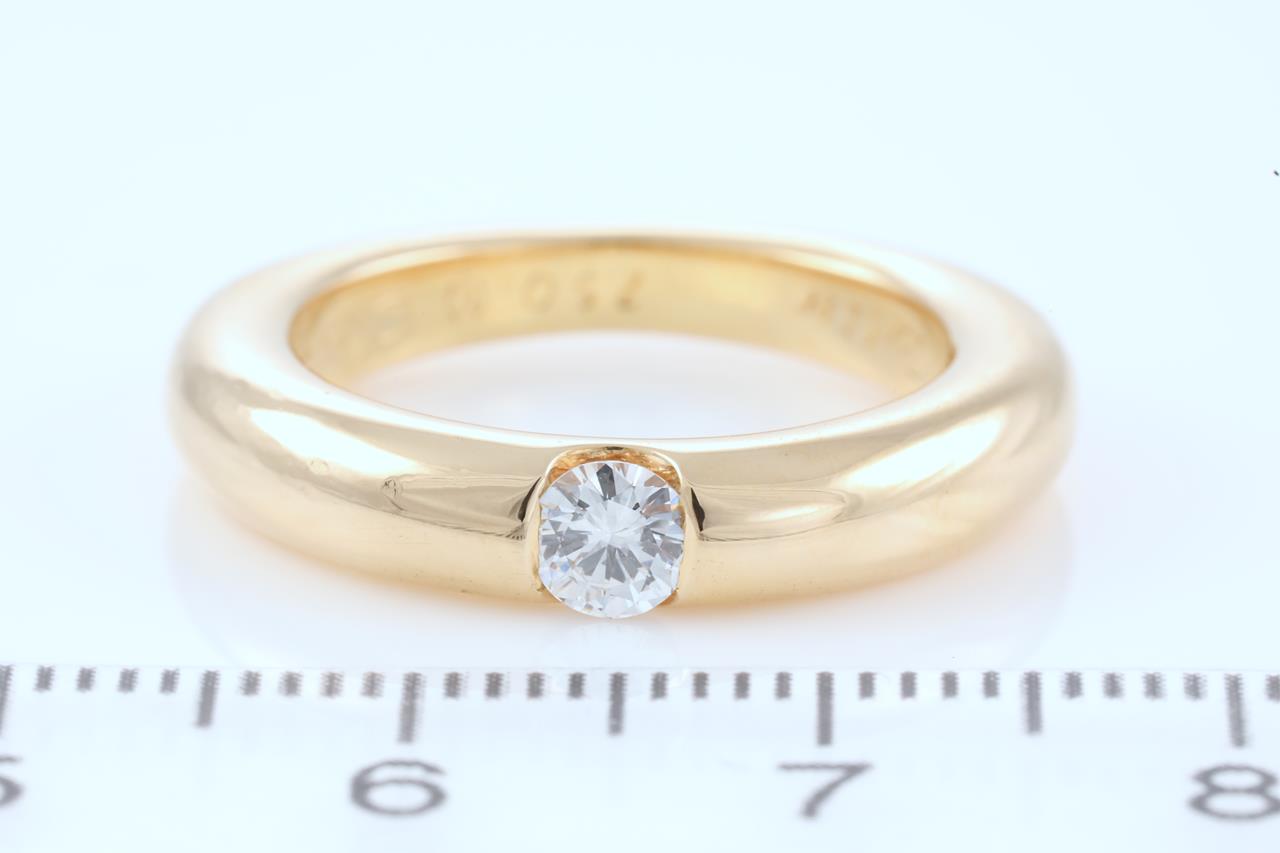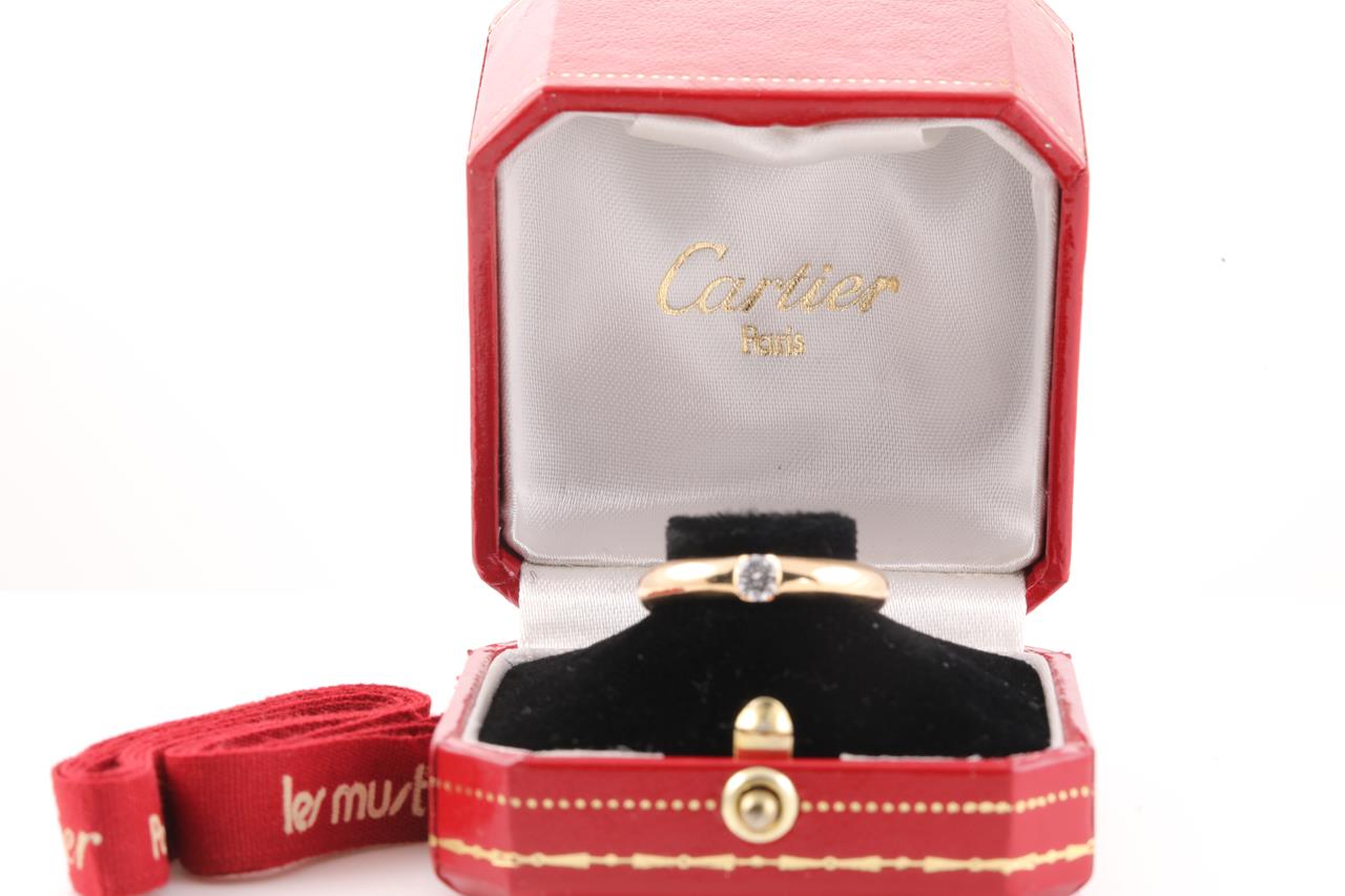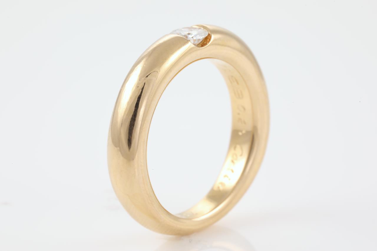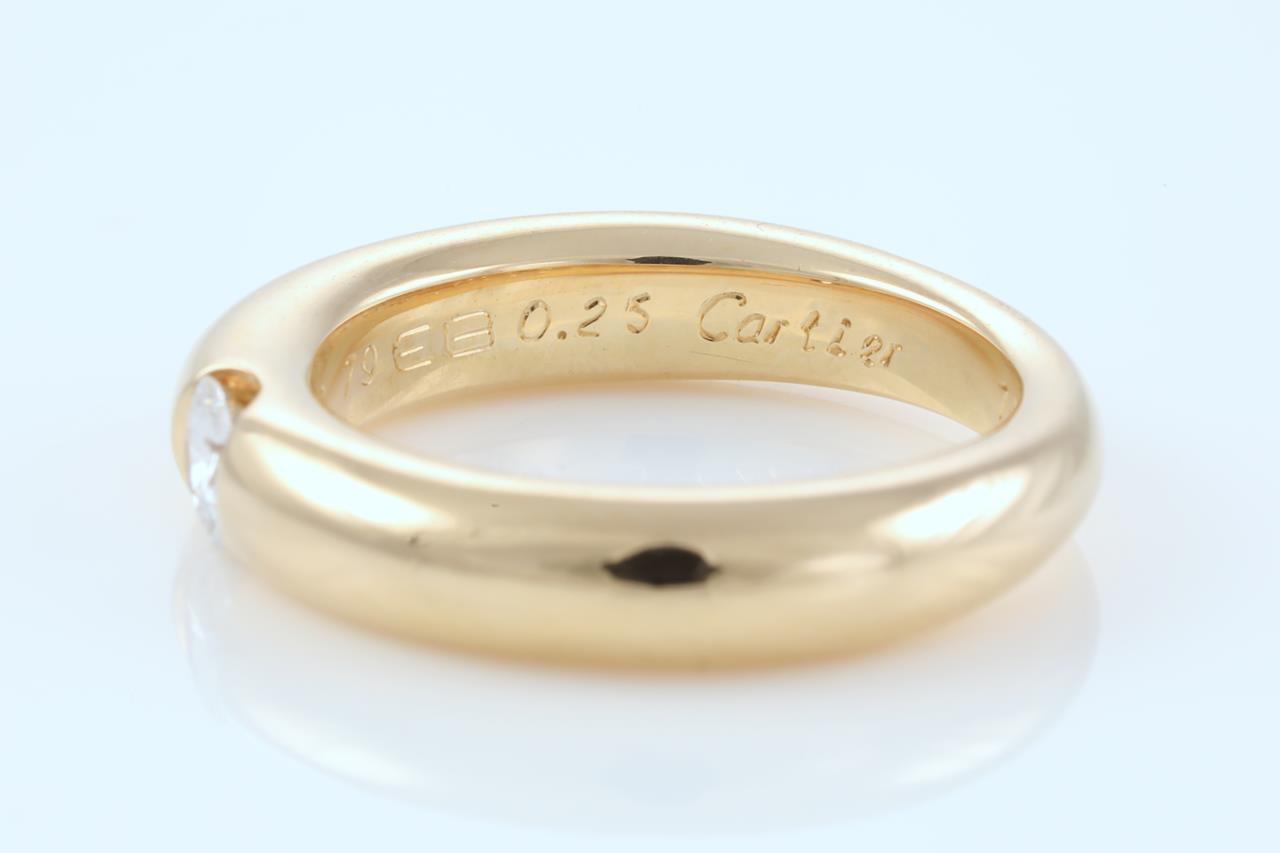 Cartier ring with a round Diamond of 0.25ct (Estimated grading: F-G VS). 18ct yellow gold. Cartier stamped size 53, ring size M1/2 - ring resizing is not recommended. Weight: 9.9g. With Cartier certificate dated 18/03/1994 and Cartier box. (Pre-owned)