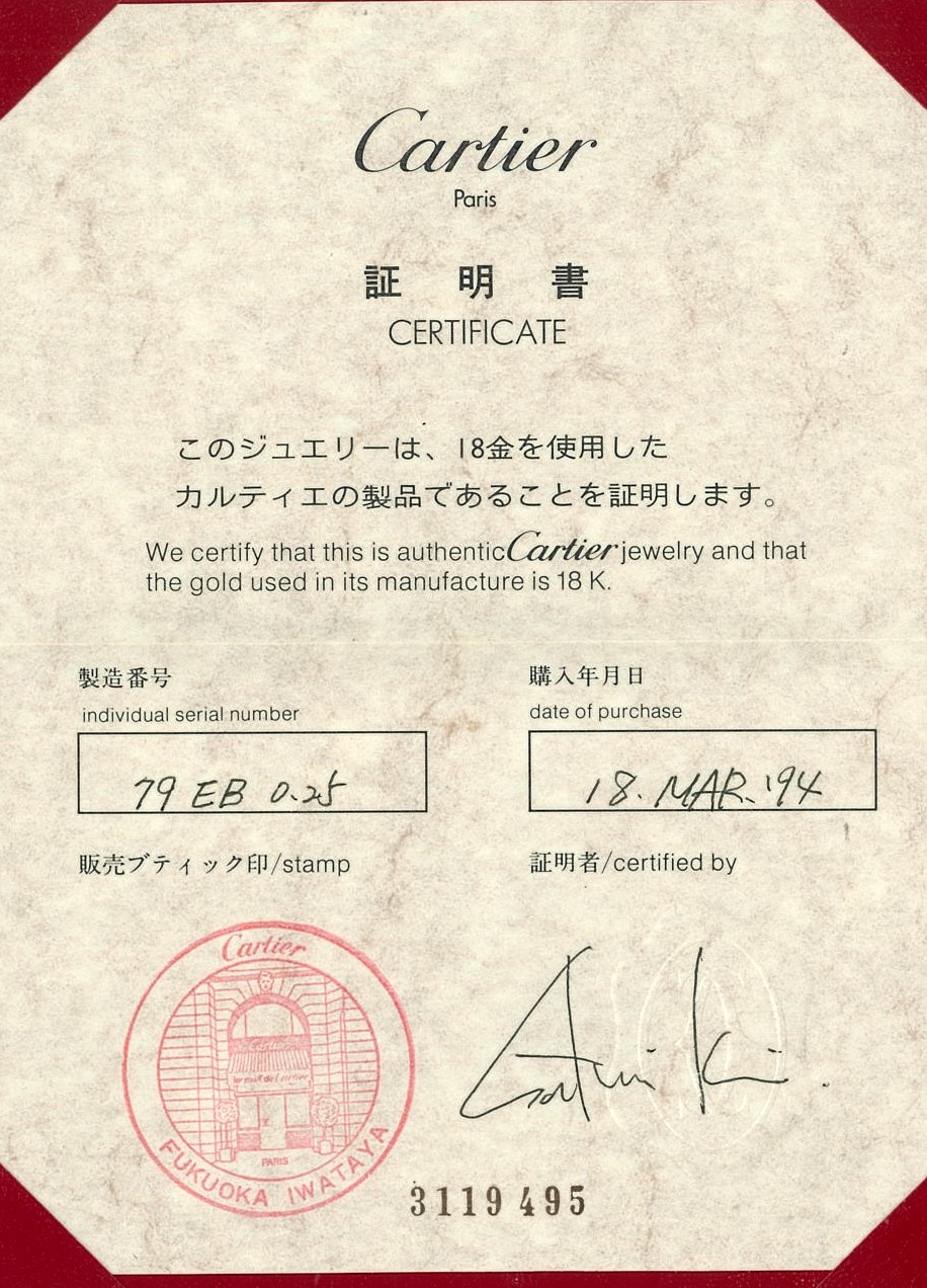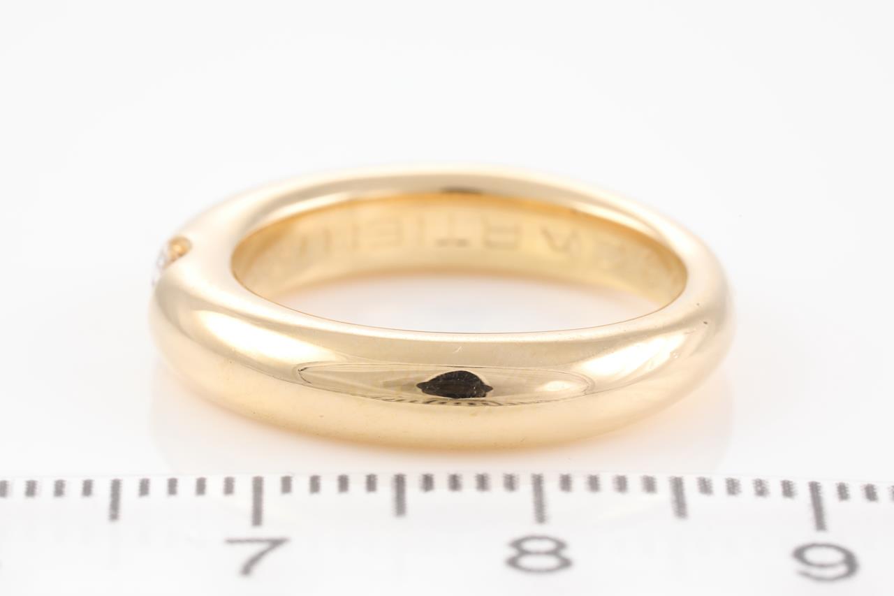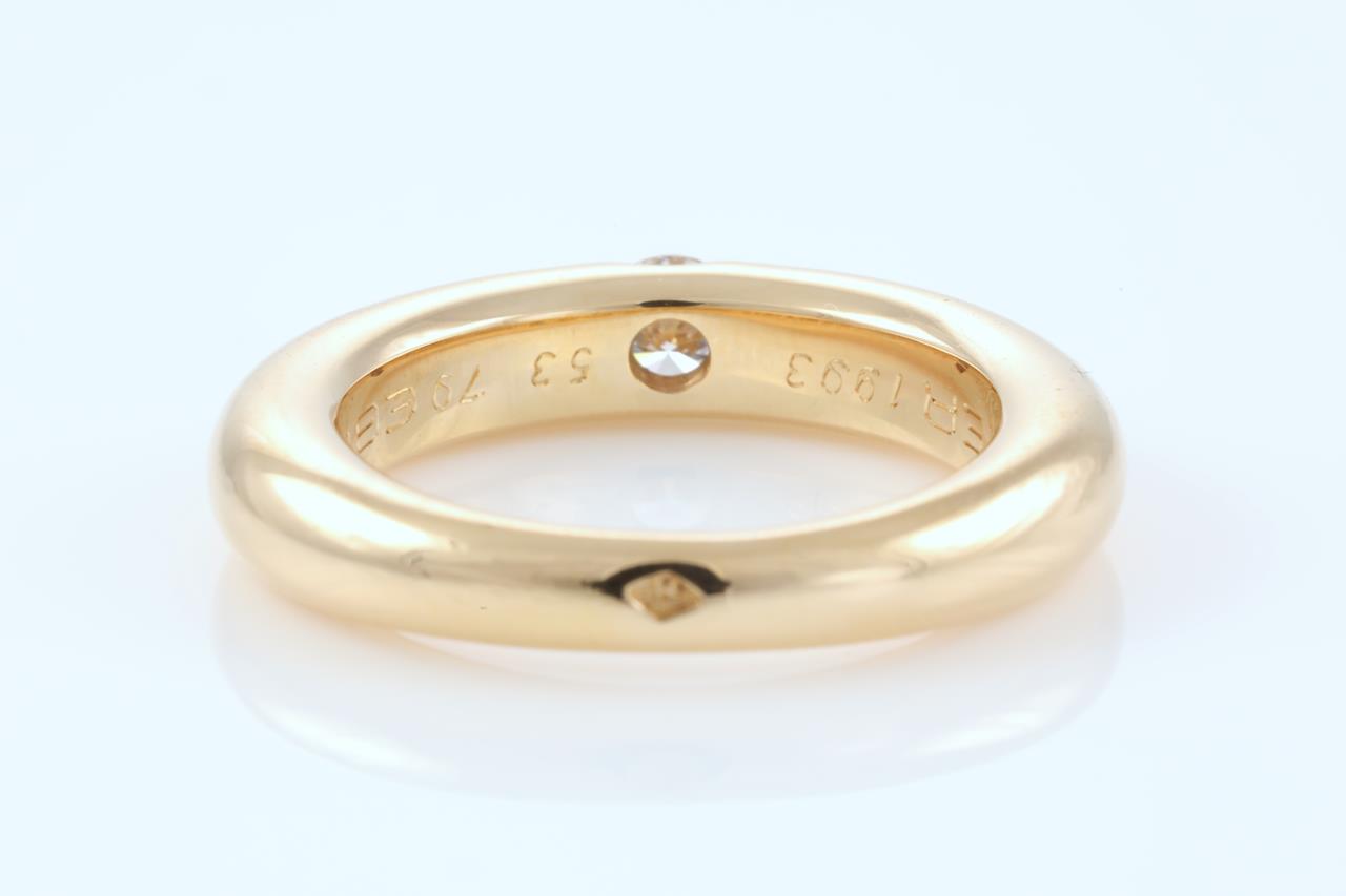 Cartier ring with a round Diamond of 0.25ct (Estimated grading: F-G VS). 18ct yellow gold. Cartier stamped size 53, ring size M1/2 - ring resizing is not recommended. Weight: 9.9g. With Cartier certificate dated 18/03/1994 and Cartier box. (Pre-owned)