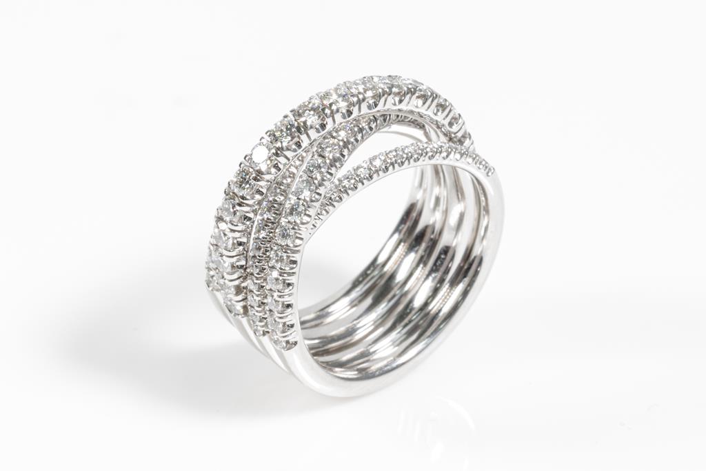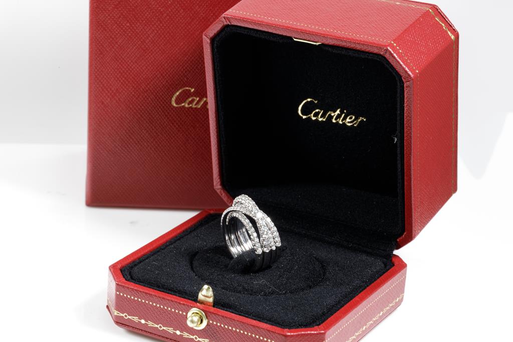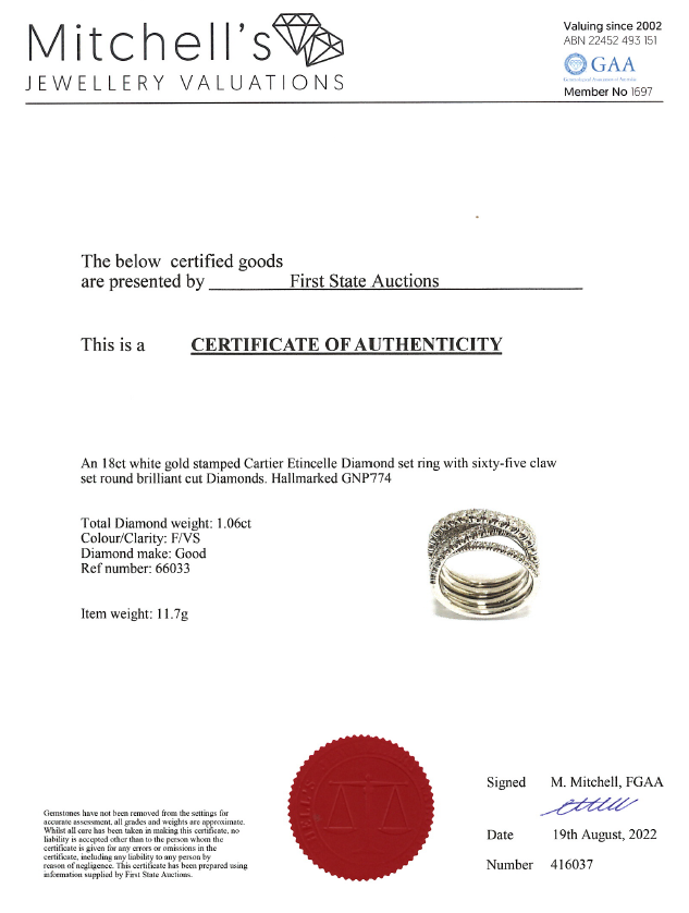 Etincelle De Cartier Diamond ring with round Diamonds totalling approximately 1.06cts (Estimated grading: F VS). 18ct white gold. Cartier stamped ring size 49, J1/2 - Ring resizing not recommended. Weight: 11.7g. With Cartier box. With Certificate #416037. (Pre-owned)