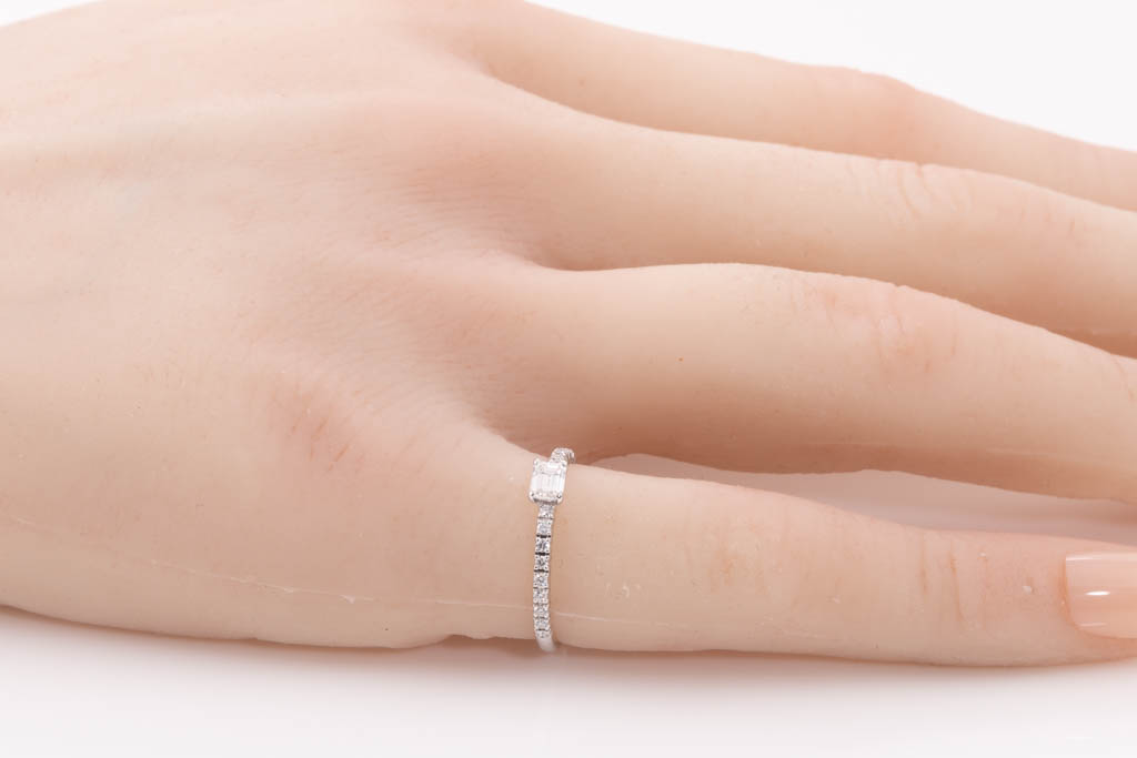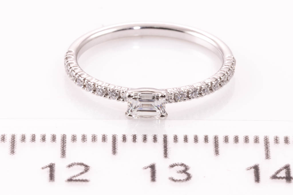 Cartier Etincelle Eternity Ring with centre emerald cut Diamond of 0.18ct and round Diamonds totalling 0.10cts. Platinum. Cartier stamped size 46, G1/2 - ring resizing is not recommended. Weight: 1.5g. With Cartier Certificate dated 18/04/2019. (Pre-owned)