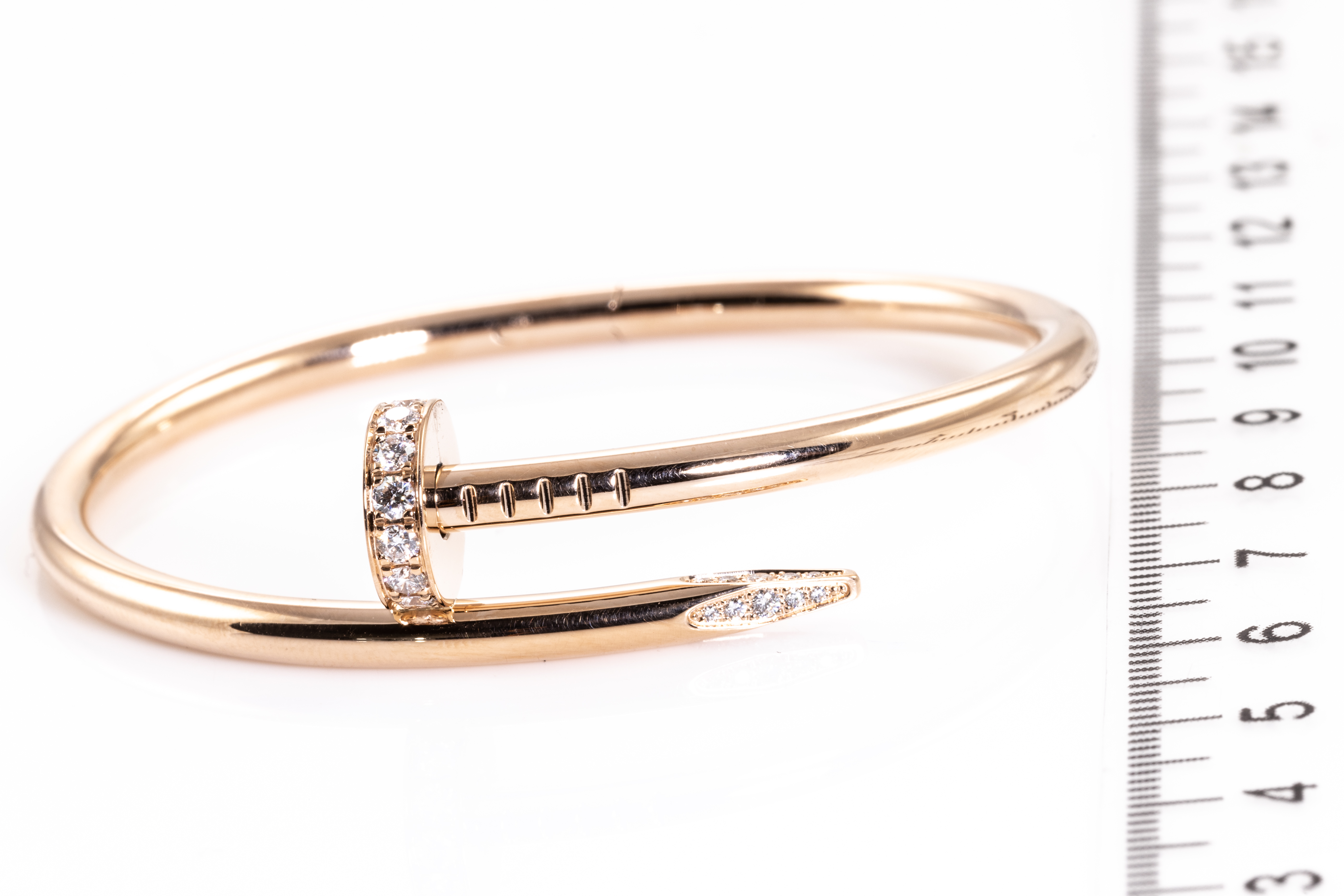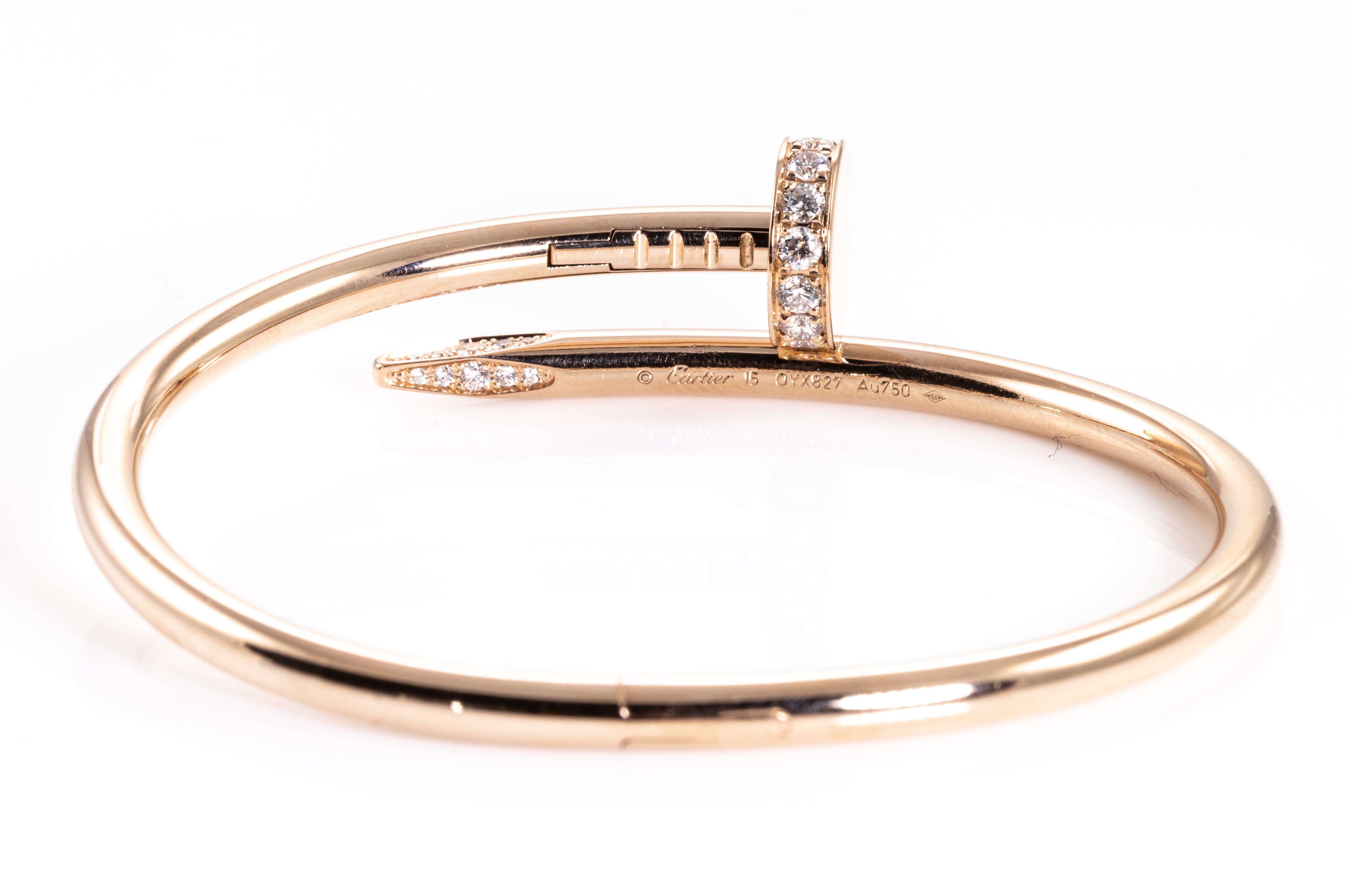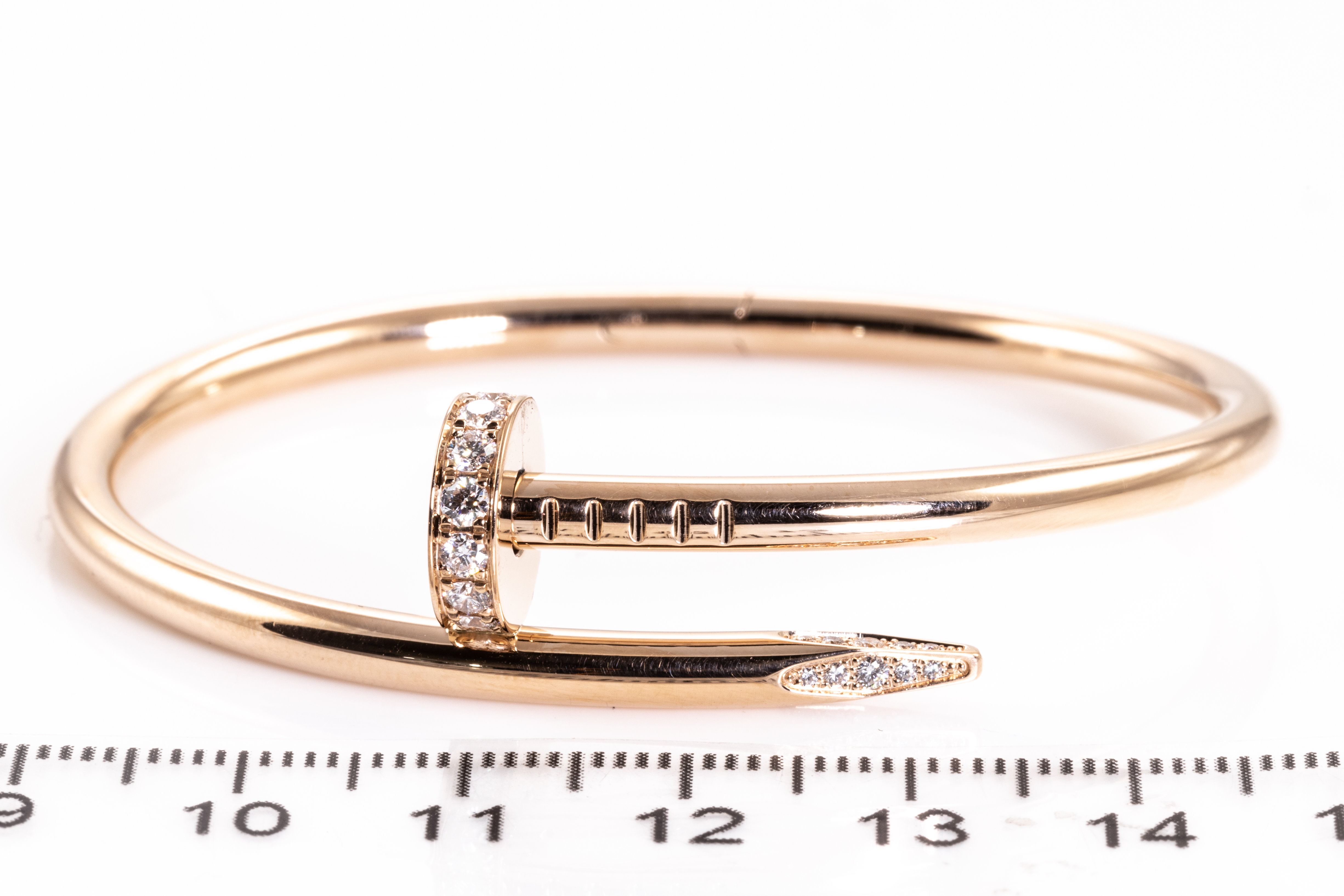 Cartier Juste un Clou bracelet with round Diamonds totalling 0.59cts (Estimated grading: F-G VS). Cartier stamped size 15cm. 18ct rose gold. With Cartier purchase invoice & Cartier Certificate both dated 16/04/2022 and Cartier box with Cartier gift bag. Weight: 28.8g. (Pre-owned)