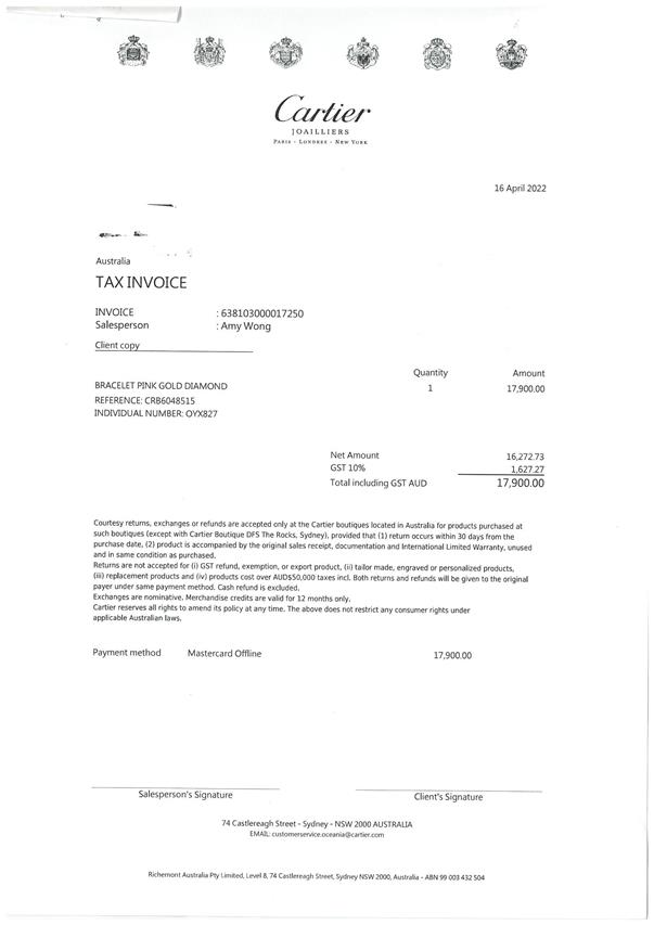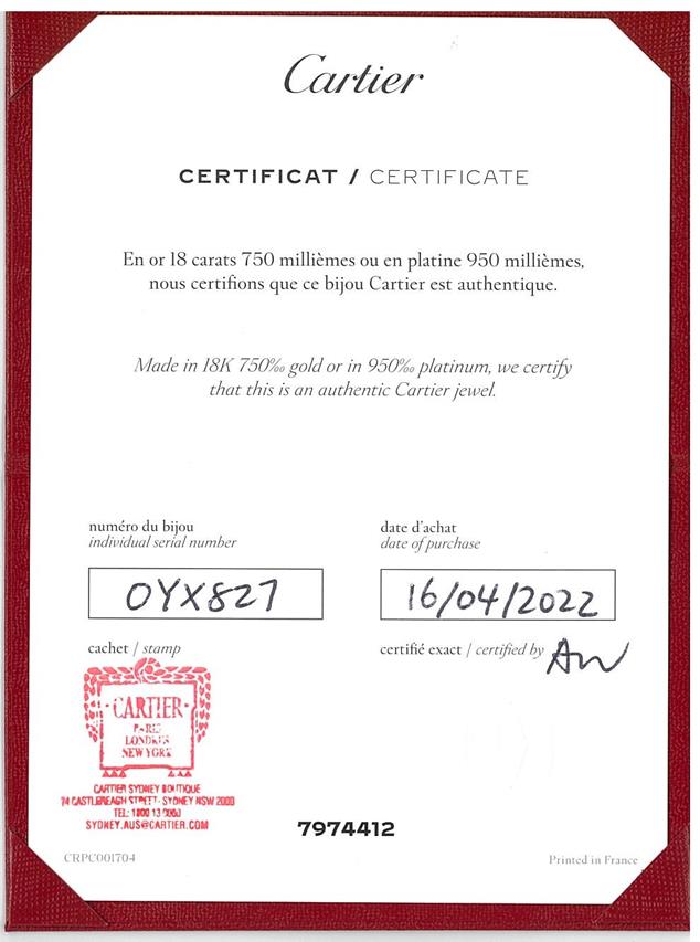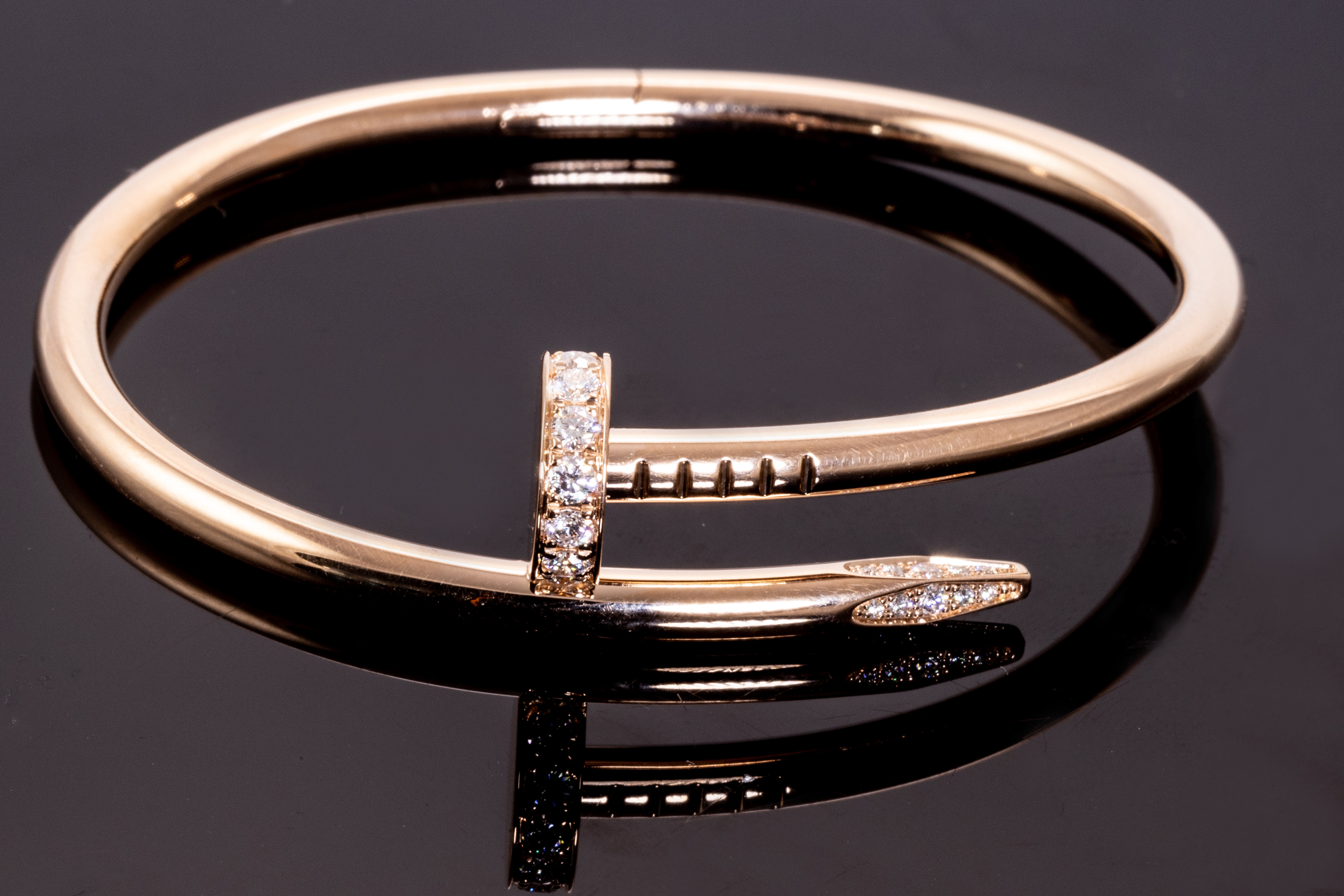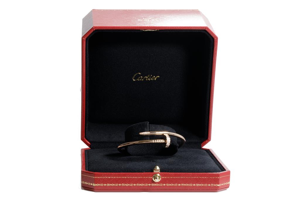 Cartier Juste un Clou bracelet with round Diamonds totalling 0.59cts (Estimated grading: F-G VS). Cartier stamped size 15cm. 18ct rose gold. With Cartier purchase invoice & Cartier Certificate both dated 16/04/2022 and Cartier box with Cartier gift bag. Weight: 28.8g. (Pre-owned)
