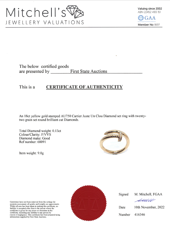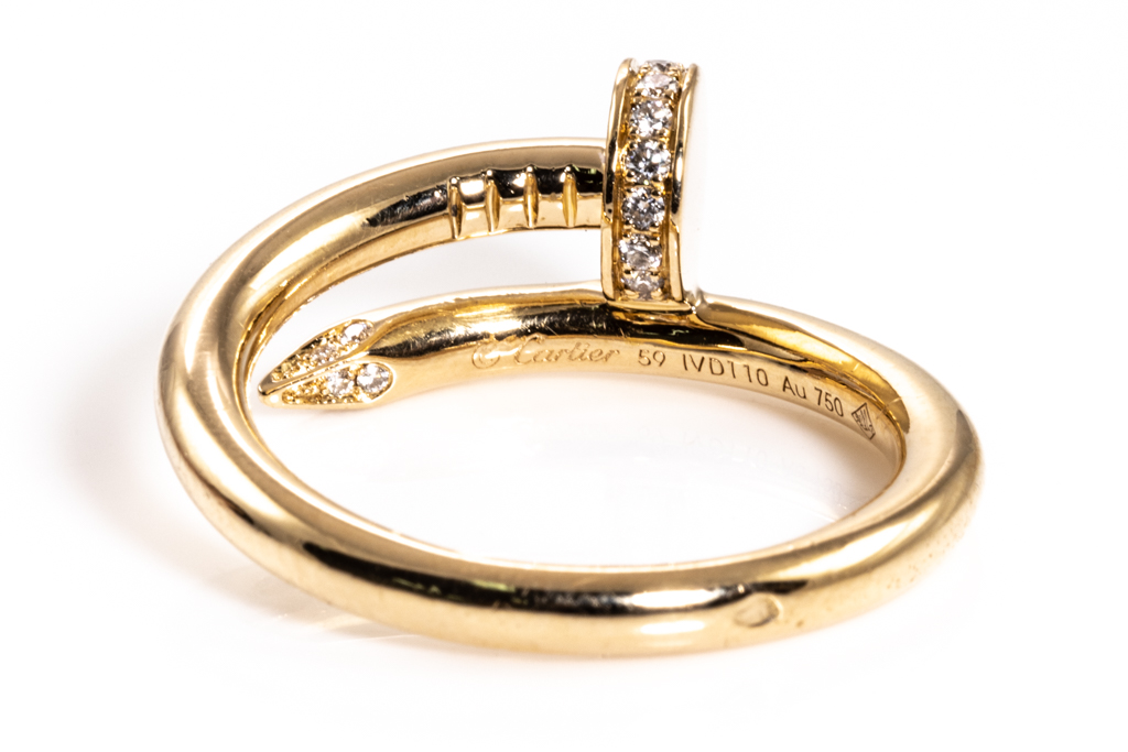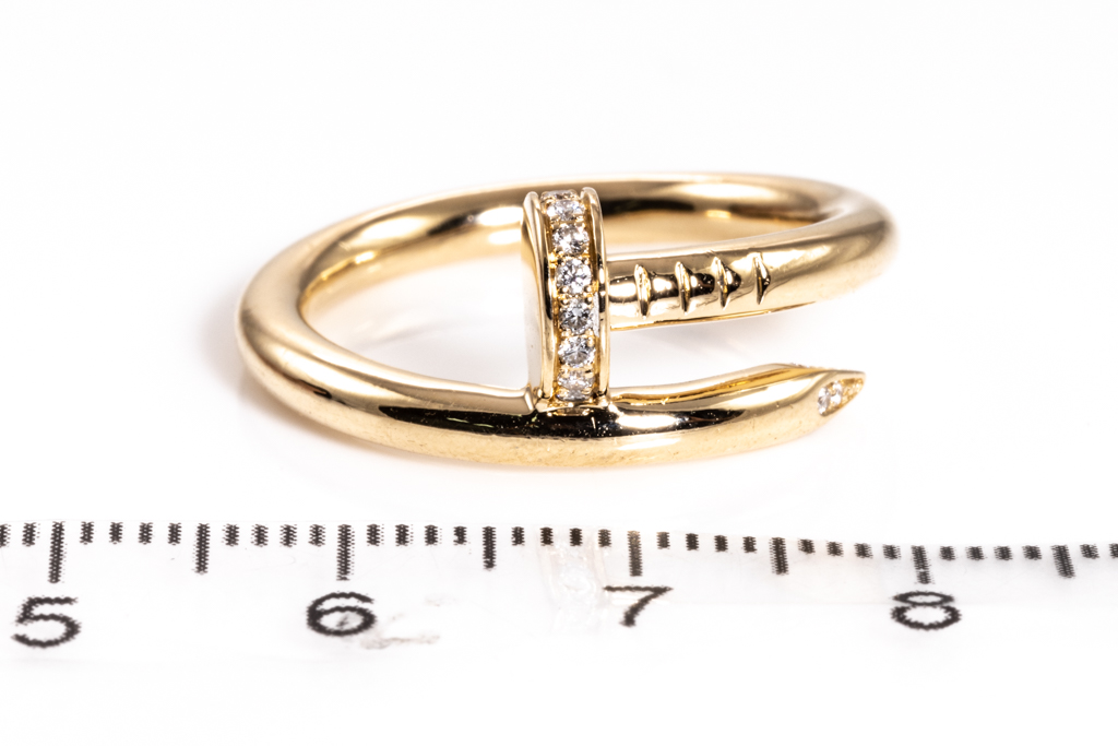 Cartier Juste un Clou Diamond ring with 22 round Diamonds totalling 0.13cts. 18ct yellow gold. Cartier stamped size 59 - ring resizing not recommended. Weight: 9.0g. With Certificate #416346. (Pre-owned)