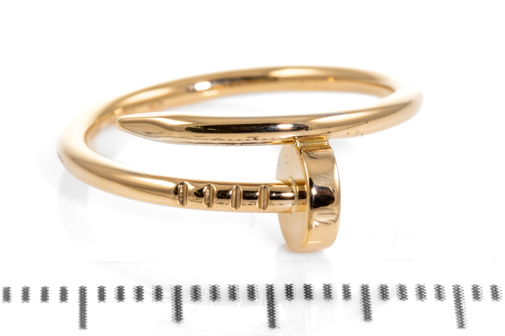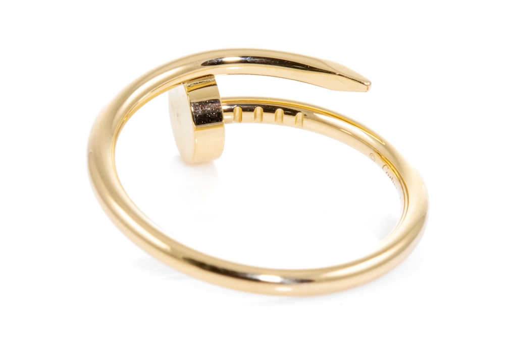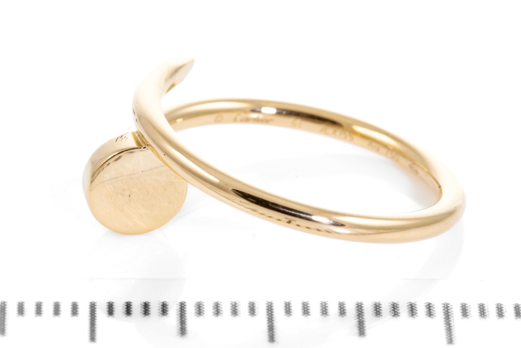 Cartier Juste un Clou SM ring. 18ct yellow gold. Cartier Stamped size 51 - ring resizing is not recommended. Width: 1.8mm. Weight: 3.3g. With Cartier certificate dated 19/12/2016. (Pre-owned)