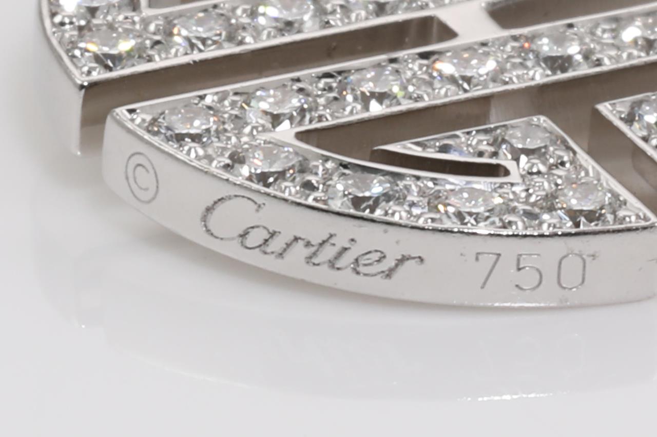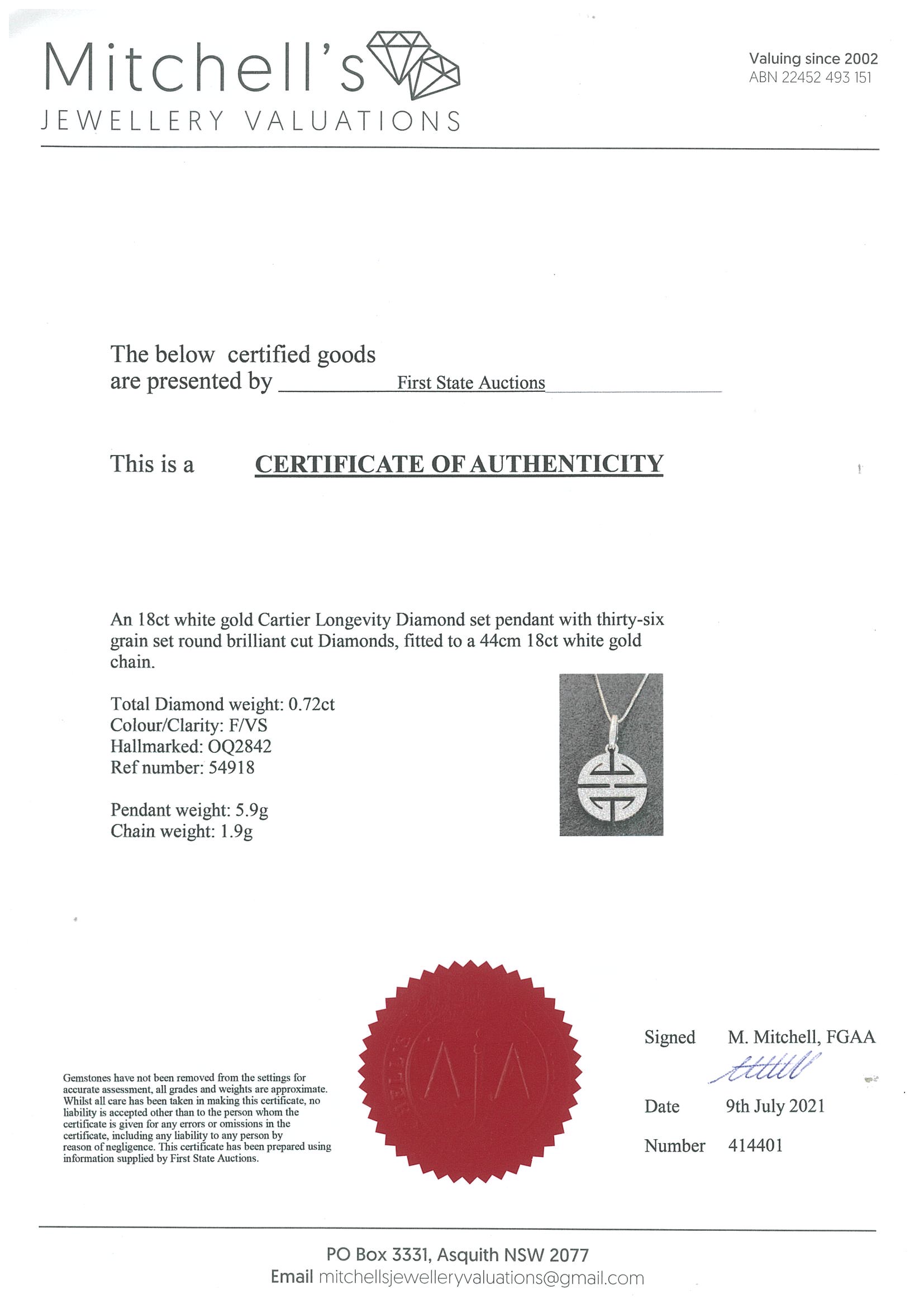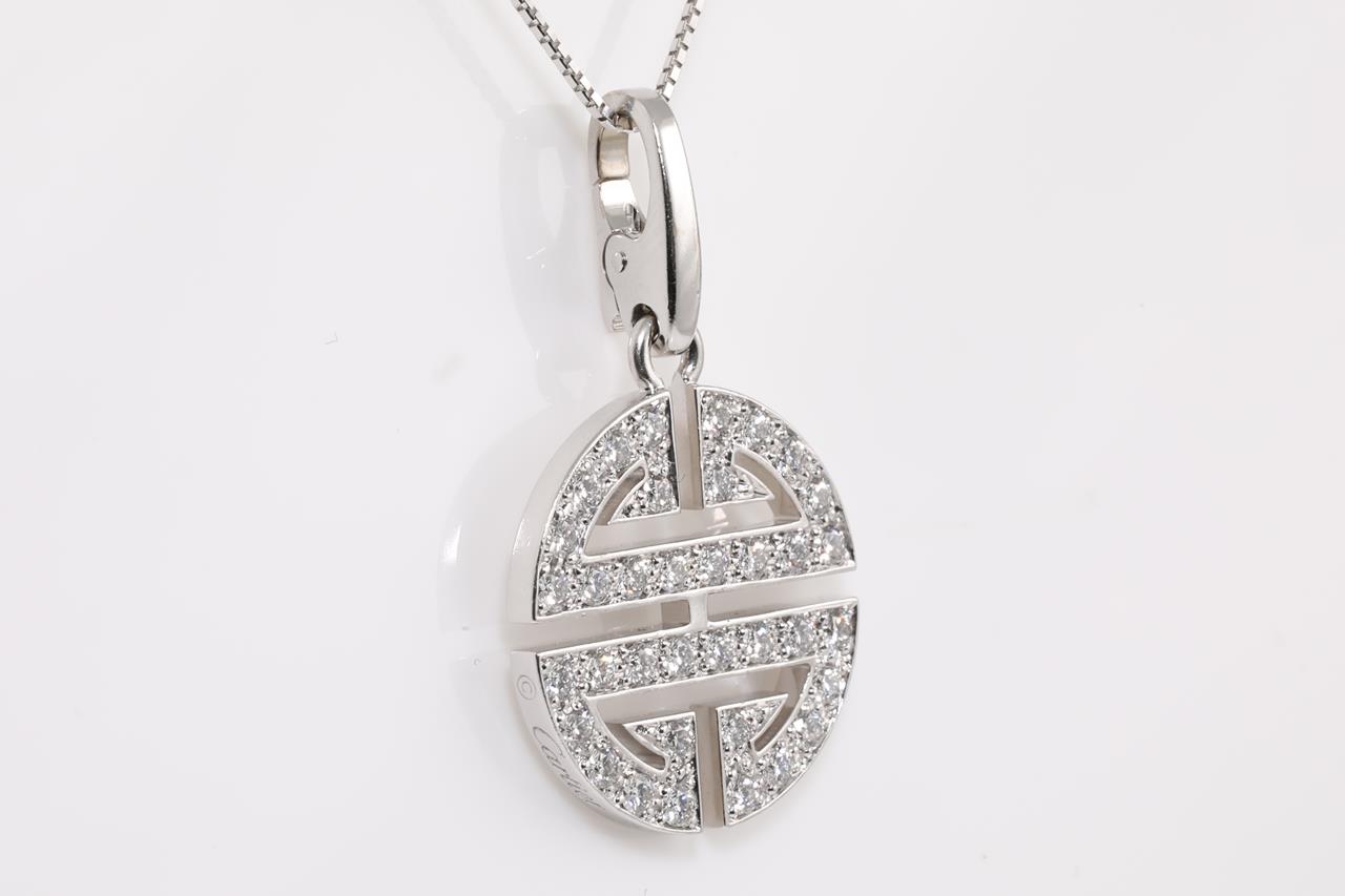 Cartier Longevity Vintage Diamond pendant charm with Diamonds totalling approximately 0.72cts (Estimated grading: F VS). 18ct white gold with 44cm adjustable unbranded chain. Ref# OQ2842. Circa 2000-2009. With certificate #414401. Weight: 7.8g. Pre-owned)