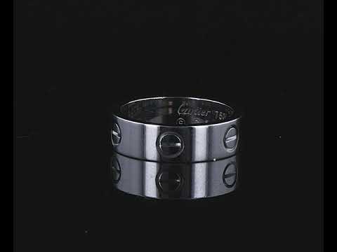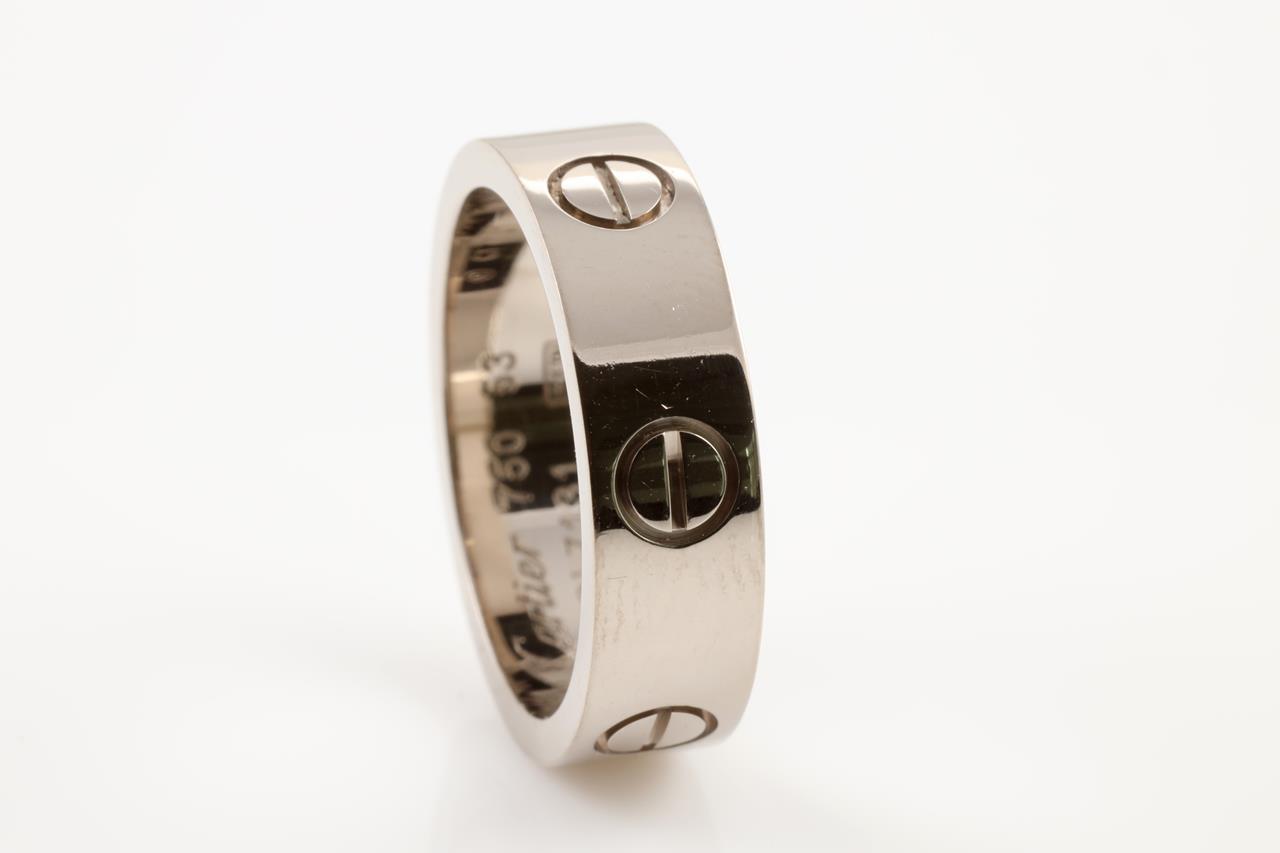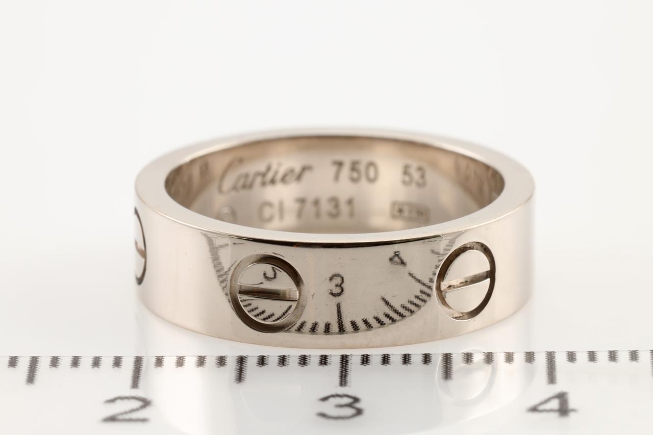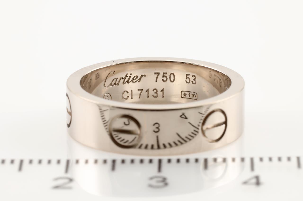 Cartier Love band. 18ct white gold. Ring size M1/2 - Ring resizing is not recommended. Cartier stamped size: 53. Ref #C17131. Weight: 8.0g (Pre-owned)