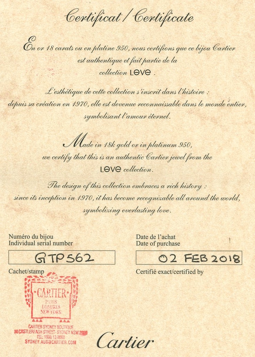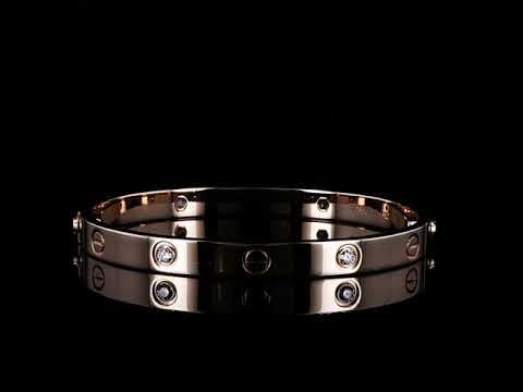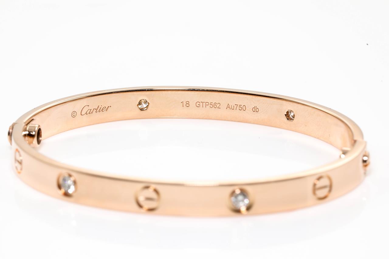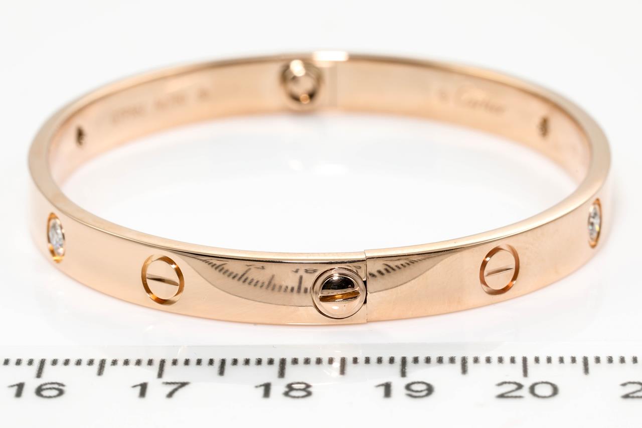 Cartier Love bracelet with 4 round Diamonds totalling 0.42cts (Estimated grading: F VS). 18ct rose gold. Weight 32.1g. Cartier stamped size 18cm. Width 6.1mm. With Cartier authenticity certificate dated 02/02/2018 & valuation. With Cartier screwdriver & pouch. (Pre-owned)