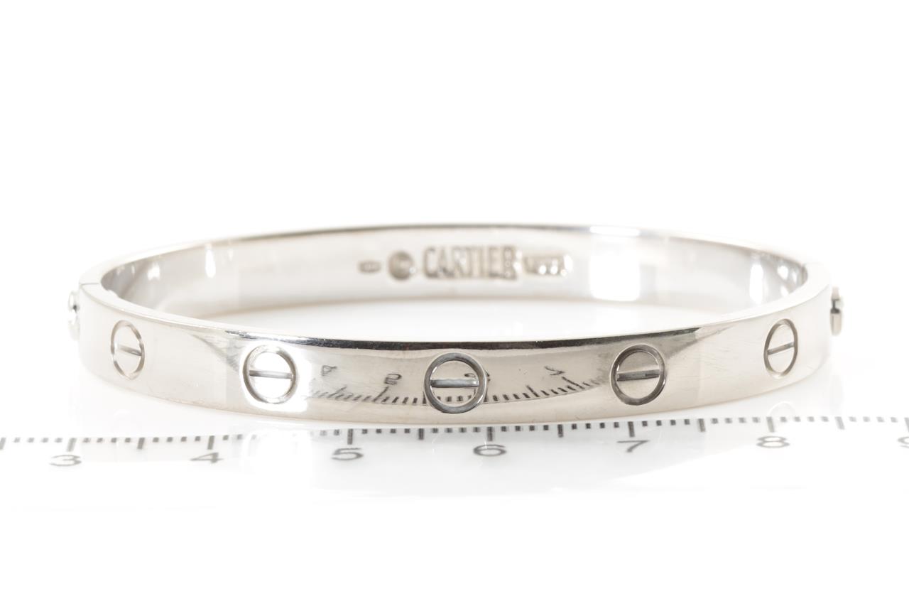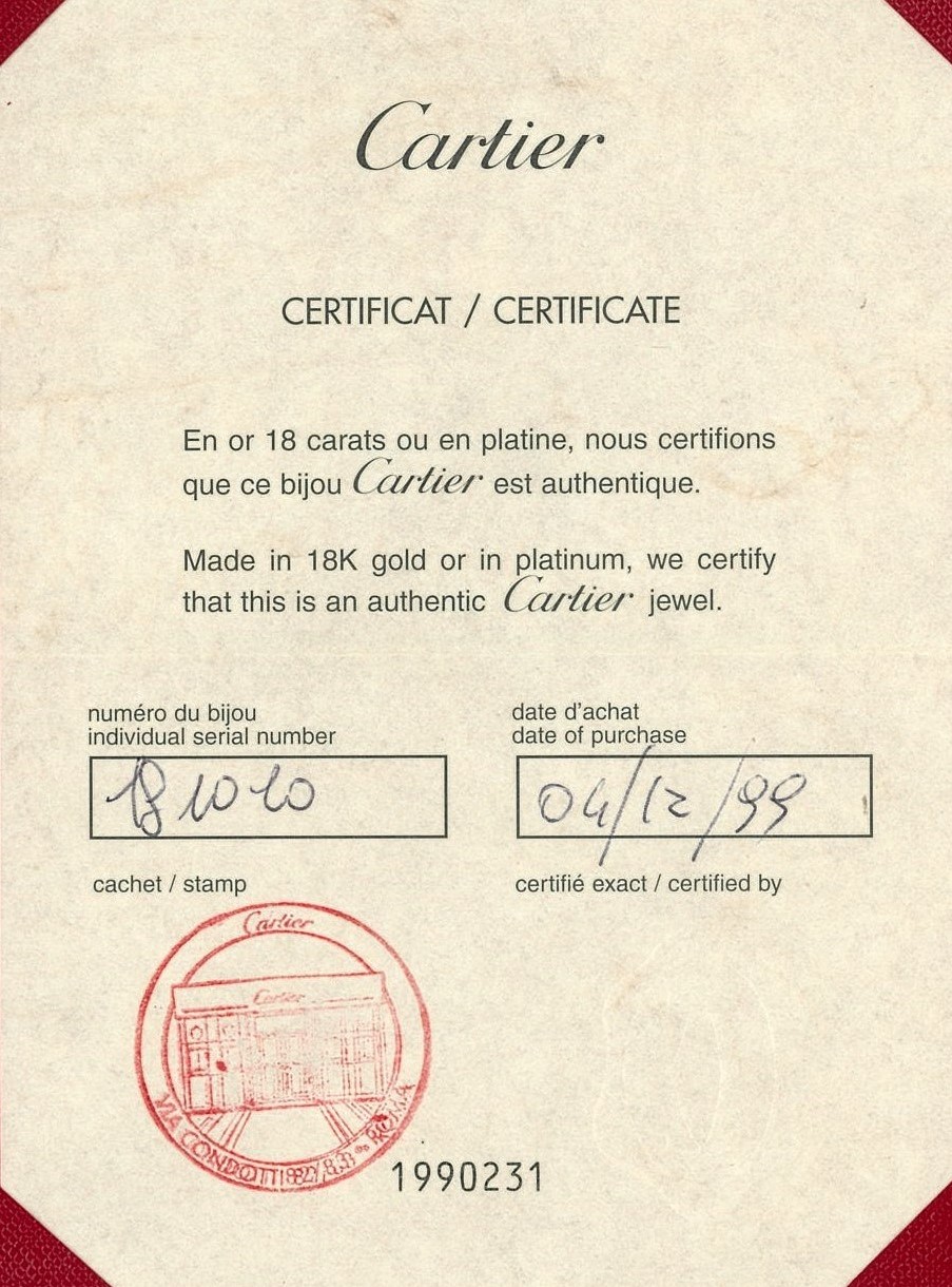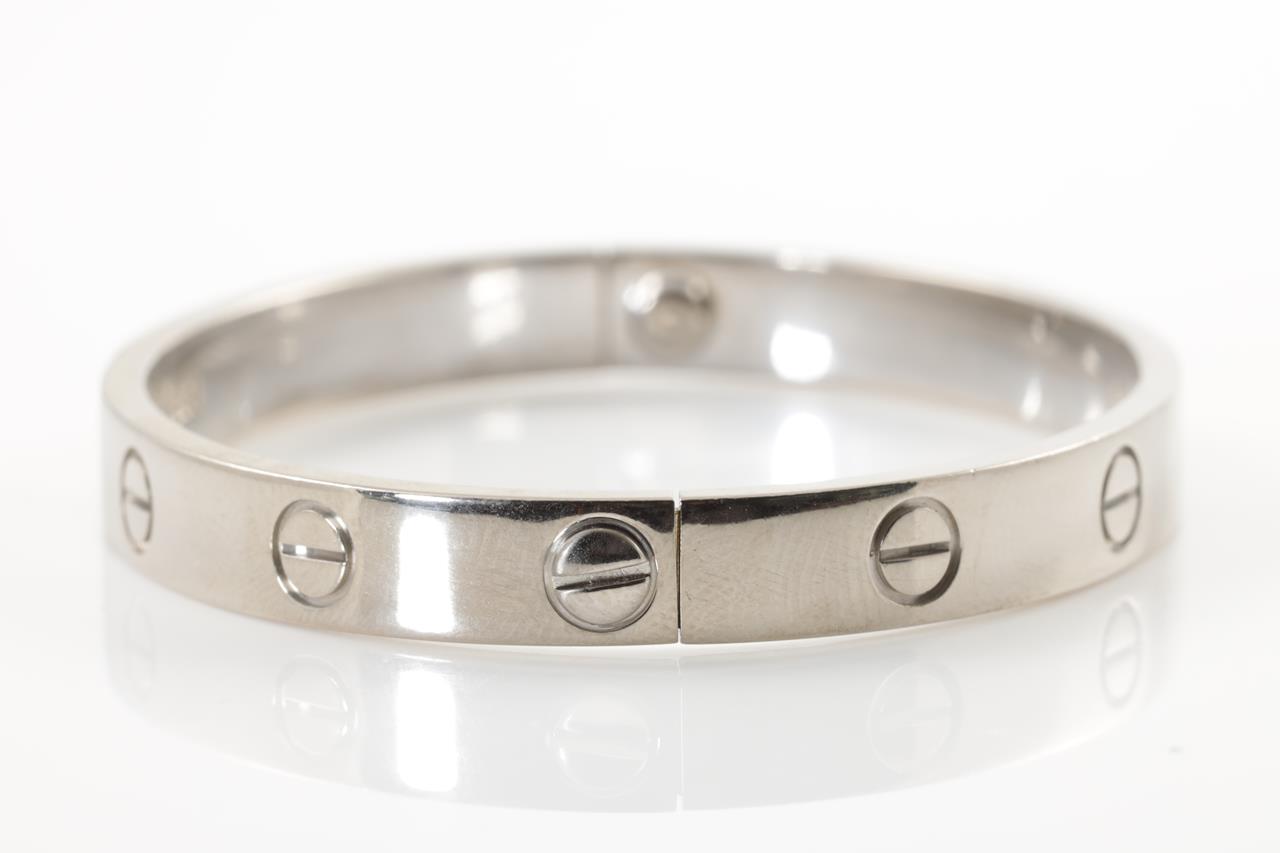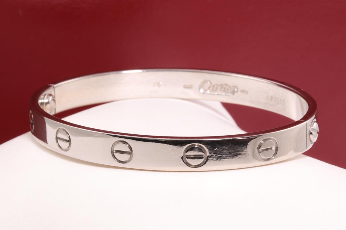 Cartier Love Bracelet of 31.8g. Cartier stamped size 16. 18ct white gold. Ref# I81010. With Cartier certificate dated 04/12/1999 & Cartier screwdriver and Cartier deteriorated box. (Pre-owned)