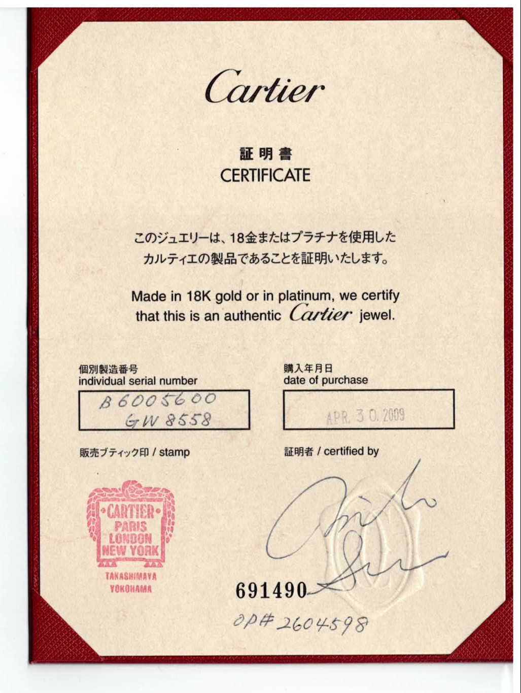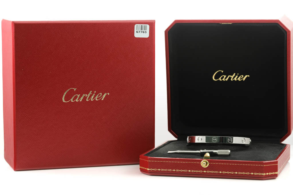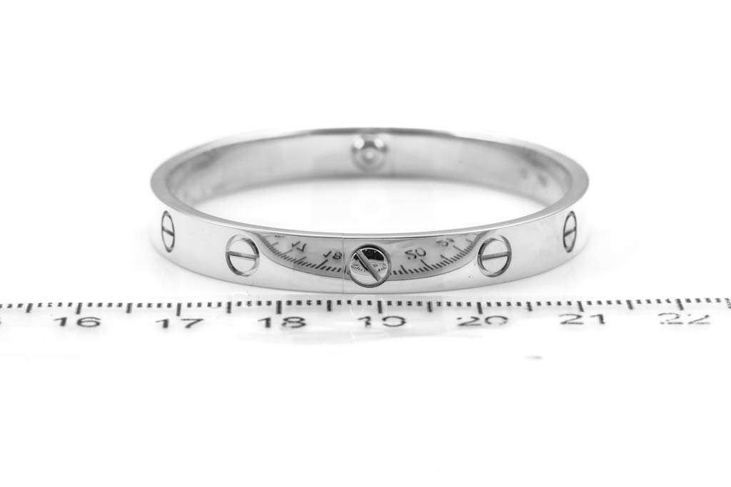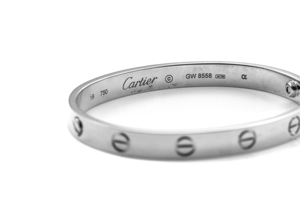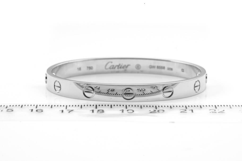 Cartier Love bracelet. 18ct white gold. Cartier stamped size 16. Width: 6.1mm. Weight: 30.2g. With Cartier Certificate dated 30/04/2009, screwdriver and cartier box. (Pre-owned)