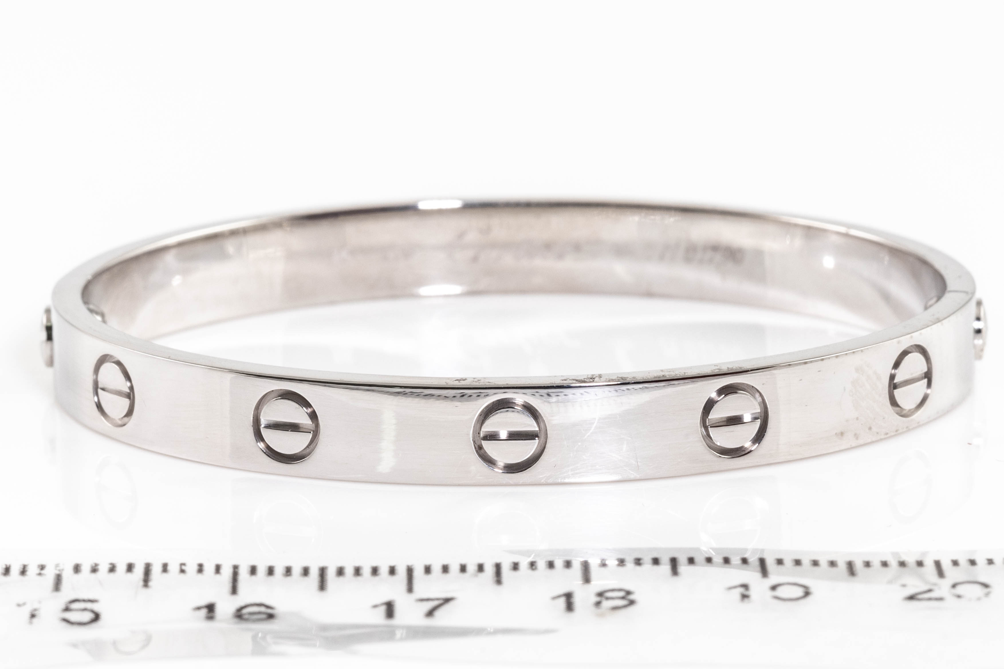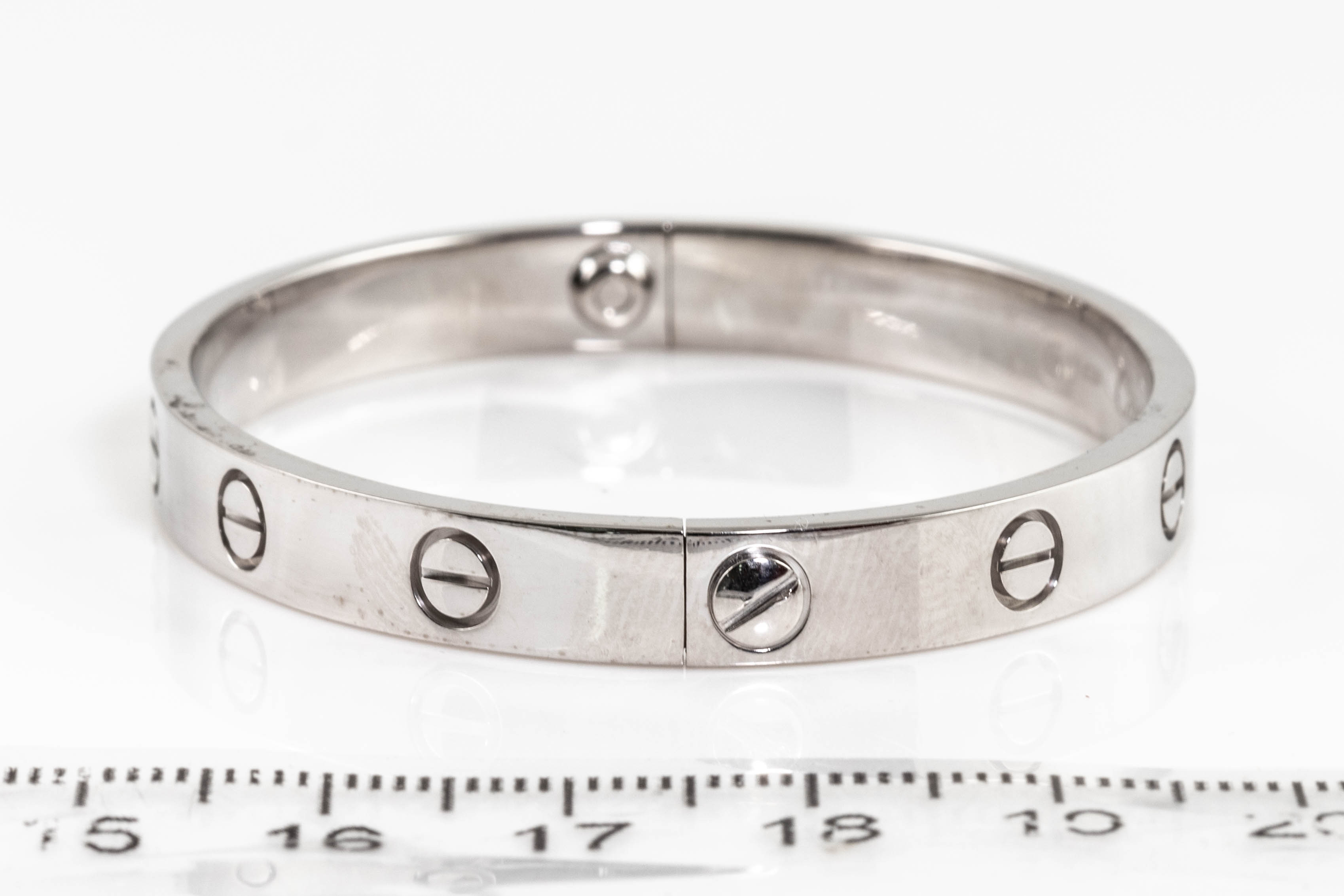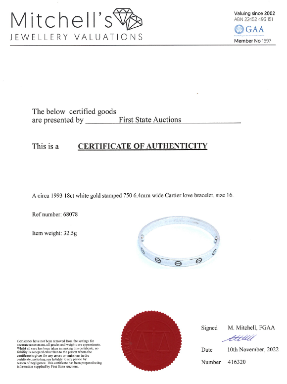 Cartier Love bracelet. 18ct white gold. Cartier stamped size 16. Circa: 1993. Width: 6.4mm. Weight: 32.5g. With screwdriver. With Certificate #416320. (Pre-owned)