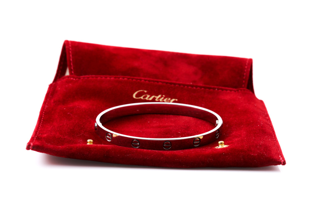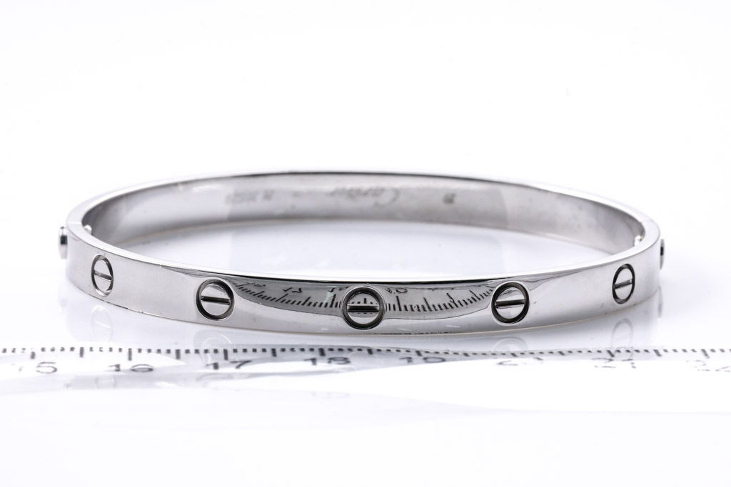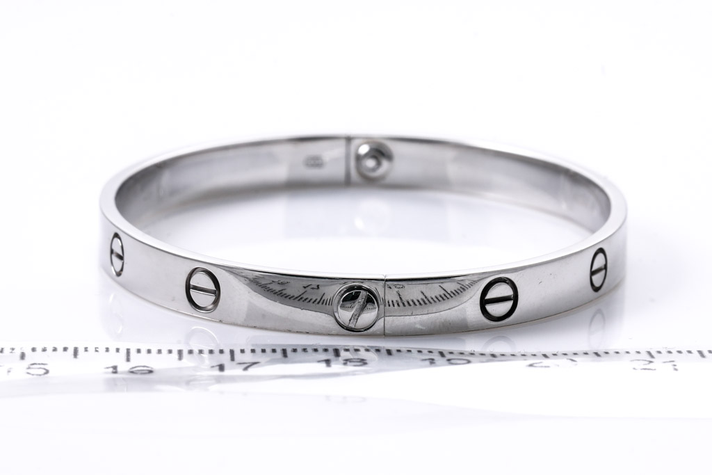 Cartier Love bracelet. 18ct white gold. Cartier stamped size 19. Width: 6.1mm. Weight: 31.1g. With Cartier pouch. With Certificate #416373. (Pre-owned)