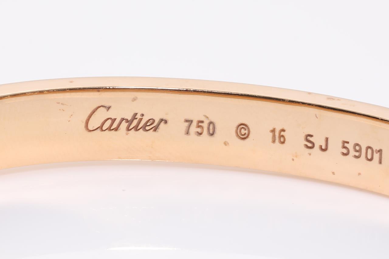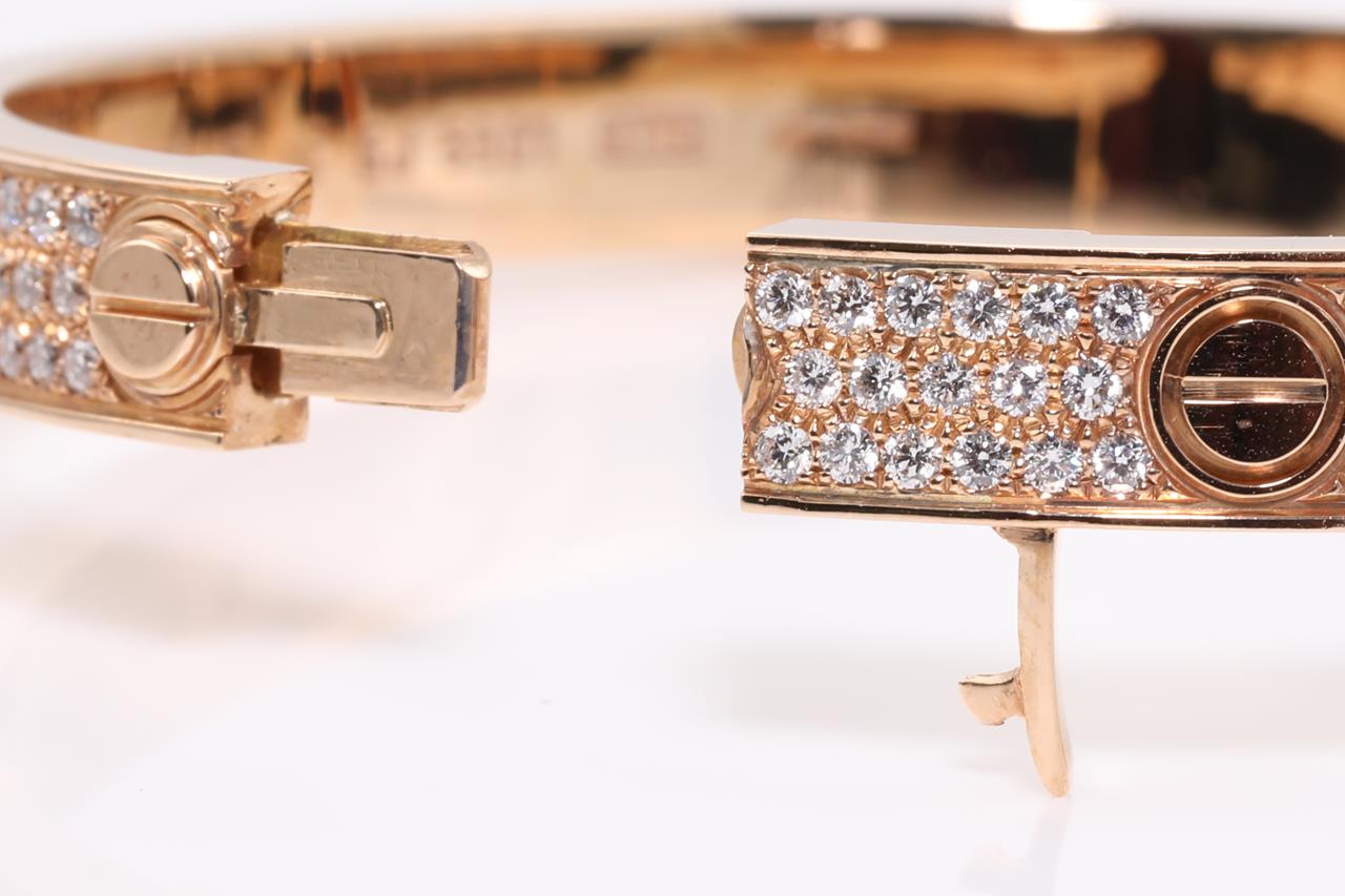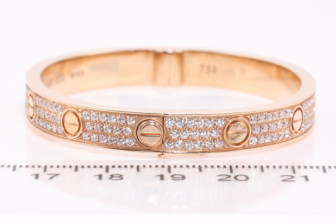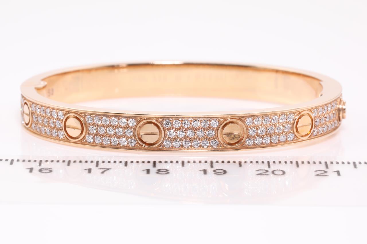 Cartier Love bracelet with 204 round Diamonds totalling 1.99cts (Estimated grading: F VS). 18ct rose gold. Weight: 41.5g. Width: 6.7 mm. Thickness: 3 mm. Cartier stamped size 16cm. With Cartier box. With certificate #414933. (Pre-owned)
