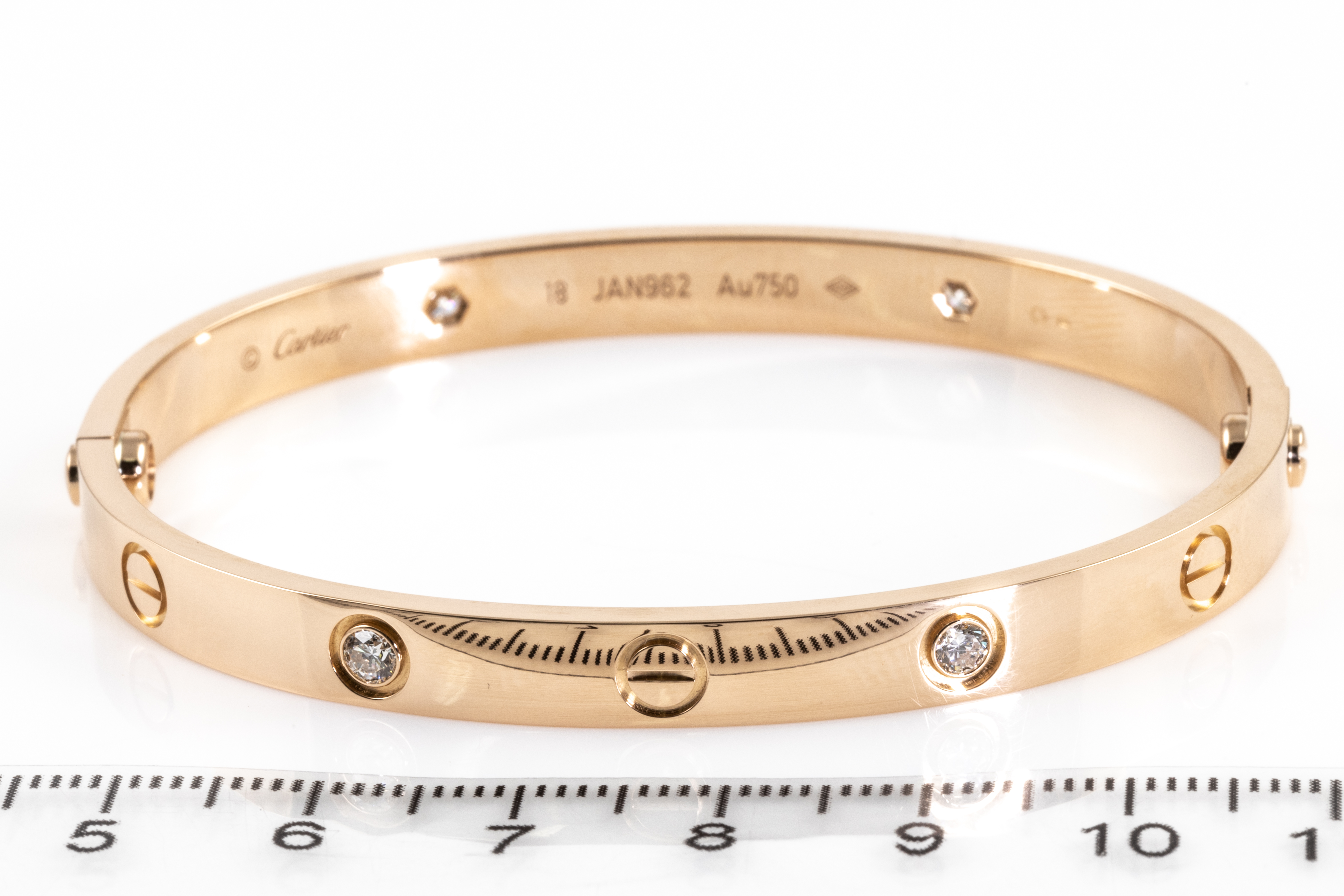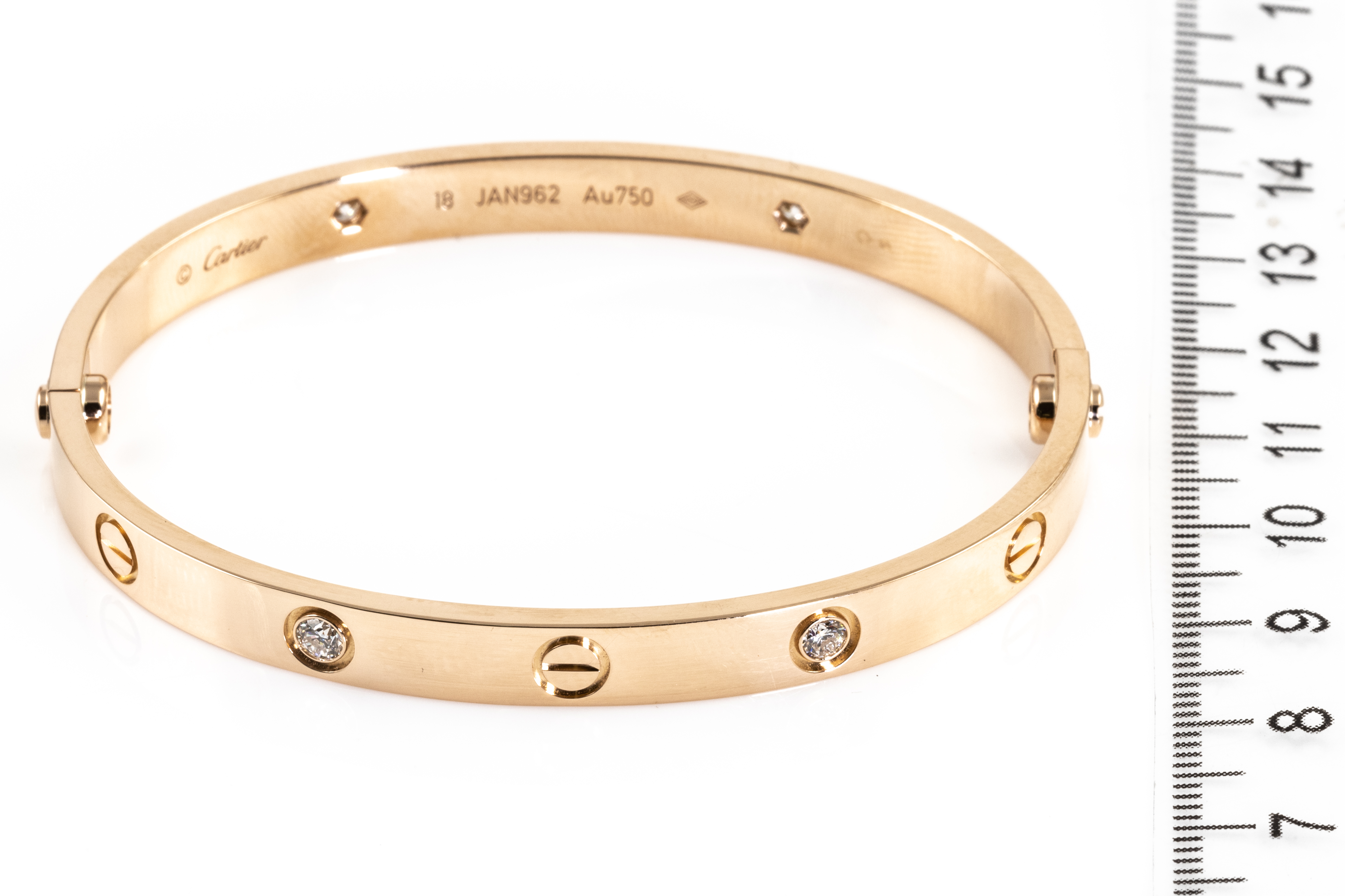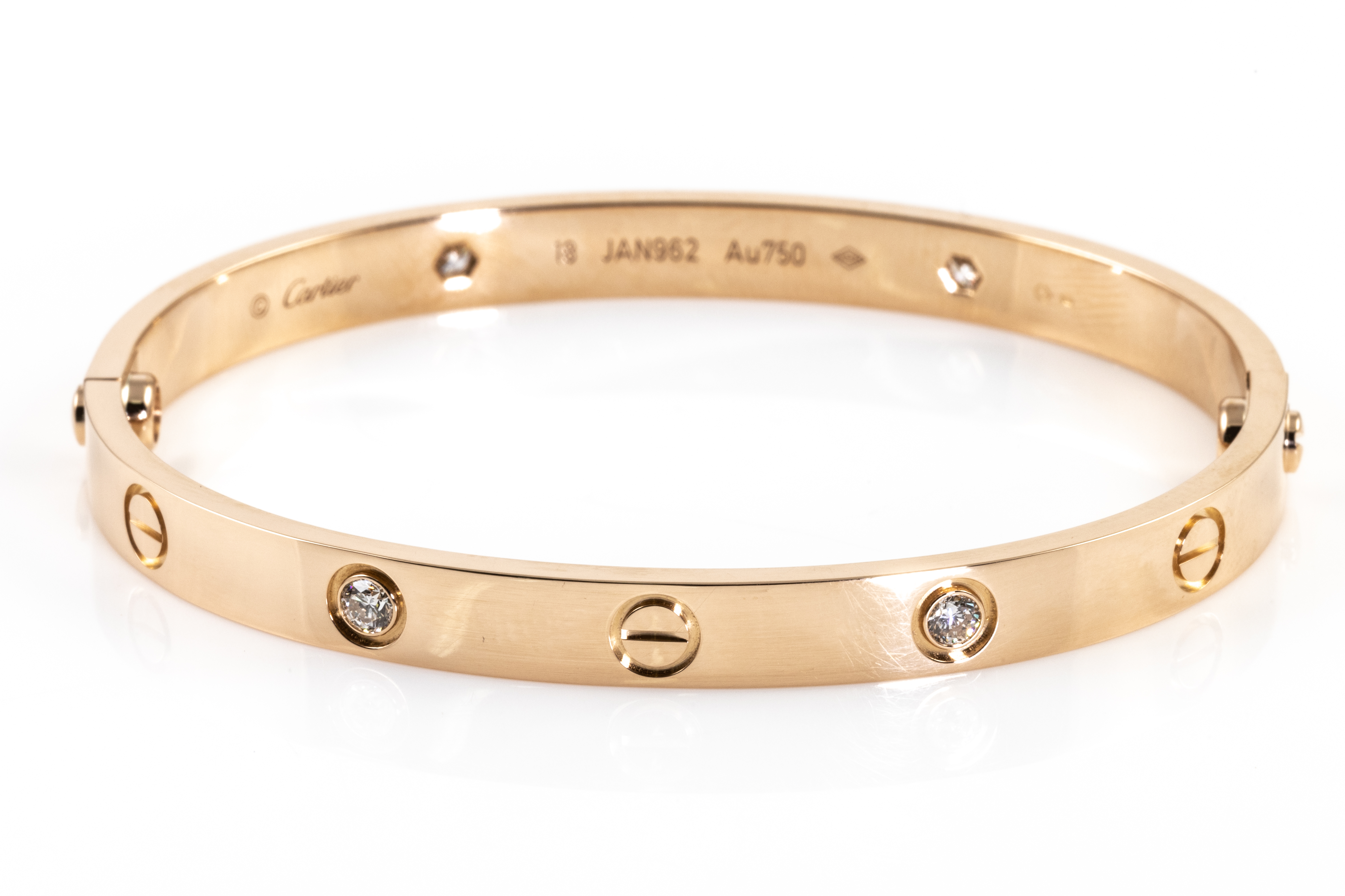 Cartier Love bracelet with 4 round Diamonds totalling 0.42cts (Estimated grading: F VS). 18ct rose gold. Weight 32.4g. Cartier stamped size 18. Width: 5.6mm. With Cartier screwdriver and Cartier box. With Certificate #416012. (Pre-owned)