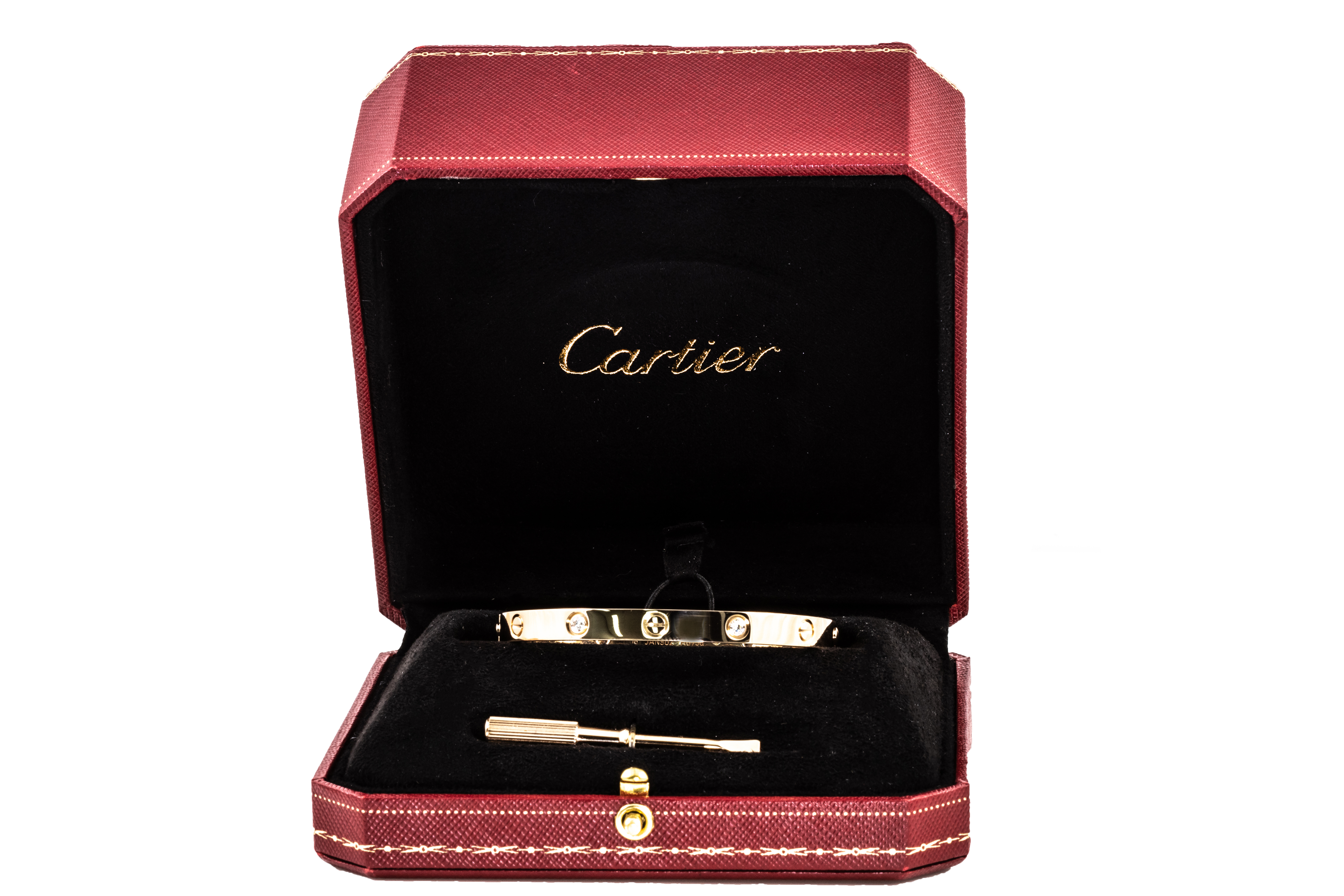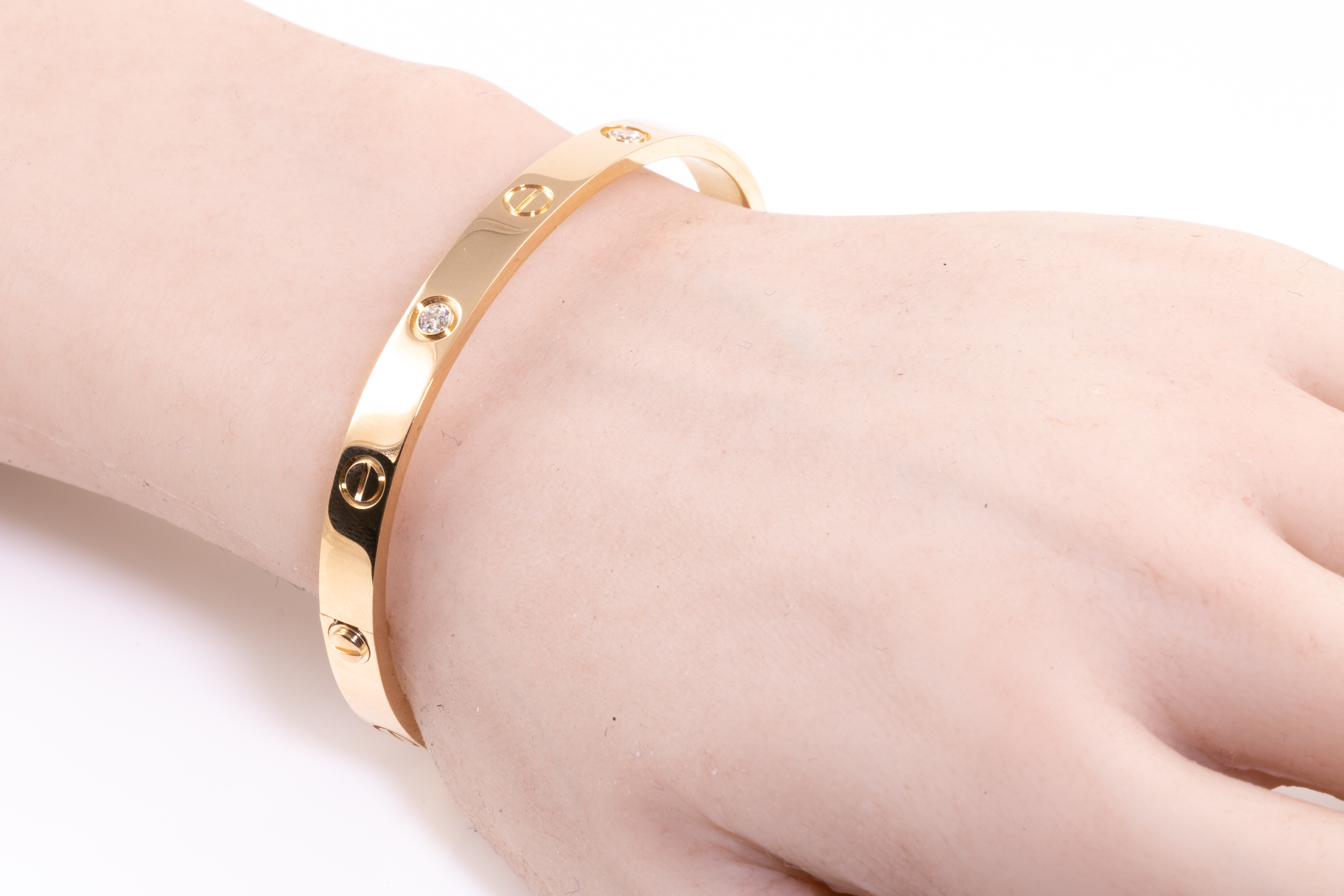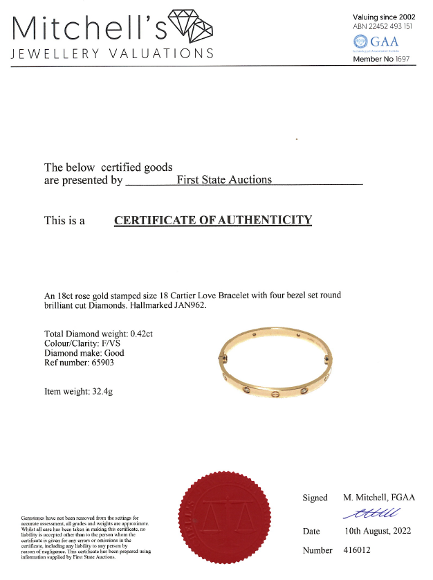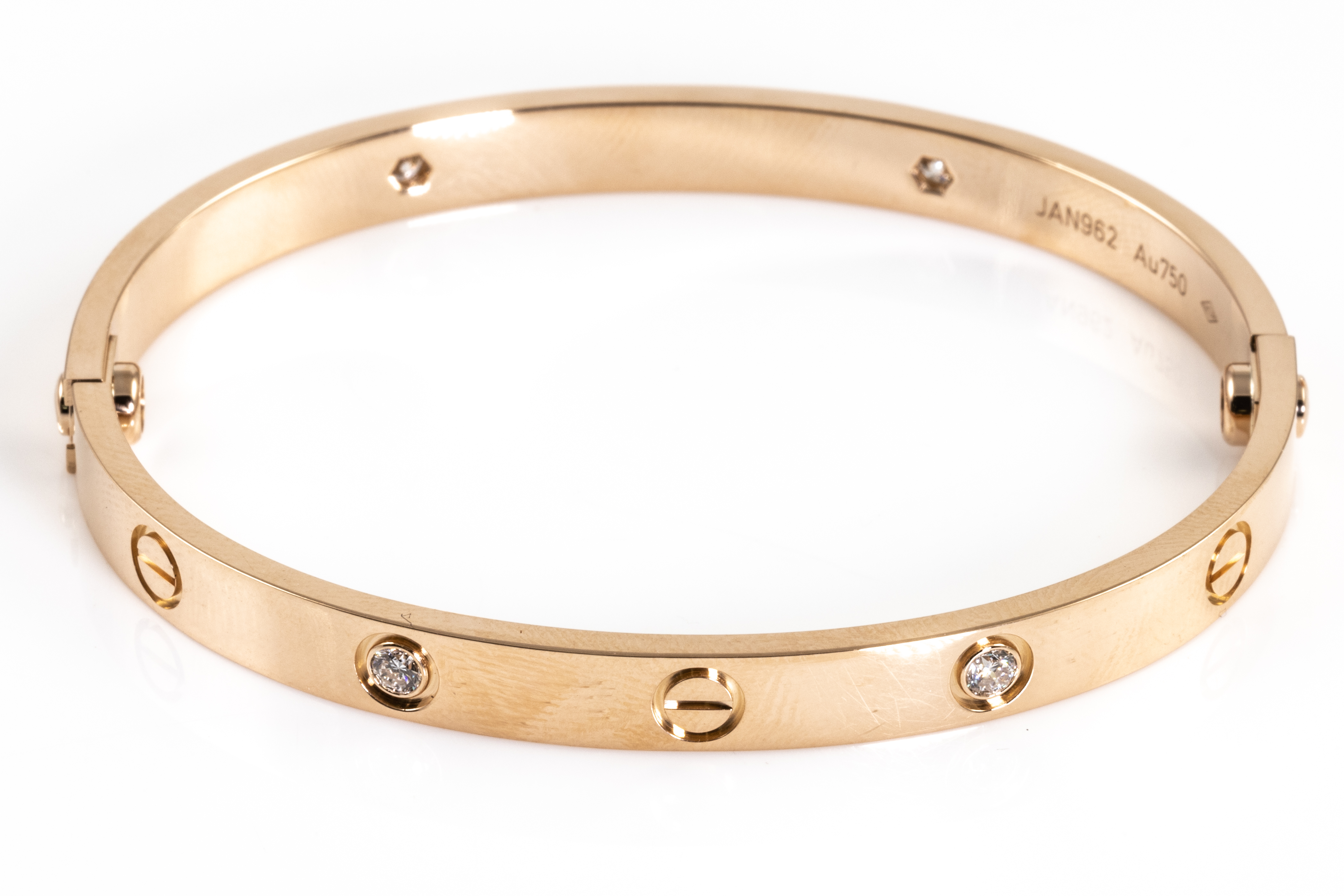 Cartier Love bracelet with 4 round Diamonds totalling 0.42cts (Estimated grading: F VS). 18ct rose gold. Weight 32.4g. Cartier stamped size 18. Width: 5.6mm. With Cartier screwdriver and Cartier box. With Certificate #416012. (Pre-owned)