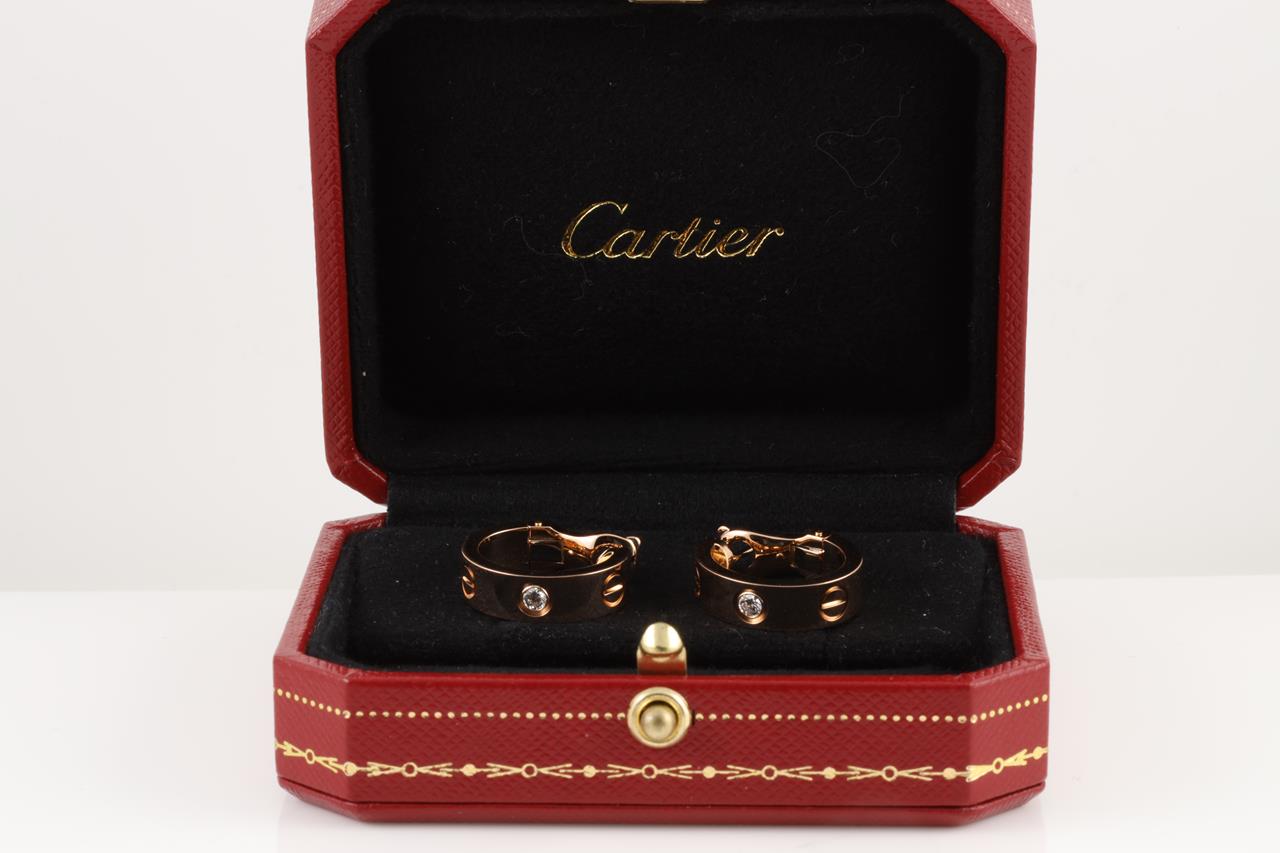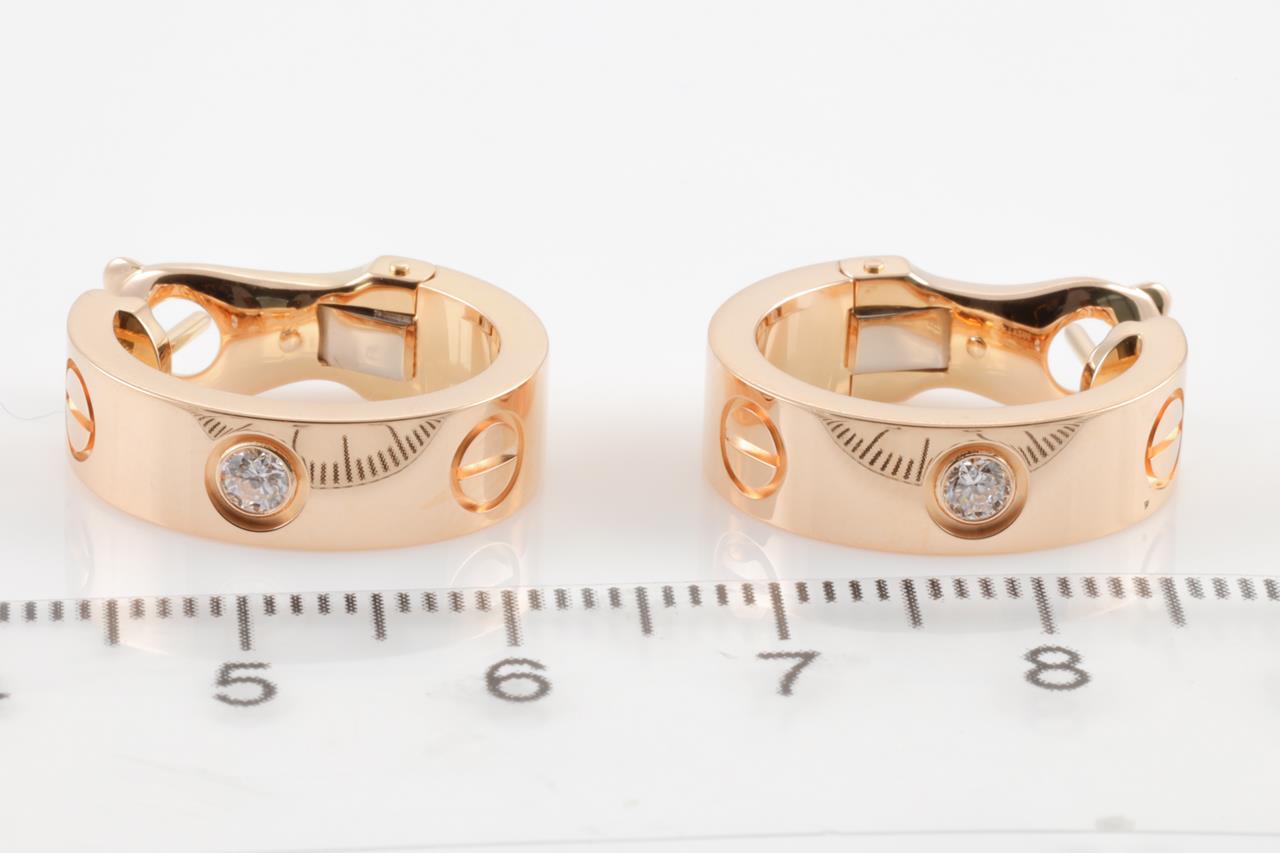 Cartier Love Diamond earrings with round Diamonds totalling 0.14cts (Estimated grading: G VS). 18ct rose gold. Stamped ref #FTY266. With Cartier #1797266. With Cartier Box. Weight: 11.8g (Pre-owned)