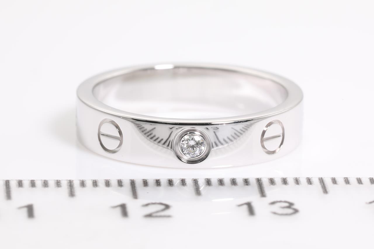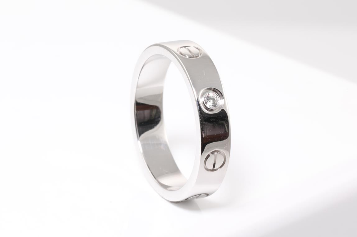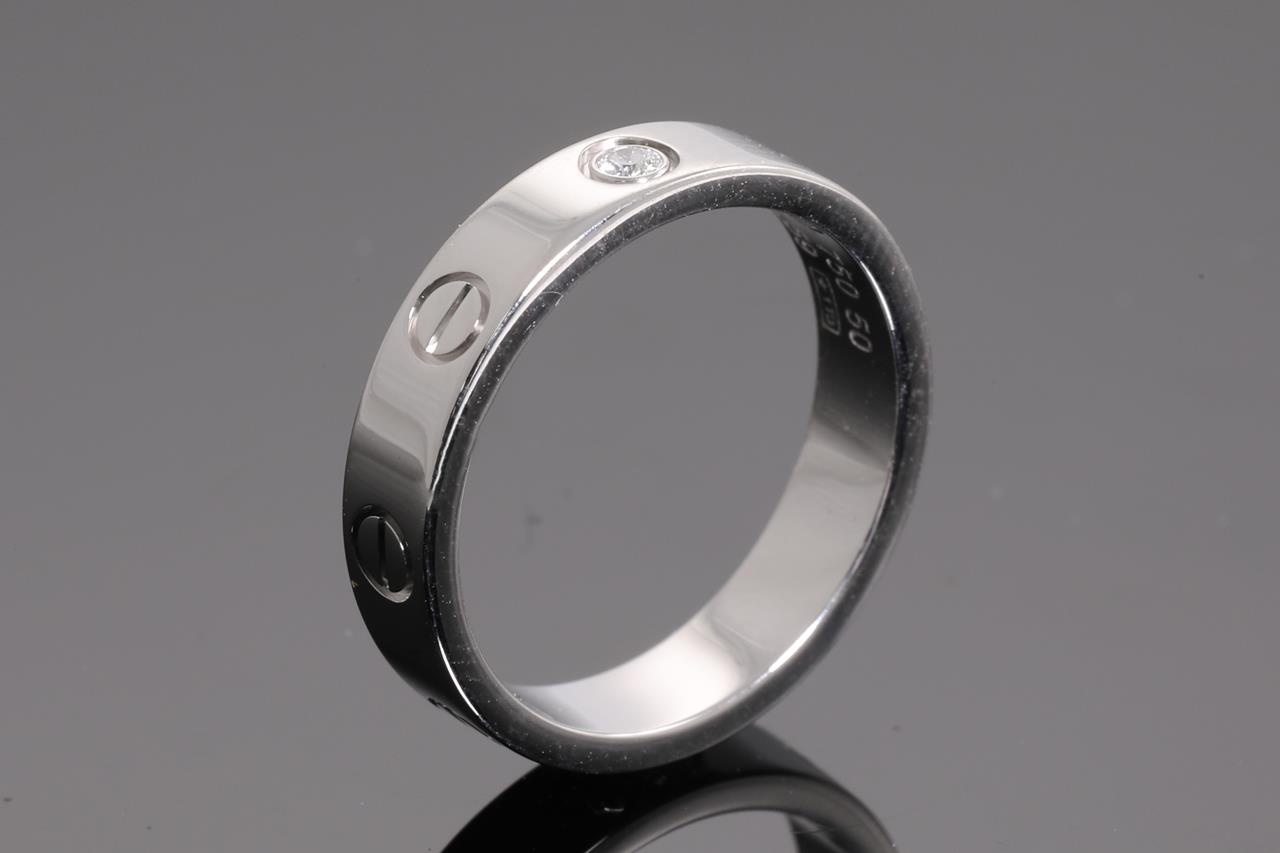 Cartier Love Ring with a round Diamond of 0.02ct. Width: 4mm, 18ct white gold. Ring size: J1/2. Cartier stamped size 50. Weight: 4.8g (Pre-owned)