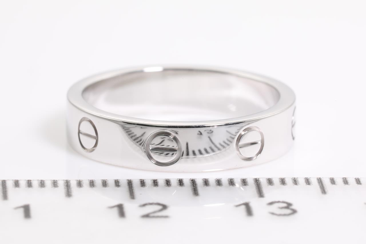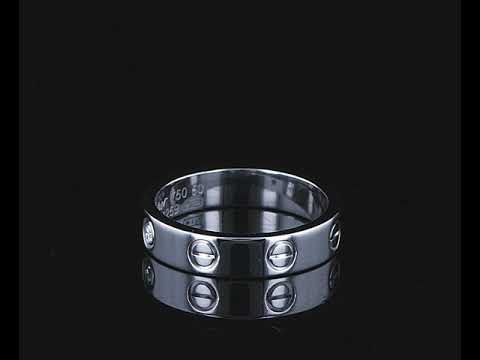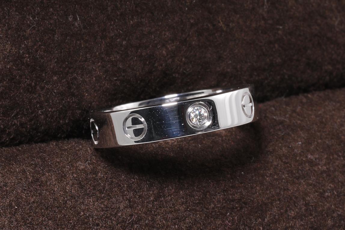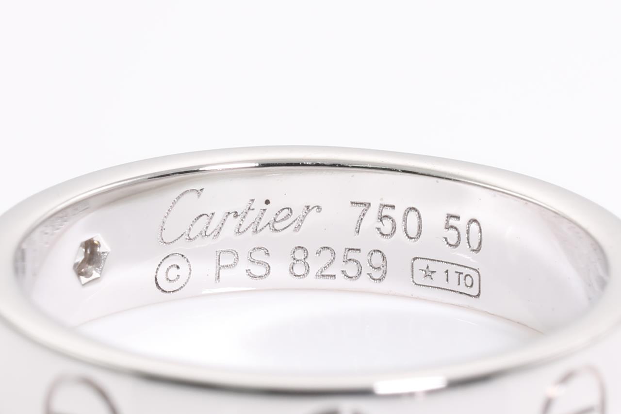 Cartier Love Ring with a round Diamond of 0.02ct. Width: 4mm, 18ct white gold. Ring size: J1/2. Cartier stamped size 50. Weight: 4.8g (Pre-owned)