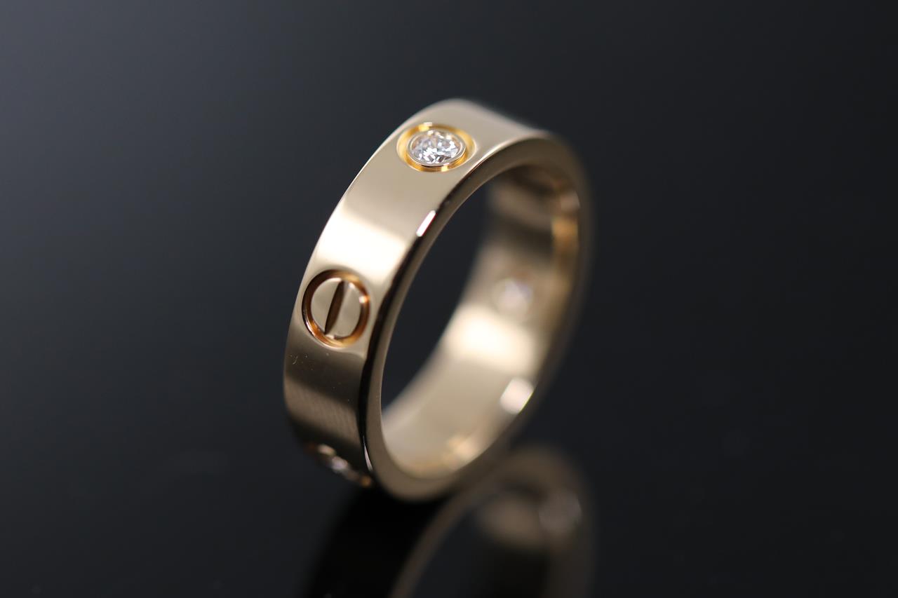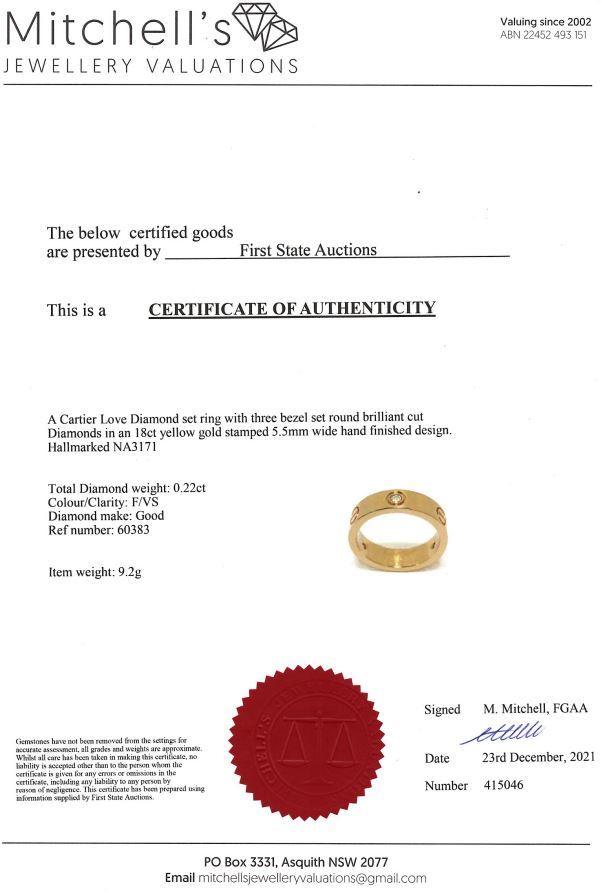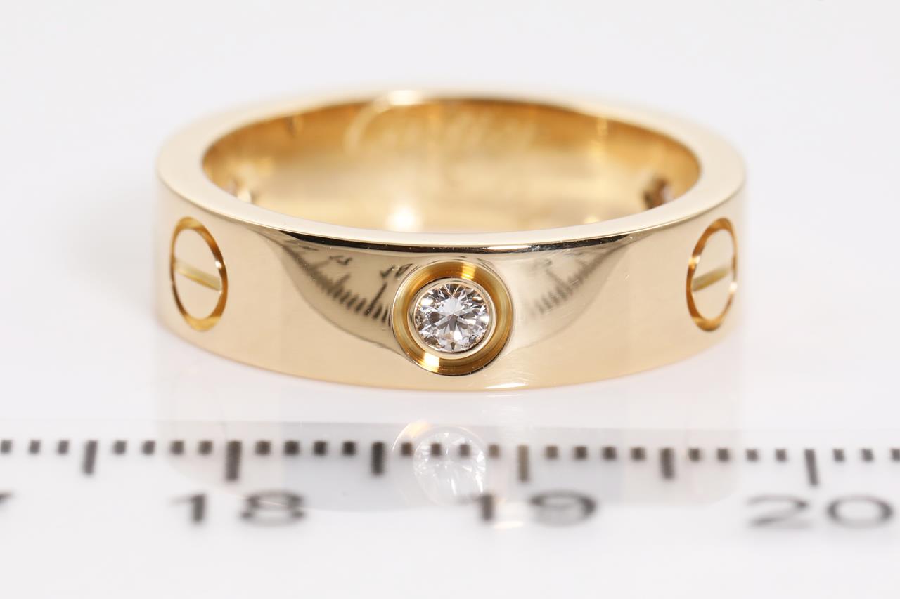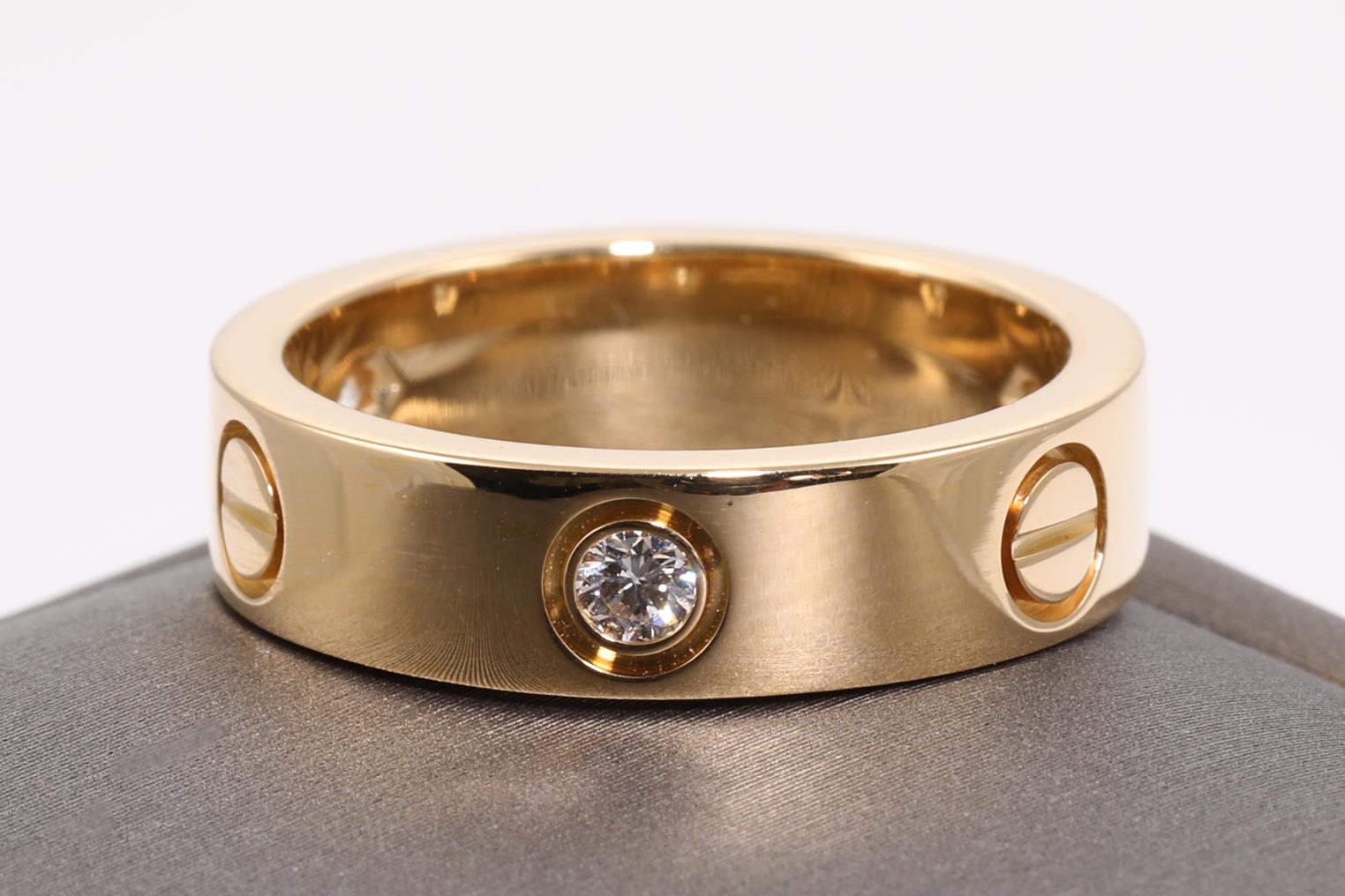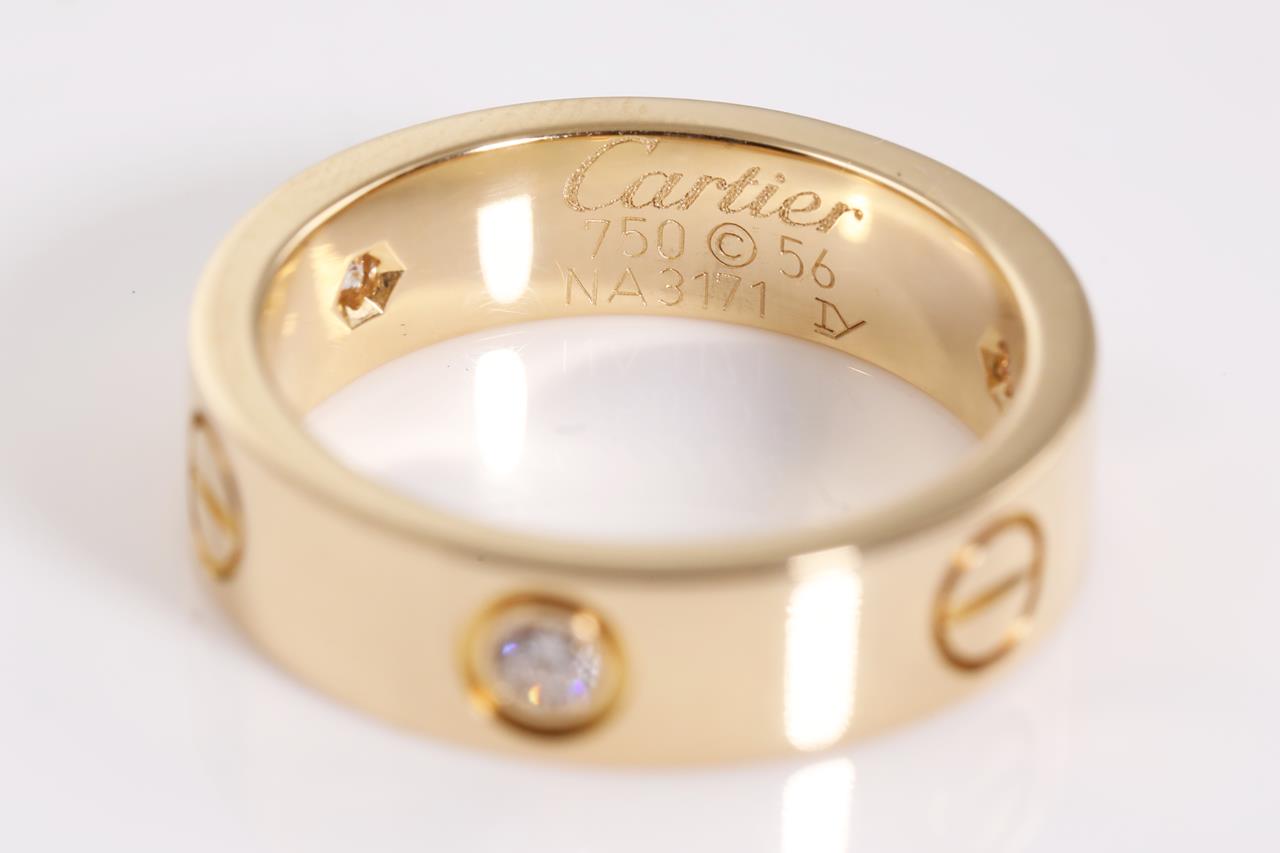 Cartier Love ring with 3 round Diamonds totalling 0.22cts. 18ct yellow gold. Cartier stamped size 56, O1/2 - ring resizing is not recommended. Width 5.5mm. Weight: 9.2g. With Cartier box. With certificate #415046. (Pre-owned)