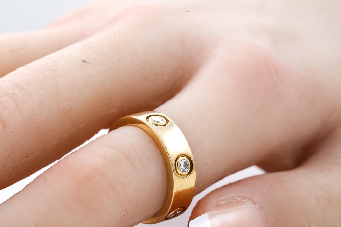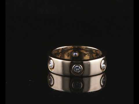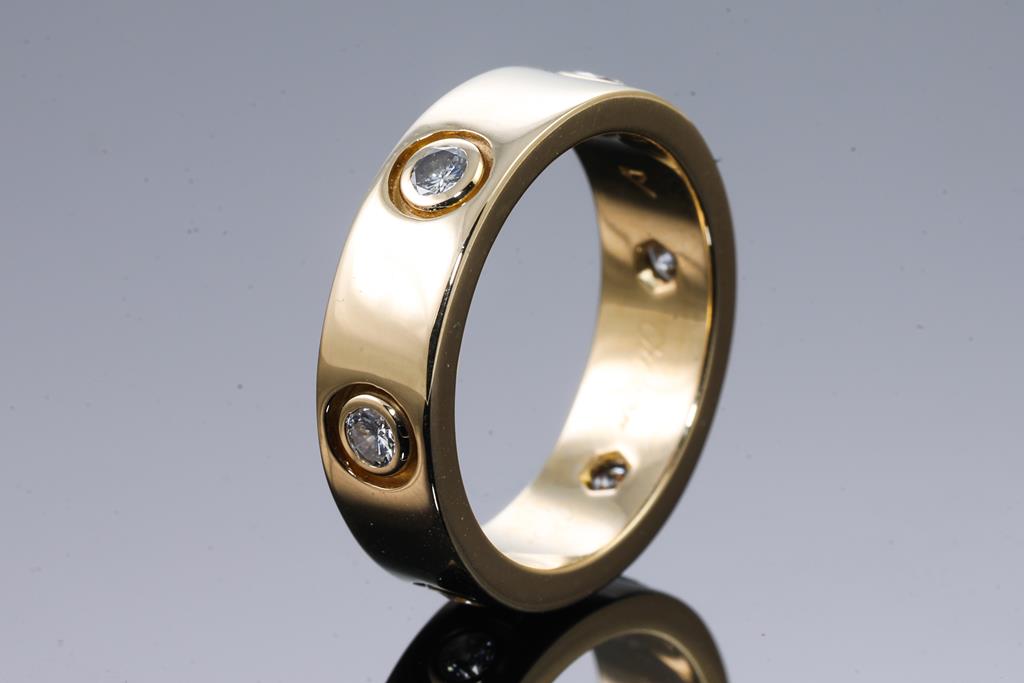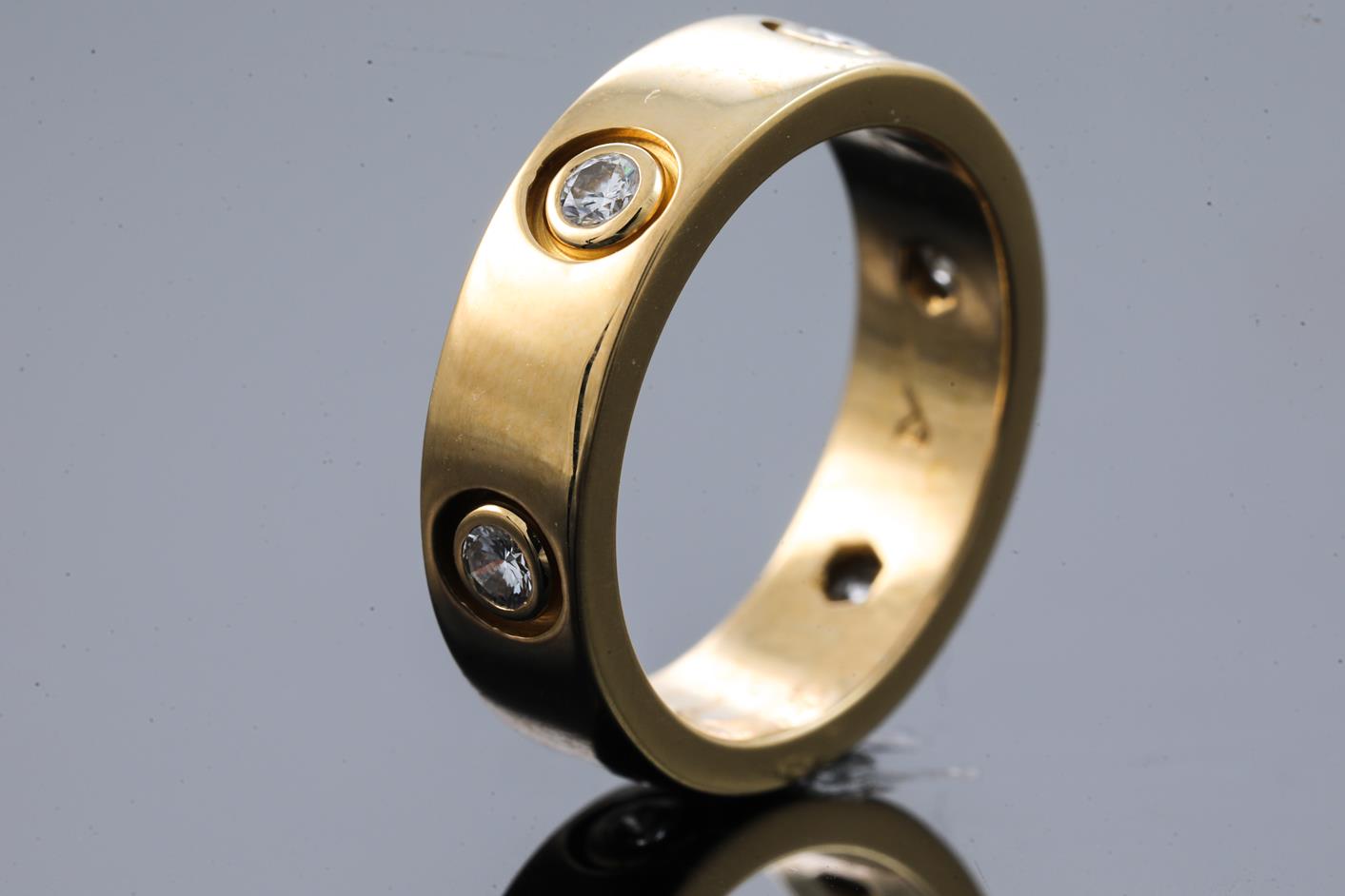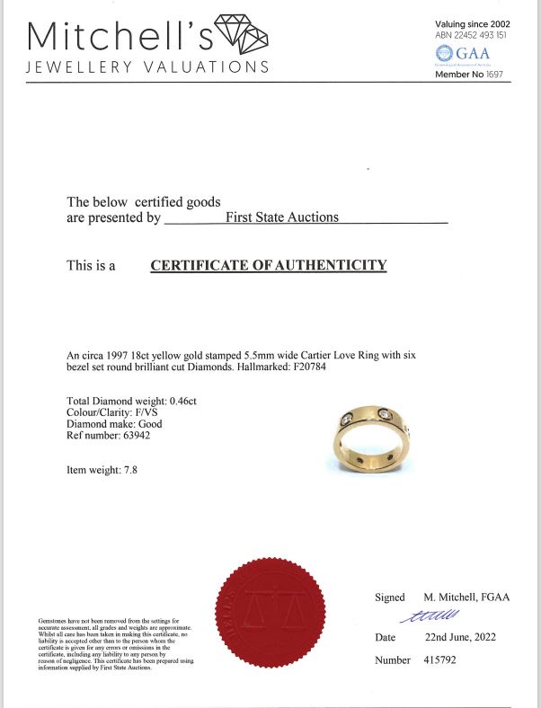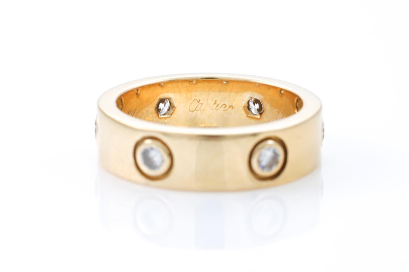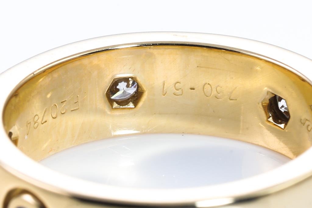 Cartier Love ring with 6 round Diamonds totalling 0.46cts (Estimated grading: F VS). Circa 1997. 18ct yellow gold. Width 5.5mm. Stamped size 51 (actual size ring size K) - ring resizing is not recommended. Weight: 7.8g. With certificate #415792. (Pre-owned)