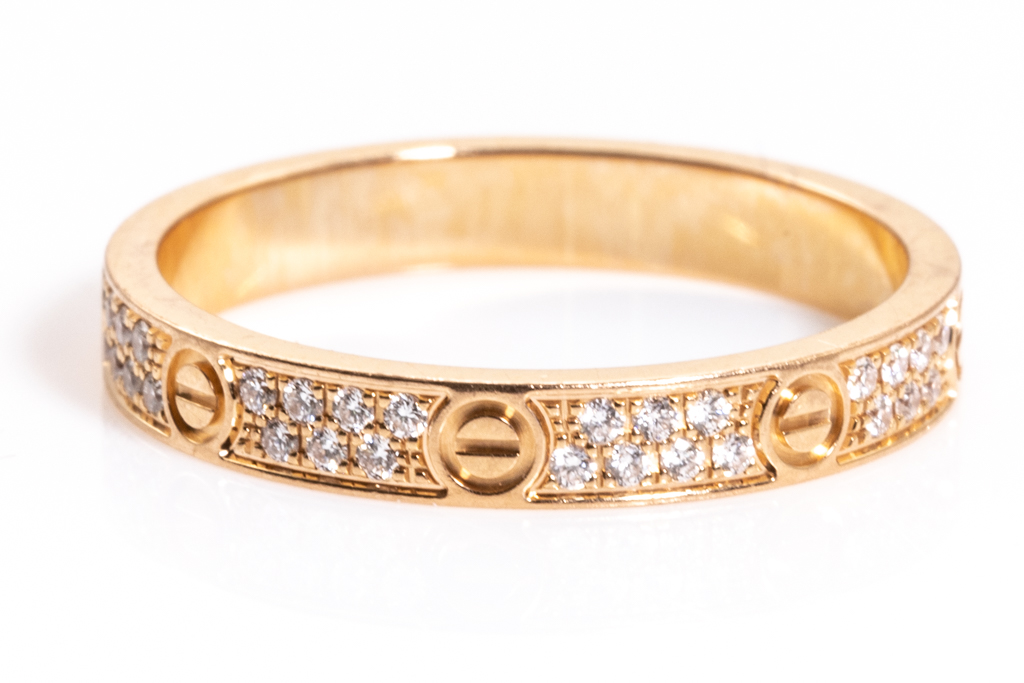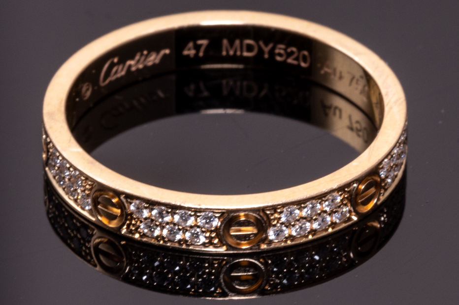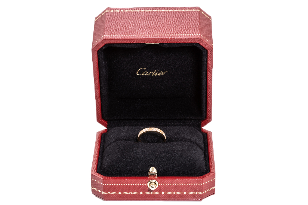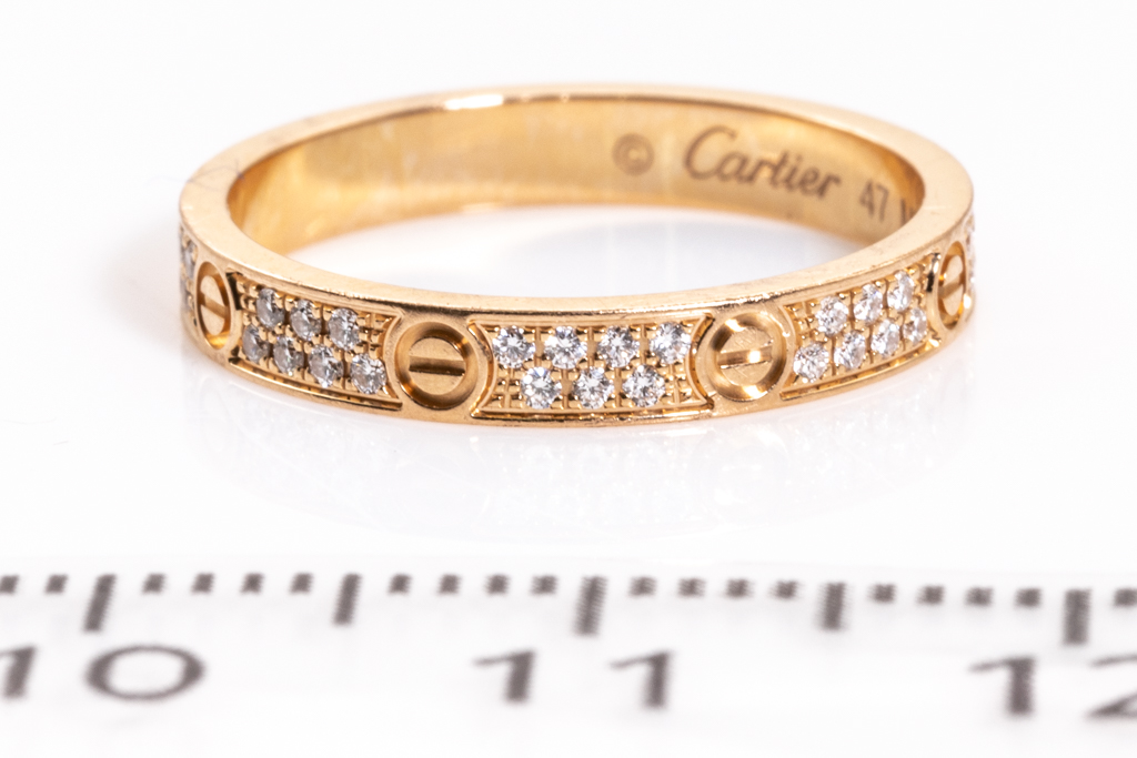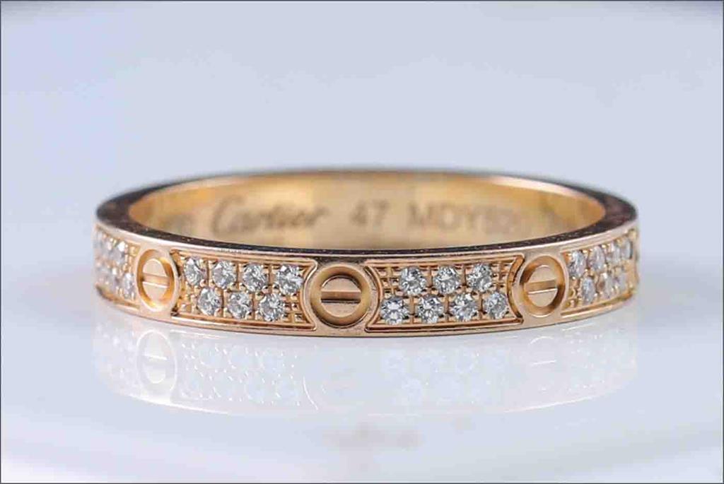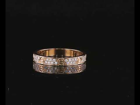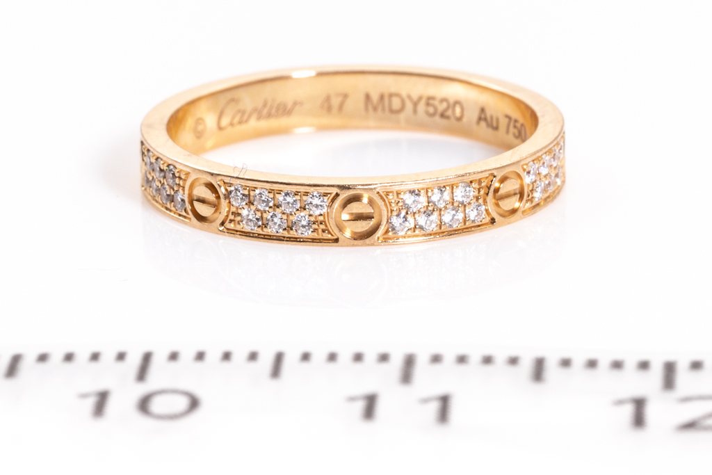 Cartier Love small model wedding band with 72 round Diamonds totalling 0.19cts. Width 2.6mm. 18ct rose gold. Cartier stamped size 47, ring size H - ring resizing is not recommended. Weight: 1.8g. With Cartier box. (Pre-owned)