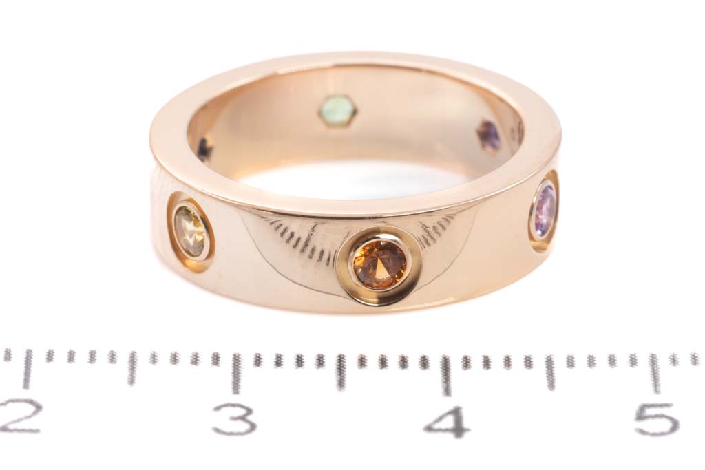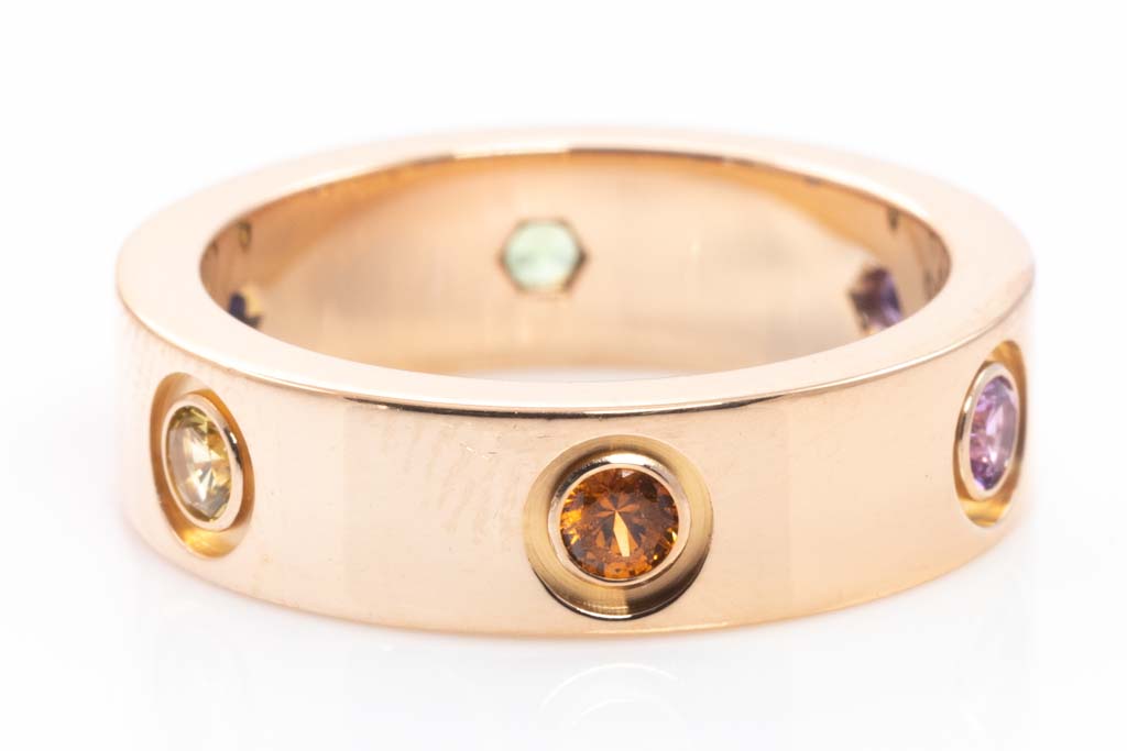 Cartier Love multi-colour Gemstone ring with round pink, yellow & blue Sapphires totalling approximately 0.15cts, green & orange Garnets totalling approximately 0.12cts and round Amethyst of approximately 0.05ct (note: gemstones with surface wear mark and a damaged Amethyst). 18ct rose gold. Cartier stamped size 52, L - ring resizing is not recommended. Weight: 9.2g. (Pre-owned)