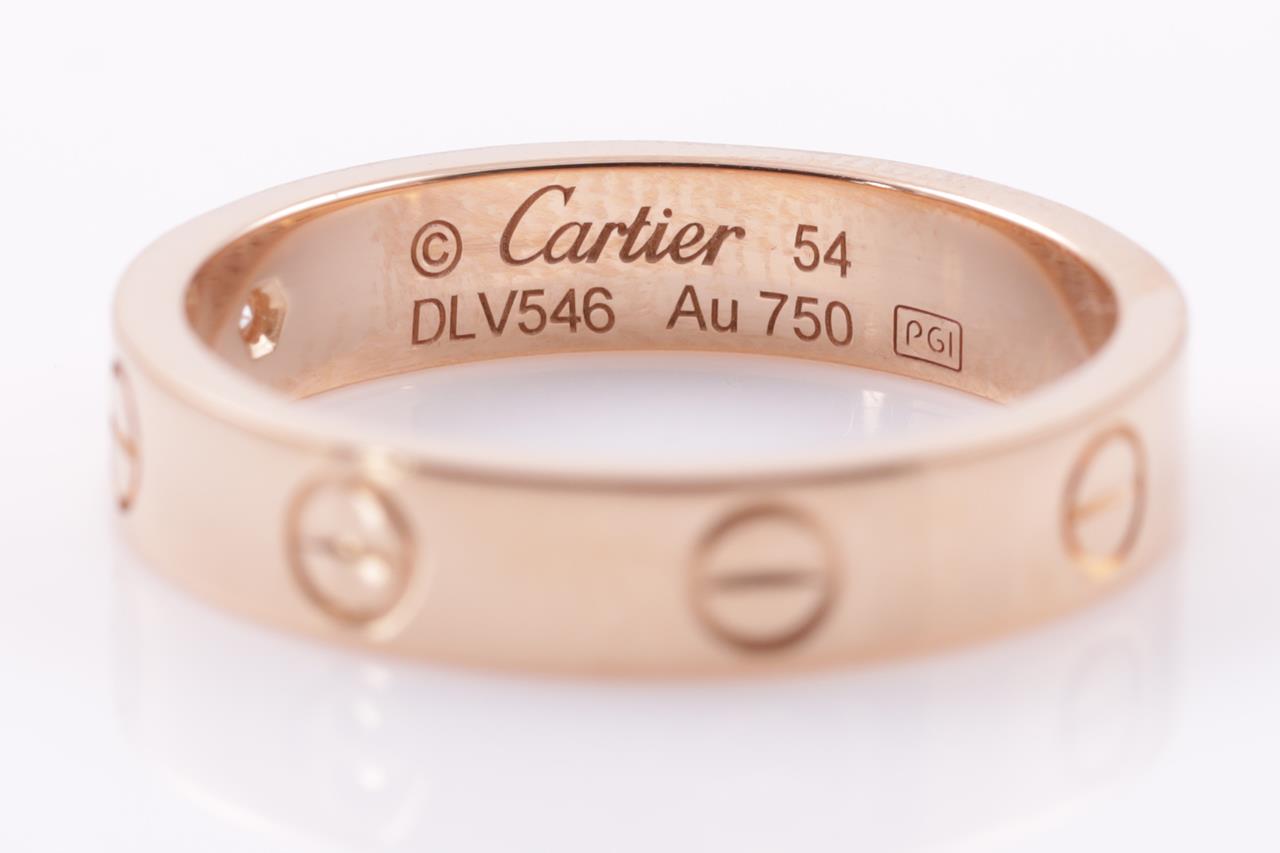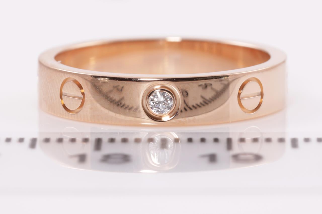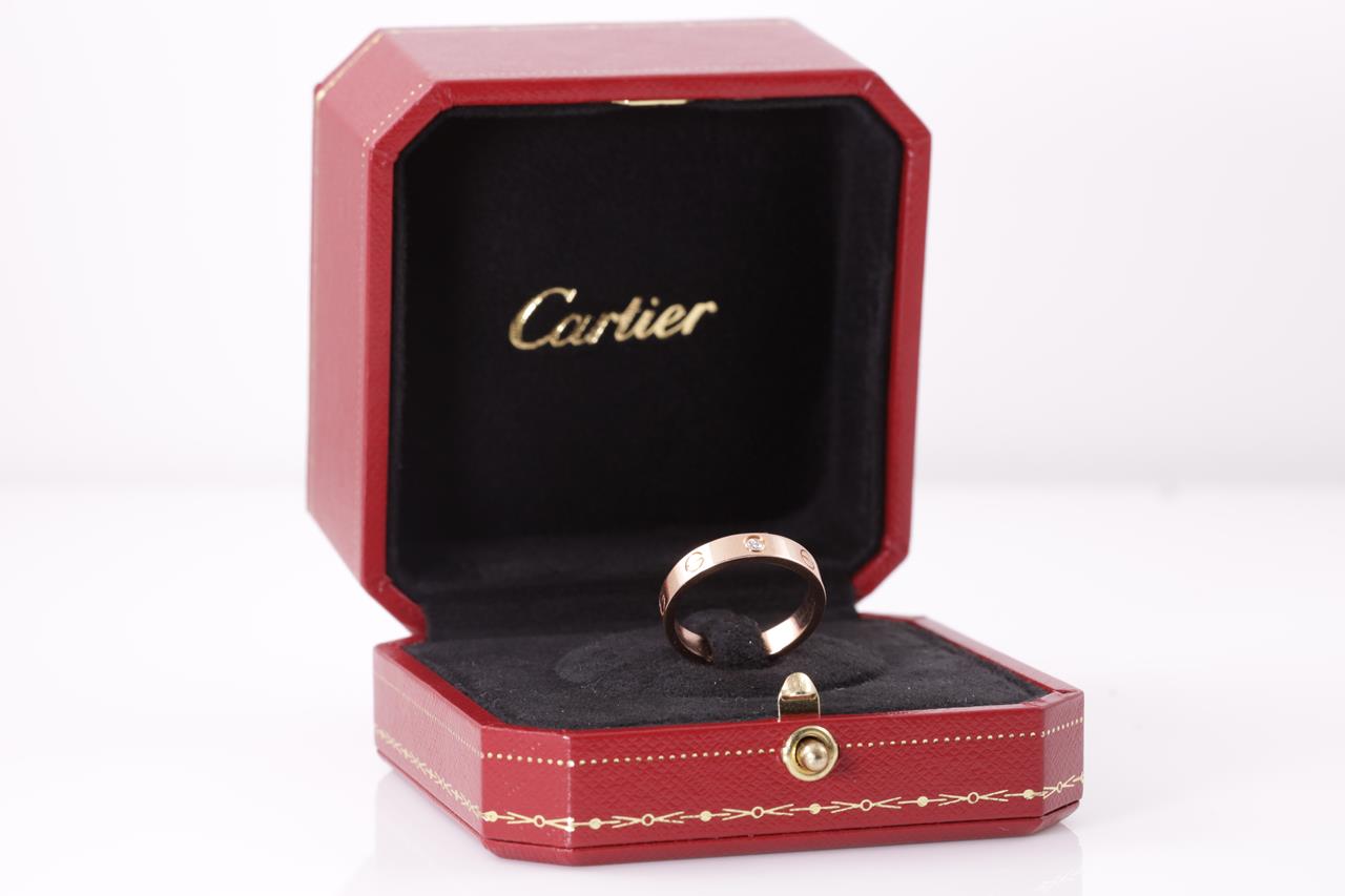 Cartier Love wedding band with a round Diamond of 0.02ct. 18ct rose gold. Cartier stamped size 54, N - ring resizing is not recommended. Ref# DLV546. Width: 4mm. With Cartier certificate & purchase receipt dated 11/12/2016 and Cartier box. Weight: 4.8g (Pre-owned)