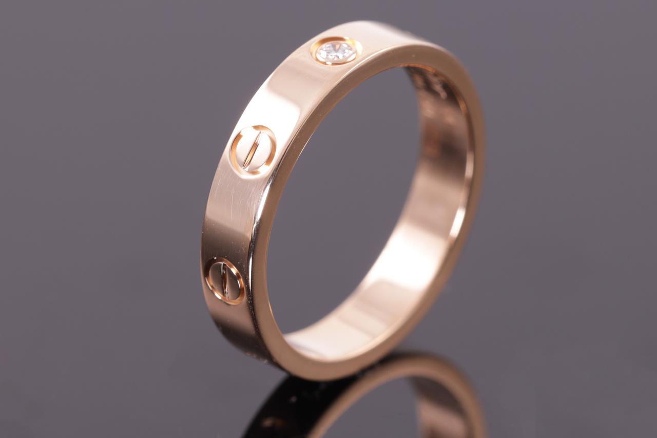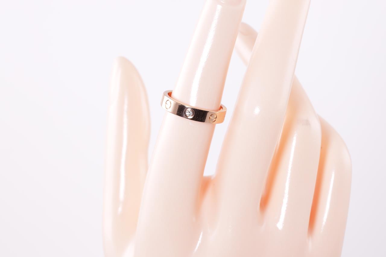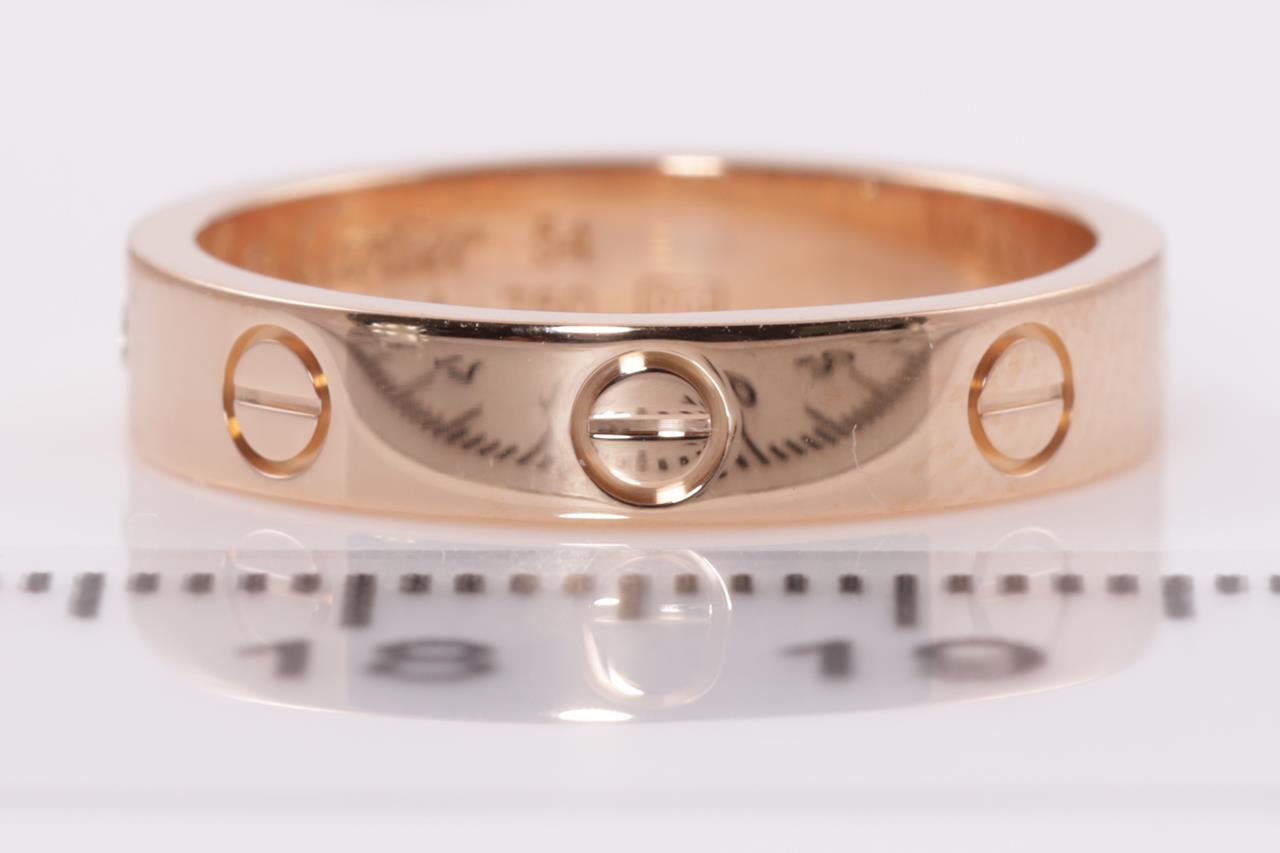 Cartier Love wedding band with a round Diamond of 0.02ct. 18ct rose gold. Cartier stamped size 54, N - ring resizing is not recommended. Ref# DLV546. Width: 4mm. With Cartier certificate & purchase receipt dated 11/12/2016 and Cartier box. Weight: 4.8g (Pre-owned)