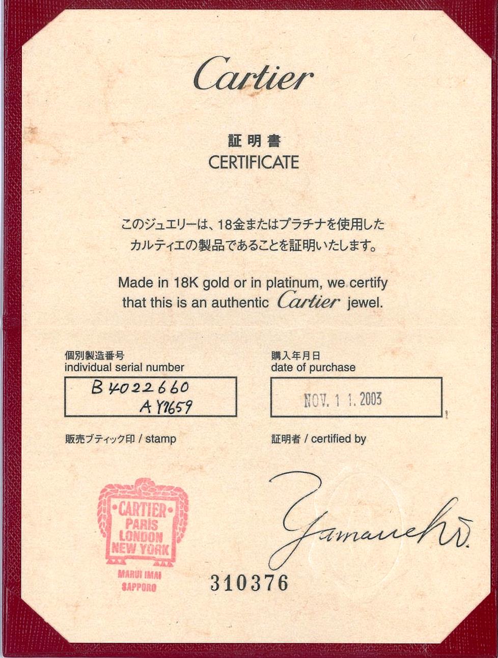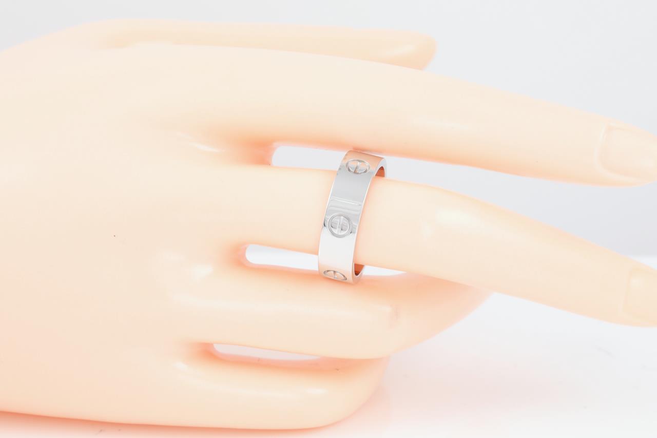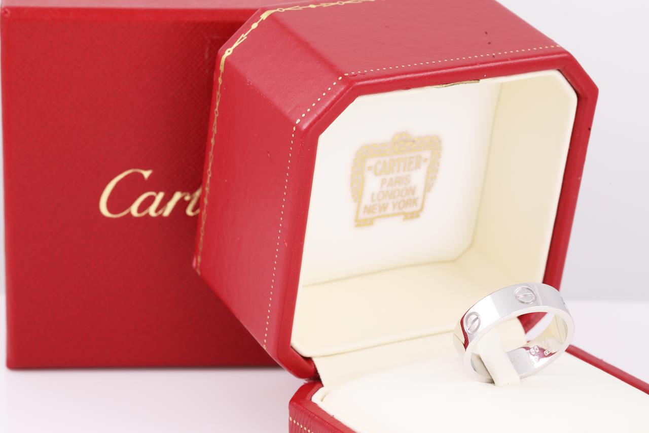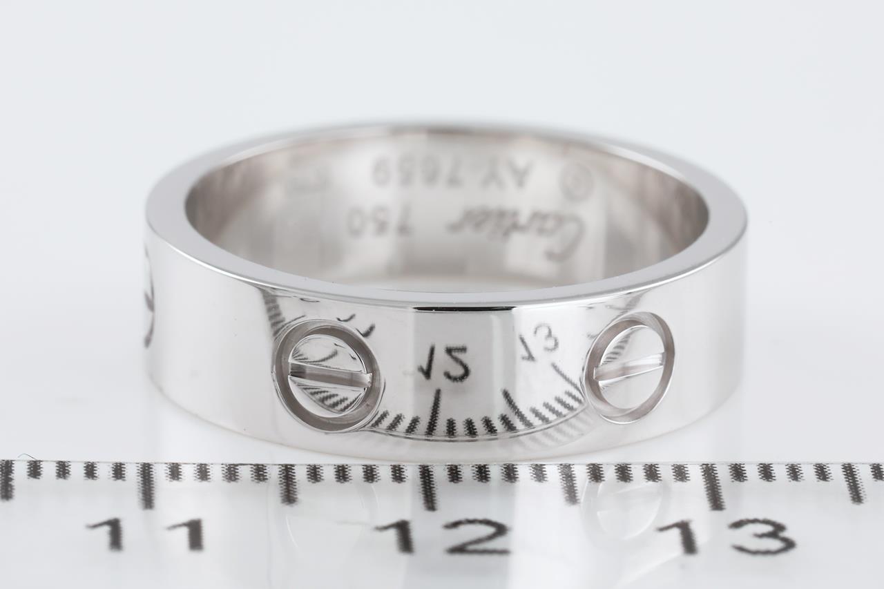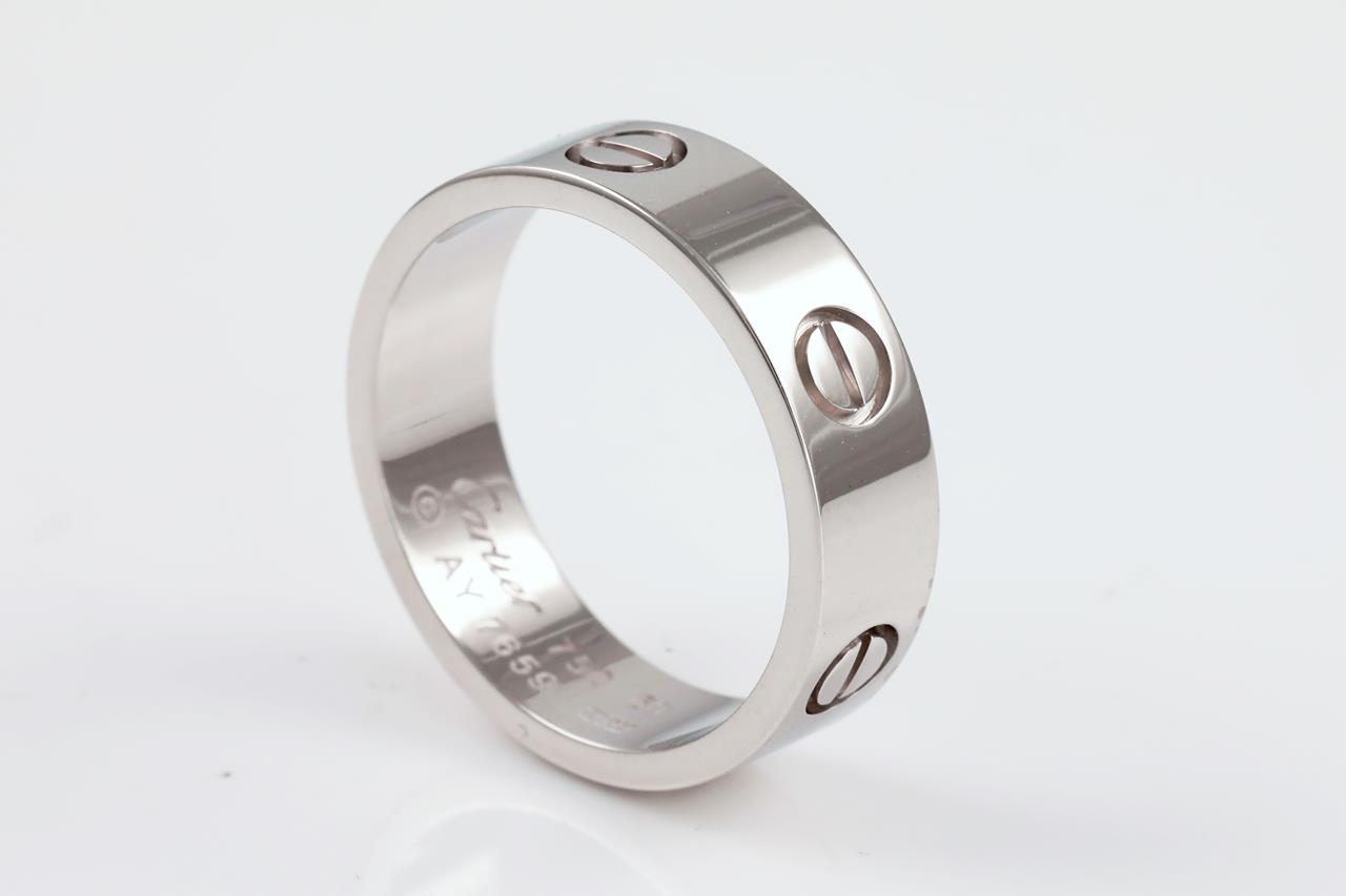 Cartier Love ring. 18ct white gold. Width 6.1mm. Cartier stamped size 60, R - ring resizing is not recommended. With Cartier authenticity certificate dated 11/11/2003. With slightly worn Cartier box. Weight 9.4g. (Pre-owned)