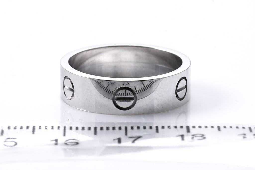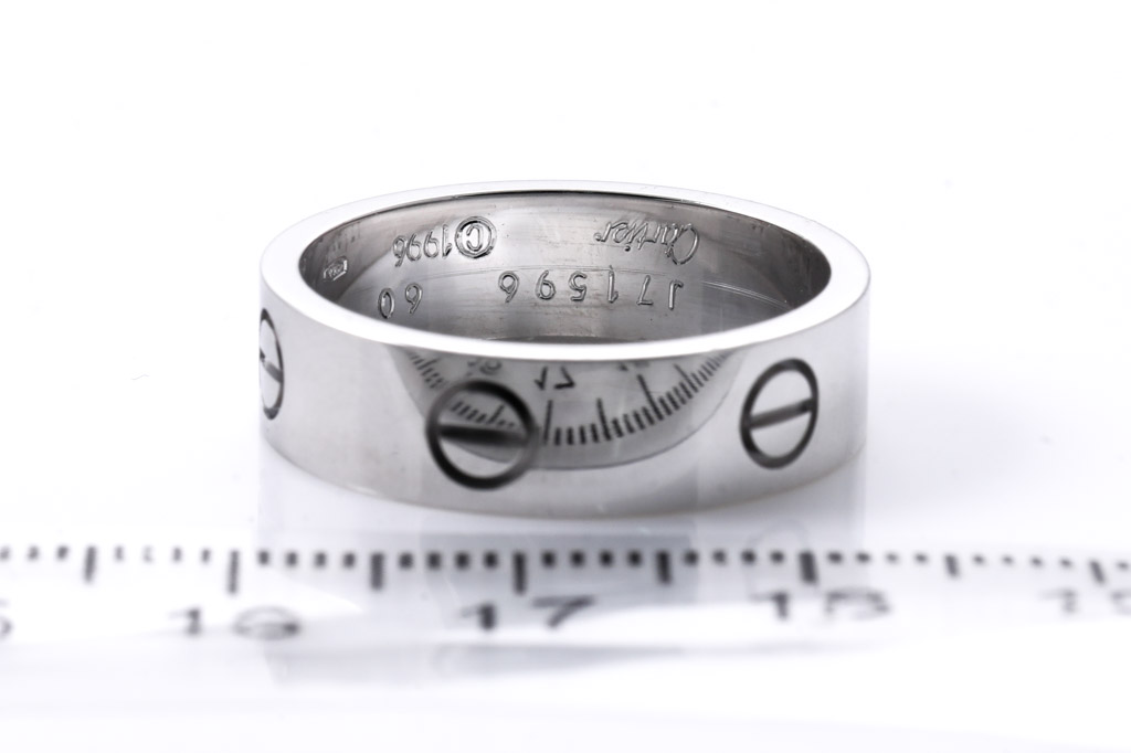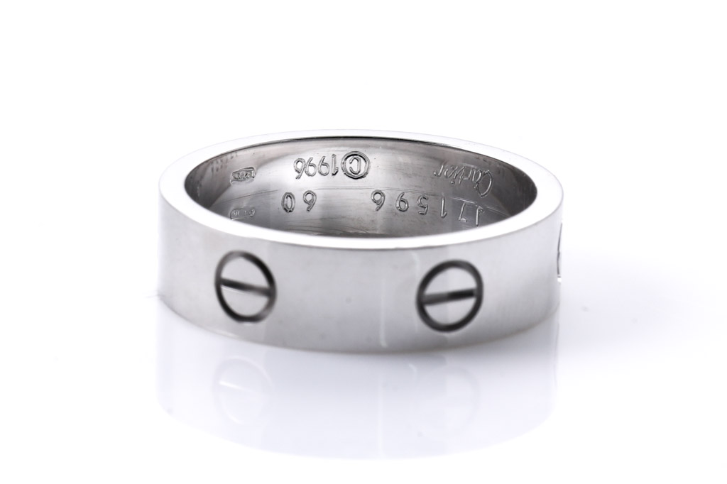 Cartier Love ring. 18ct white gold. Circa: 1996. Width 5.5mm. Cartier stamped size 60, R1/2 - ring resizing is not recommended. Weight 9.2g. (Pre-owned)