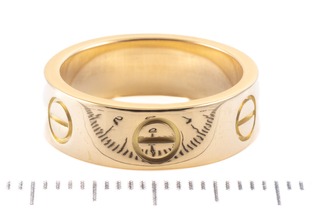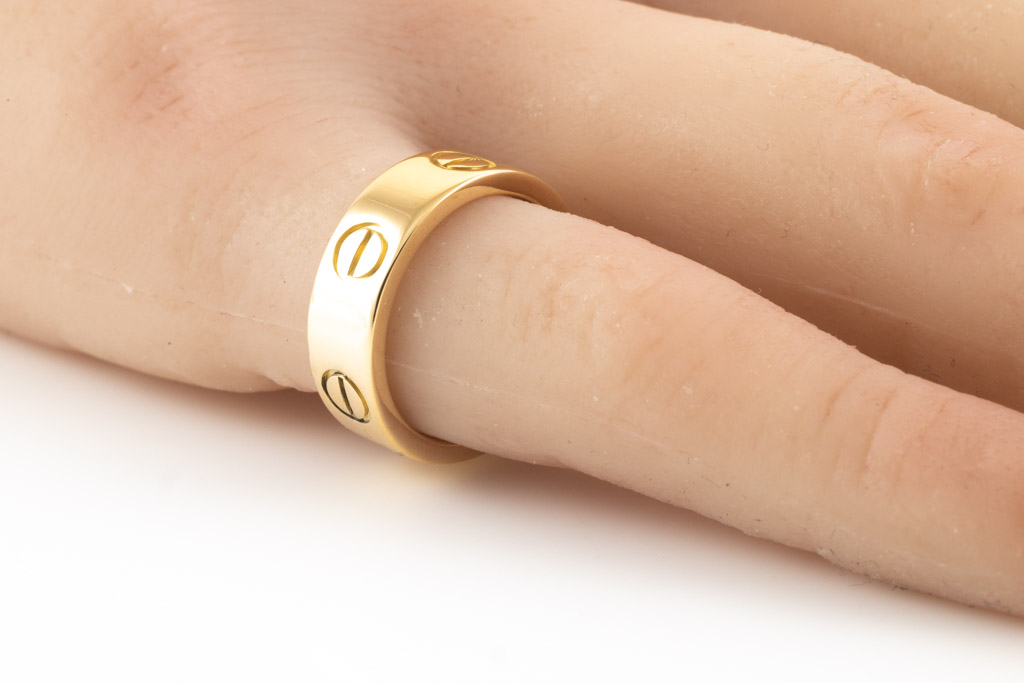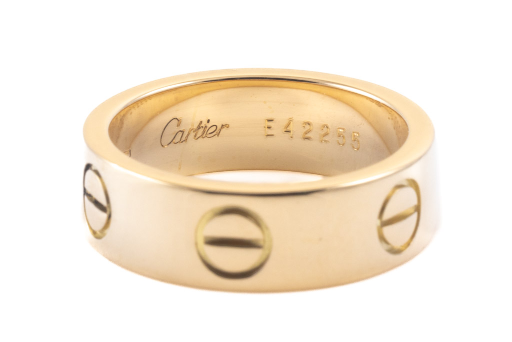 Cartier Love Ring. 18ct yellow gold. Cartier stamped size 49, I - ring resizing is not recommended. Width: 5.5mm. Weight 7.2g. (Pre-owned)