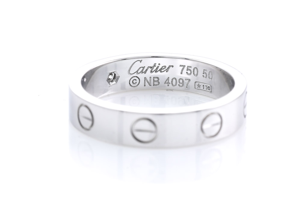 Cartier Love Wedding Band with one round Diamond of 0.02cts. 18ct white gold. Width: 4mm. Ring stamped size 50, - ring resizing is not recommended. Weight: 4.6g. With Cartier box. (Pre-owned)