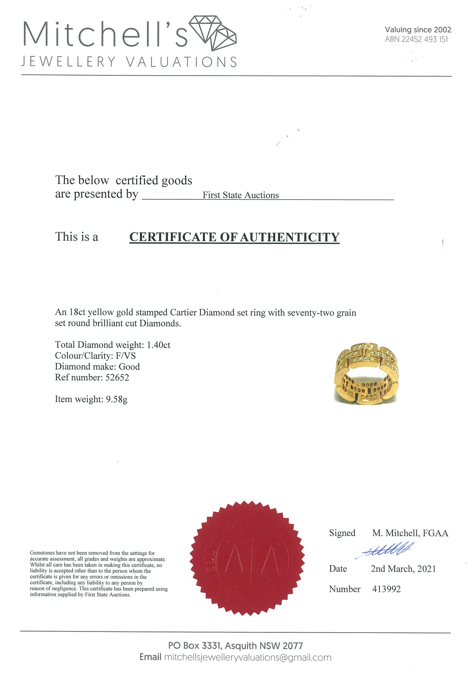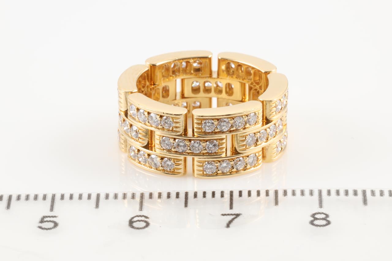Cartier Maillon Panthère Diamond ring with round Diamonds totalling appoximately 1.40cts (Estimated Grading: F VS). 18ct yellow gold. Ring size: I. Cartier stamped size: 48. Note it is not recommended to resize this ring. Ref #977849. With certificate #413992. Weight: 9.6g (Pre-owned)