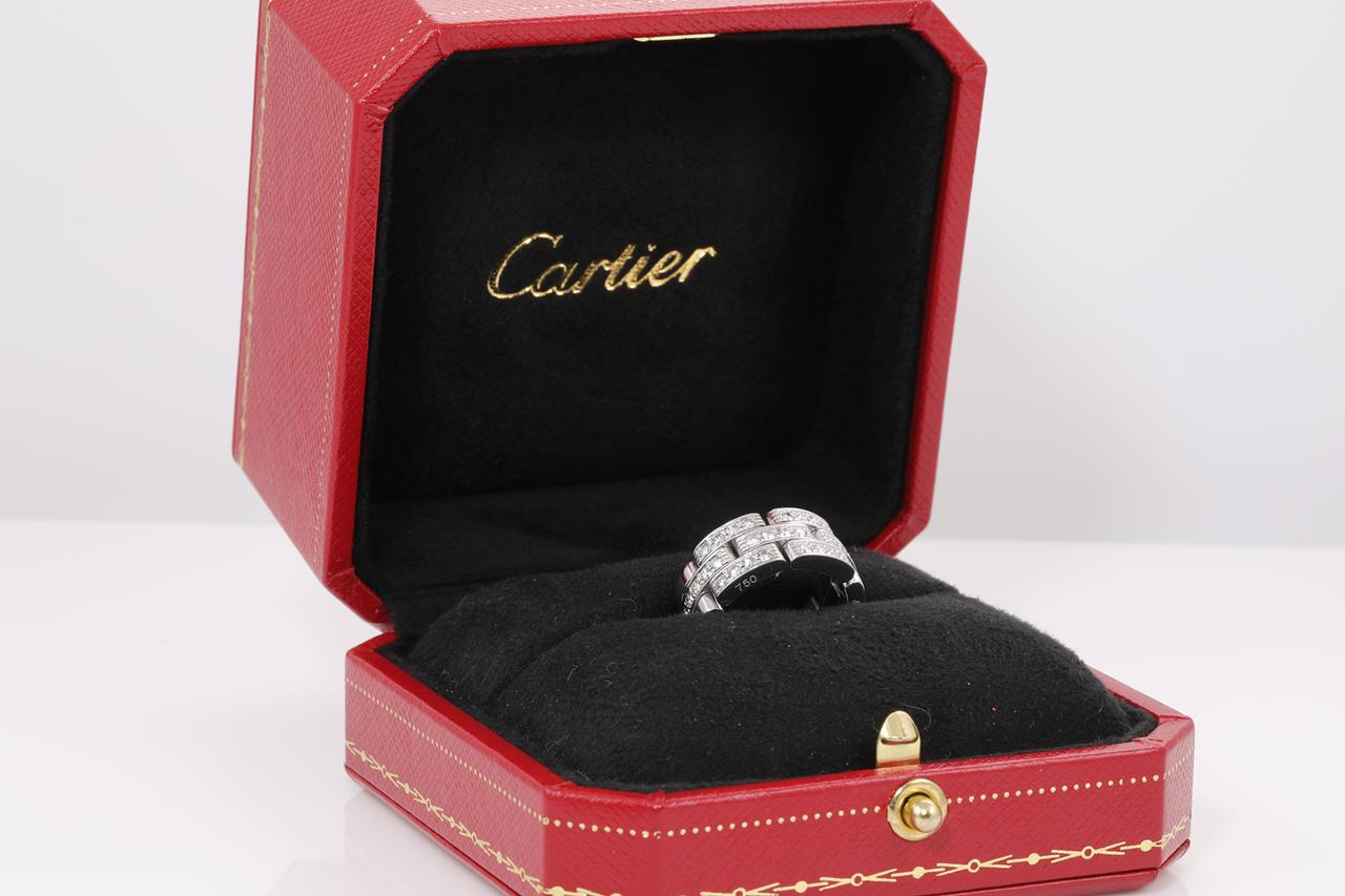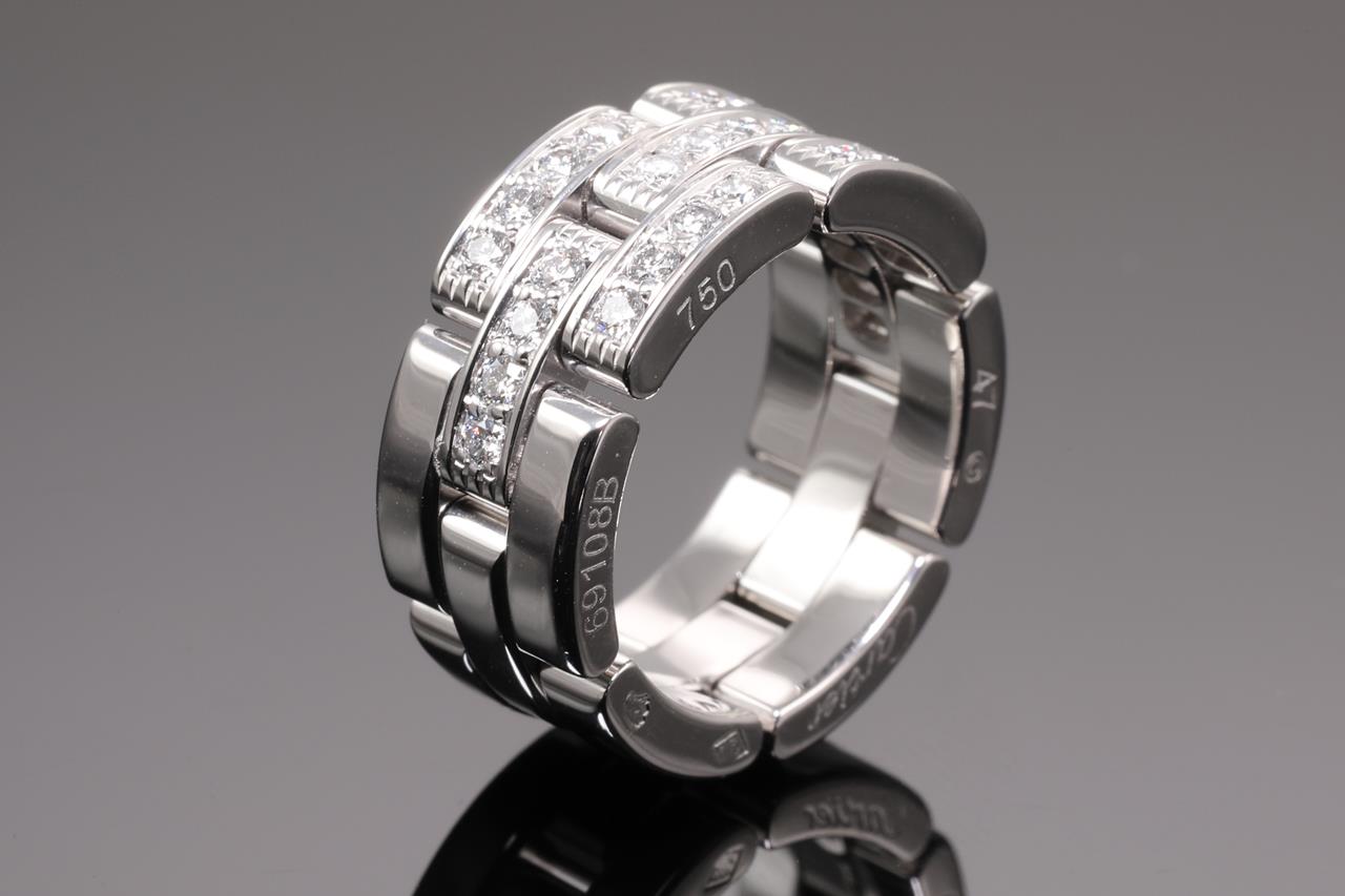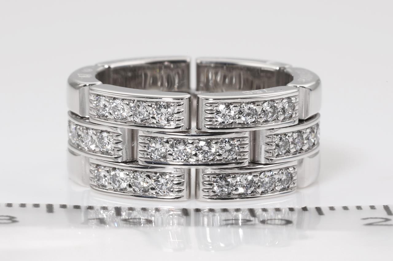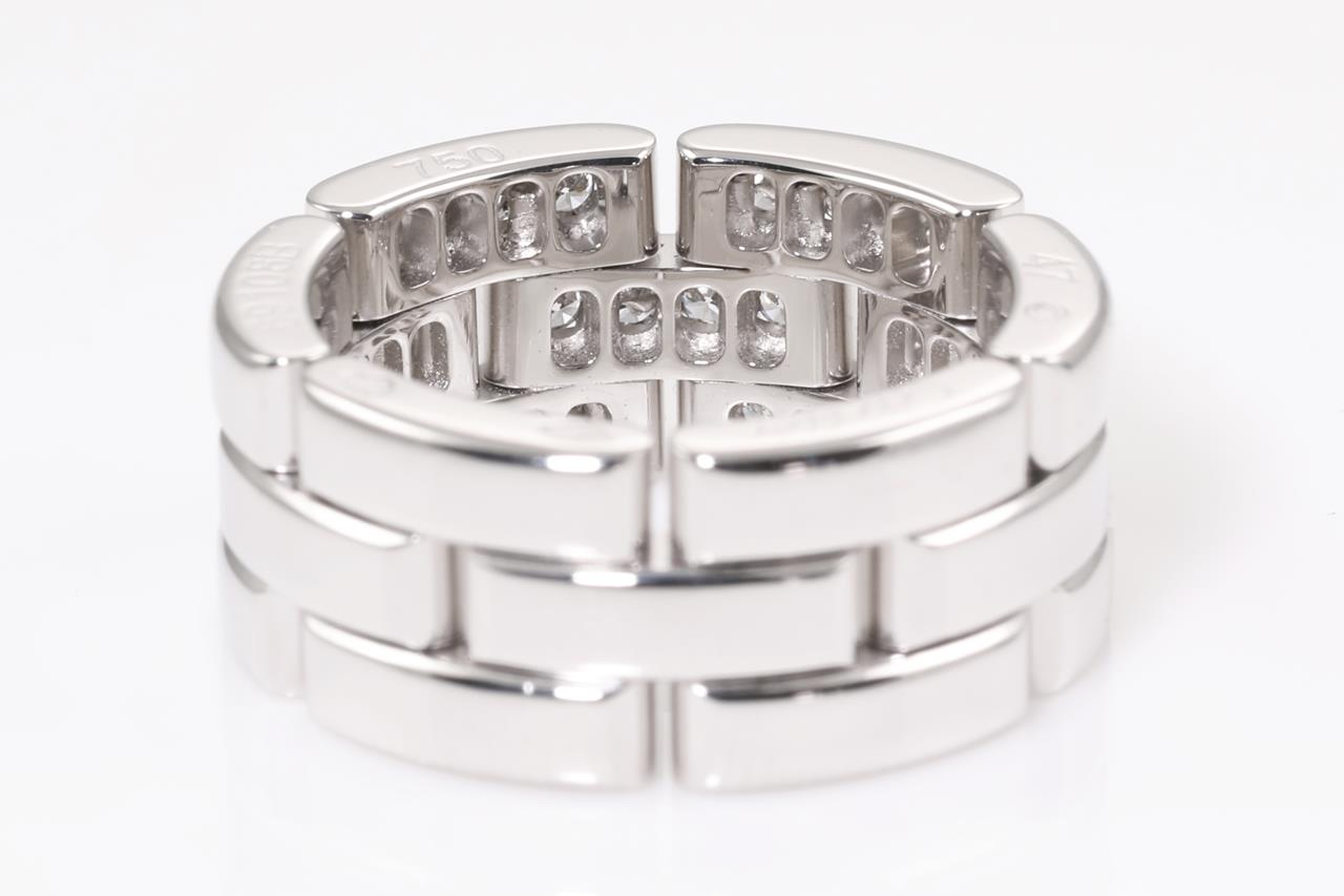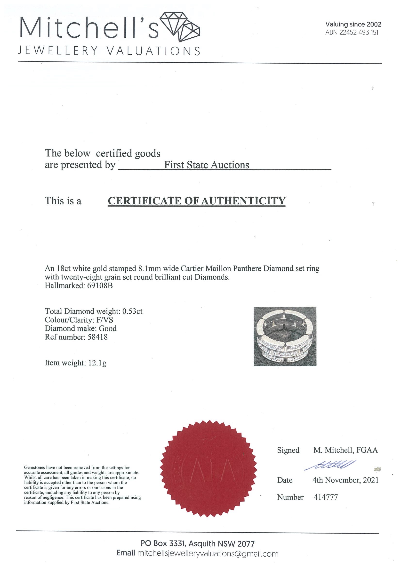Cartier Maillon Panthère ring with 3 half-paved rows of round Diamonds totalling 0.53cts (Estimated grading: F VS). Width: 7.8 mm. Thickness: 2.4 mm. Cartier stamped size 47, G - ring resizing is not recommended. Weight: 12.1g. With Cartier box. With certificate #414777. (Pre-owned)