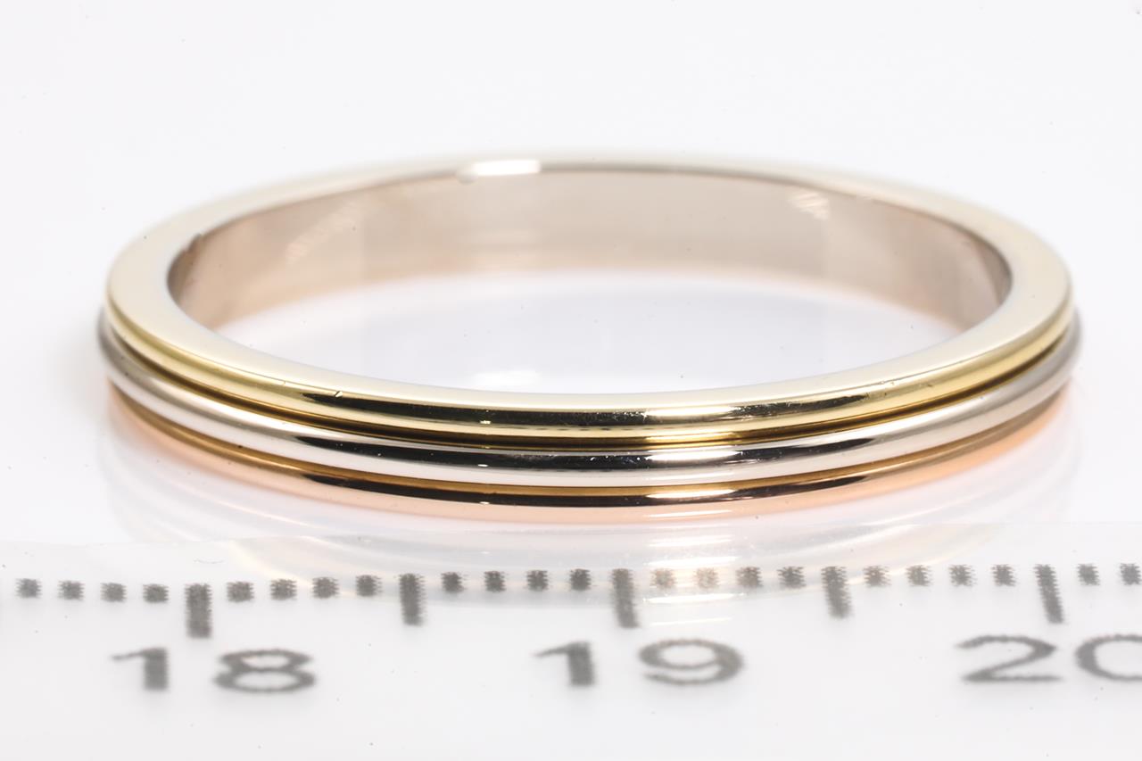 Cartier mens tri-colour band ring. 18ct yellow, white gold & rose gold. Cartier stamped size 65, V1/2 - ring resizing is not recommended. Circa 1988. Width 3mm. Weight: 4.5g. With Cartier certificate of authenticity dated 11/03/2001. (Pre-owned)