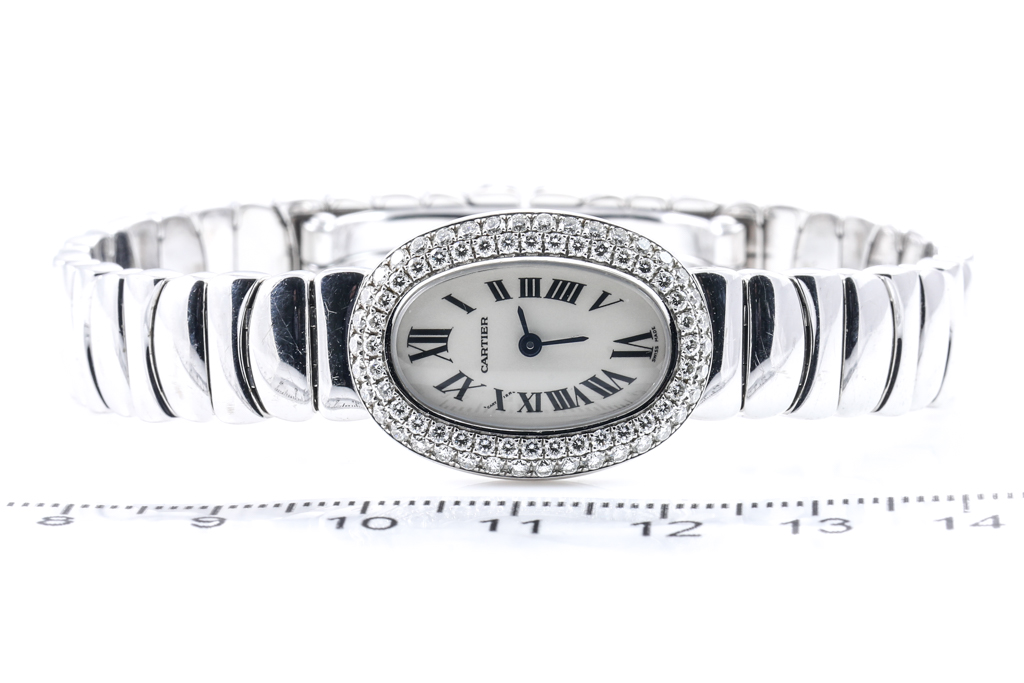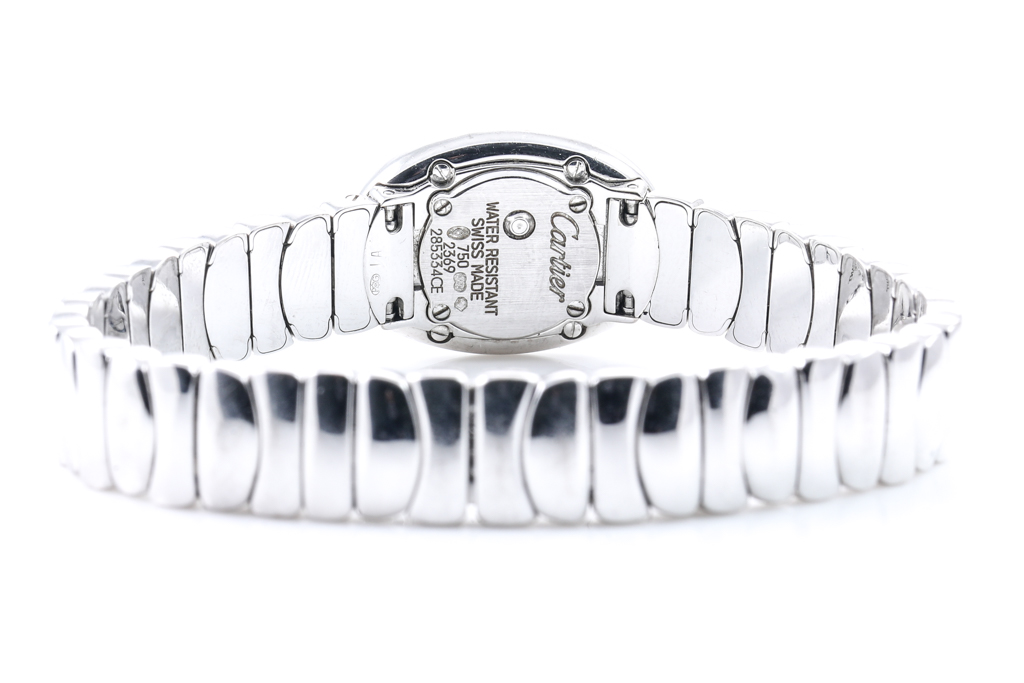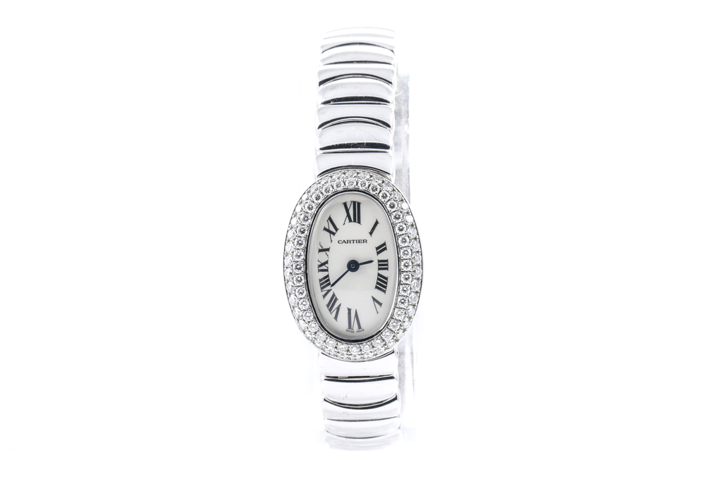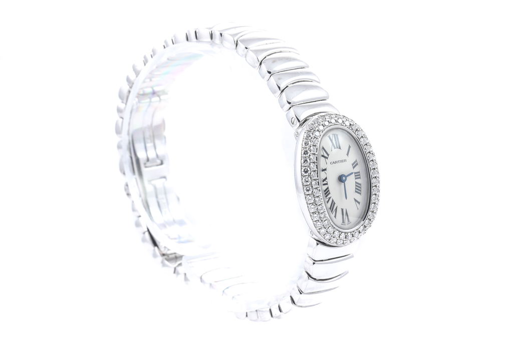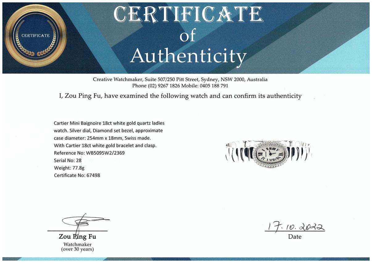 Cartier Mini Baignoire 18ct white gold quartz ladies watch. Silver dial, Diamond set bezel, approximate case diameter: 25mm x 18mm, wrist size: 16cm, Swiss made. Ref# WB5095W2/2369. With Cartier 18ct white gold bracelet and clasp. With Certificate of Authenticity and Cartier box. 3 month FSA warranty. (Pre-owned)