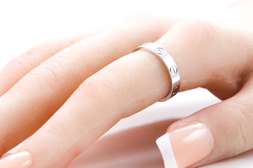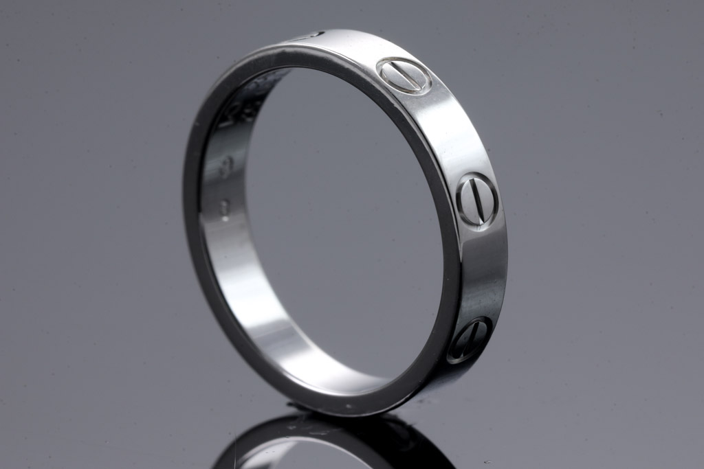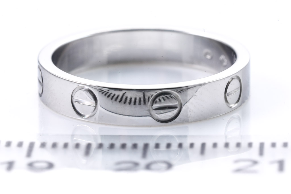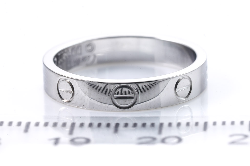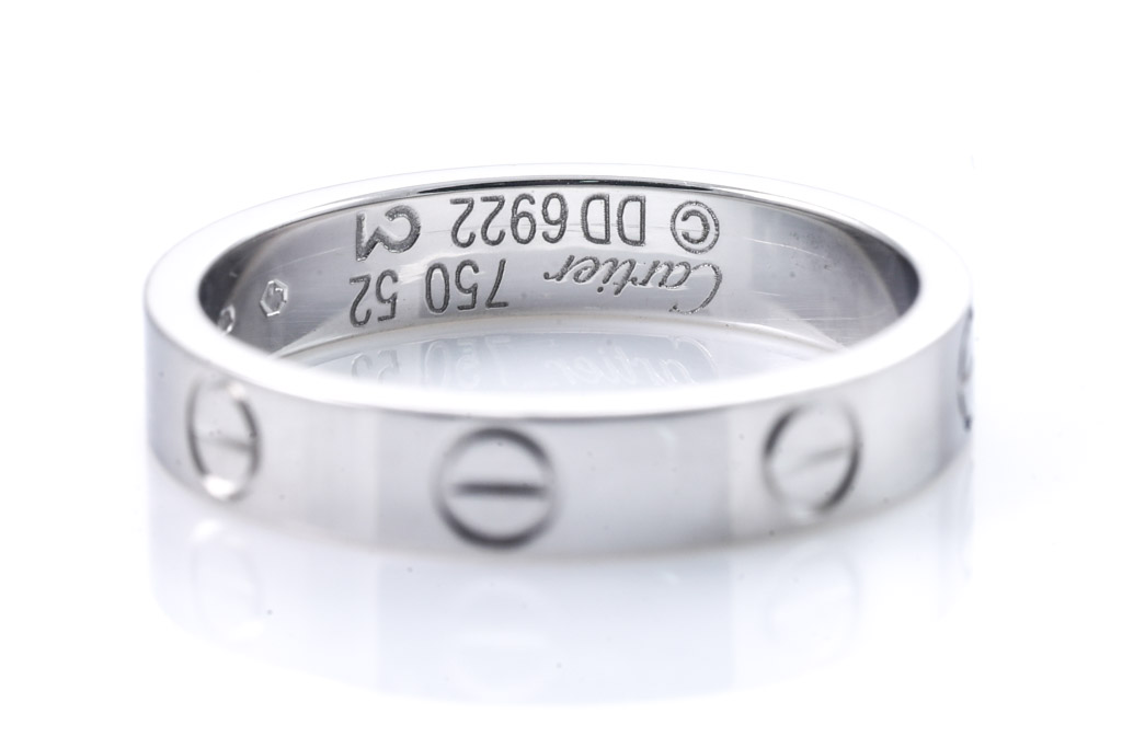 Cartier Mini Love ring. 18ct white gold. Cartier stamped size 52, L - ring resizing is not recommended. Width: 3.6mm. Weight: 4.2g. (Pre-owned)