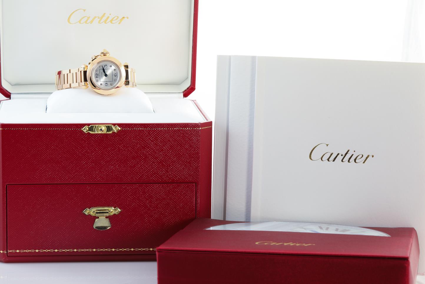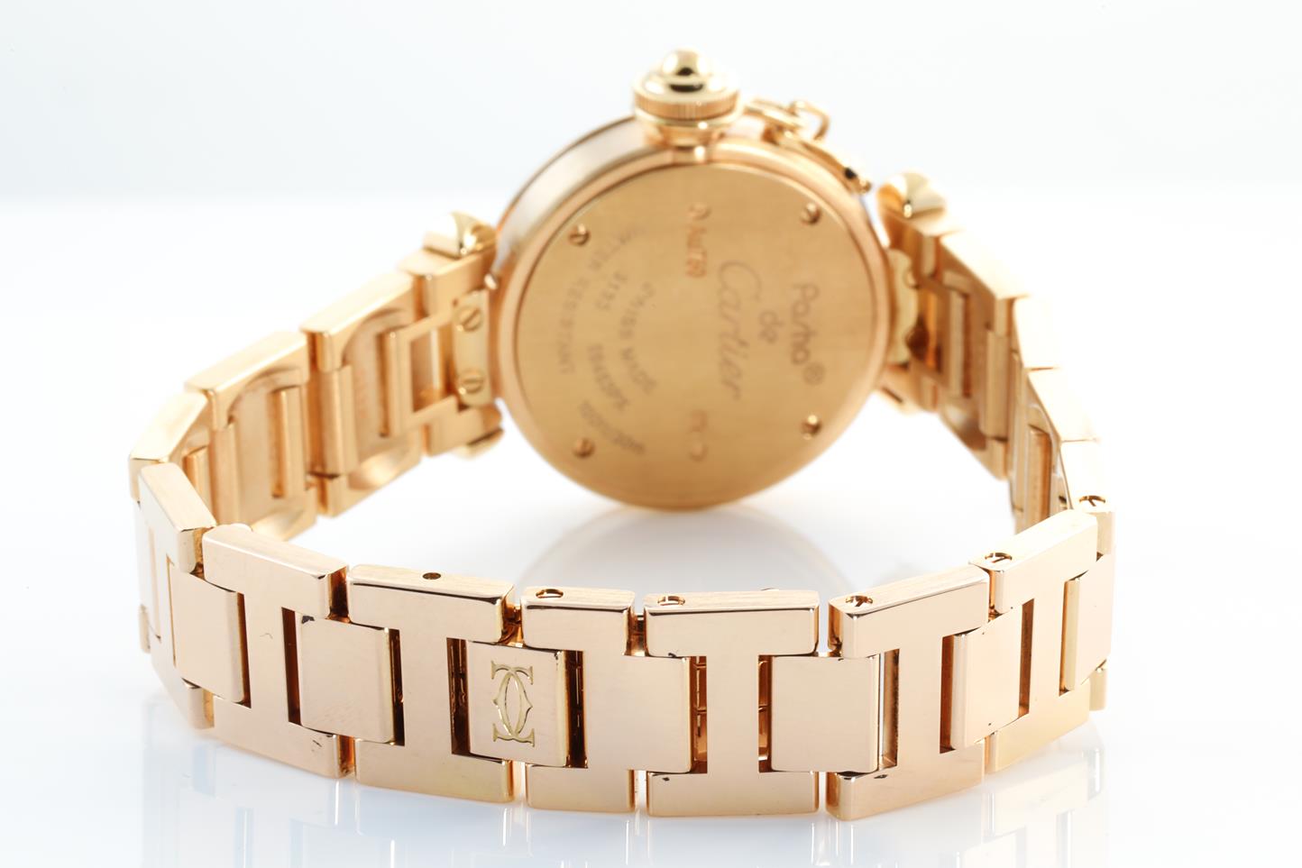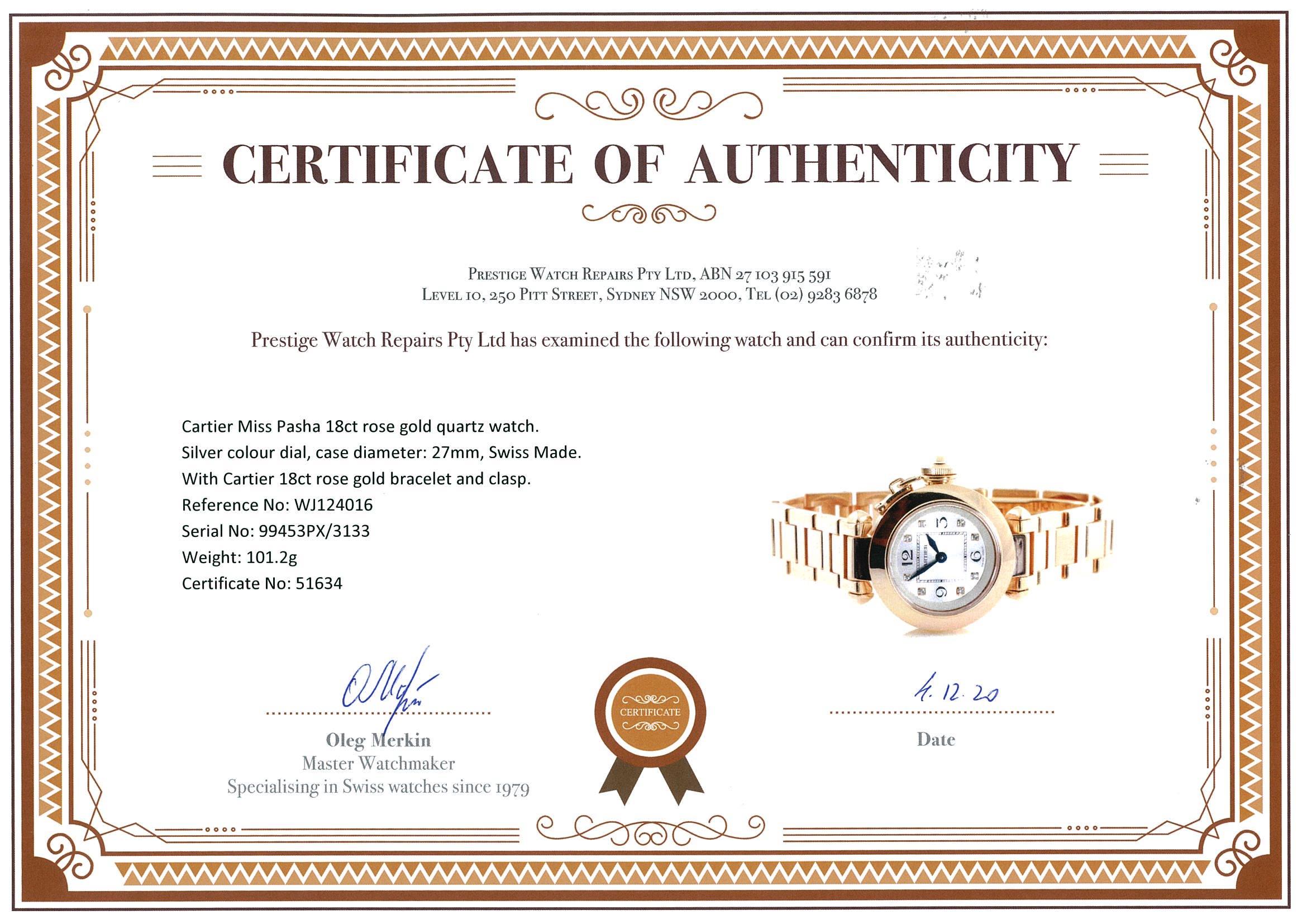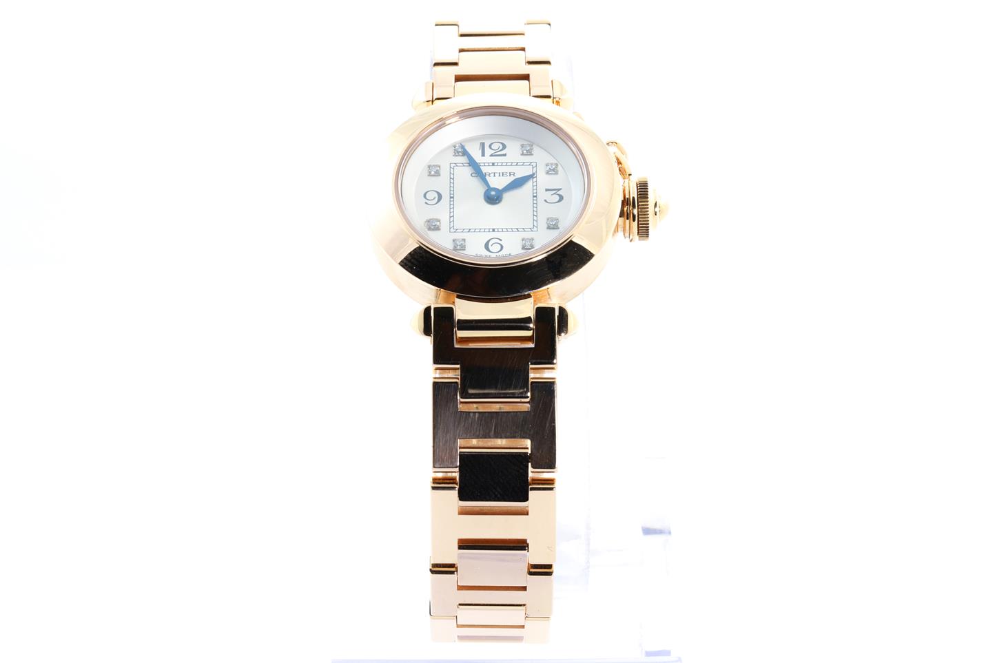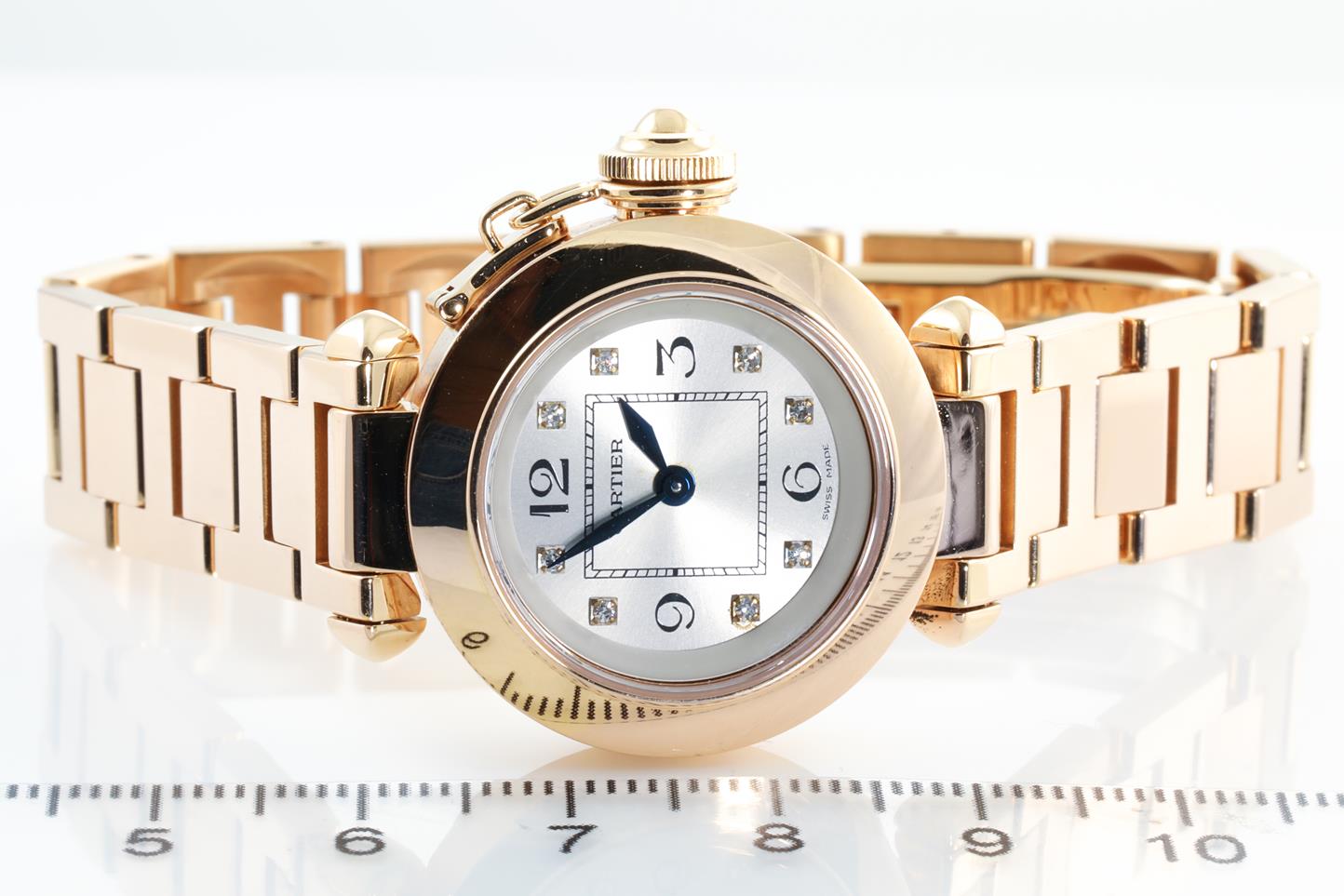 Cartier Miss Pasha 18ct rose gold quartz watch. Silver colour dial with Diamond indicators, wrist size: 16.5cm, case diameter: 27mm, Swiss Made. Ref# WJ124016. With Cartier 18ct rose gold bracelet and clasp. With certificate of authenticity and Cartier box. 3 month FSA warranty. (Pre-owned)
