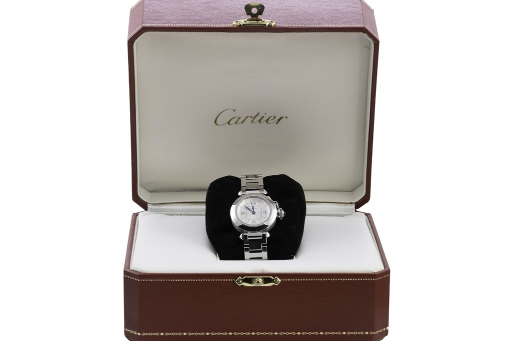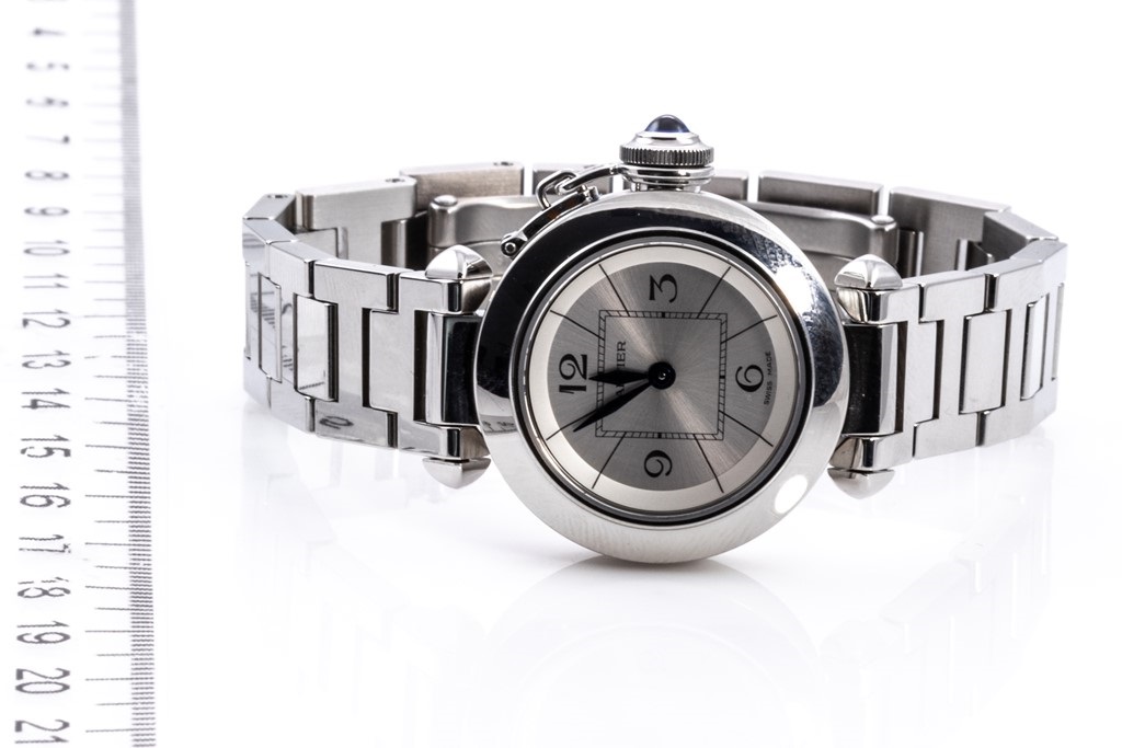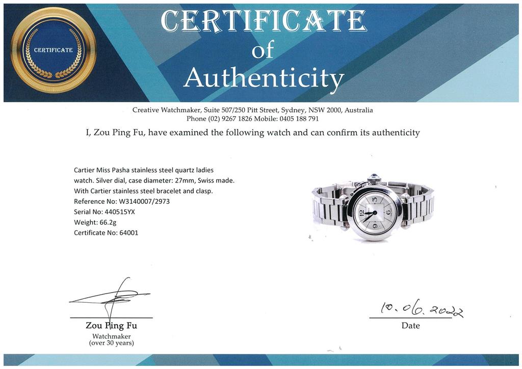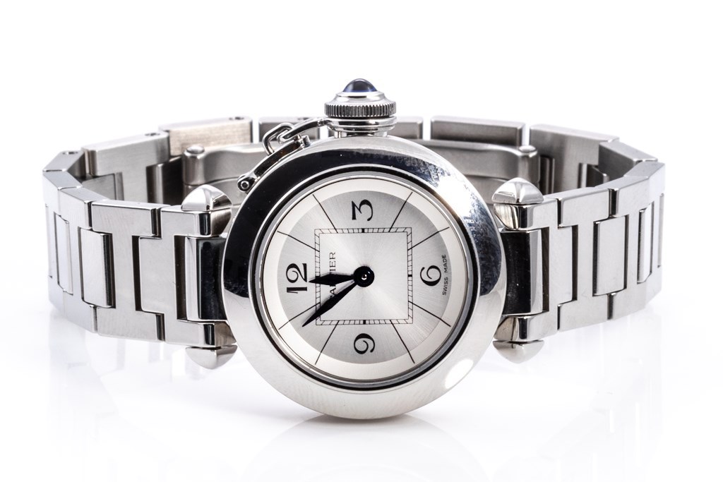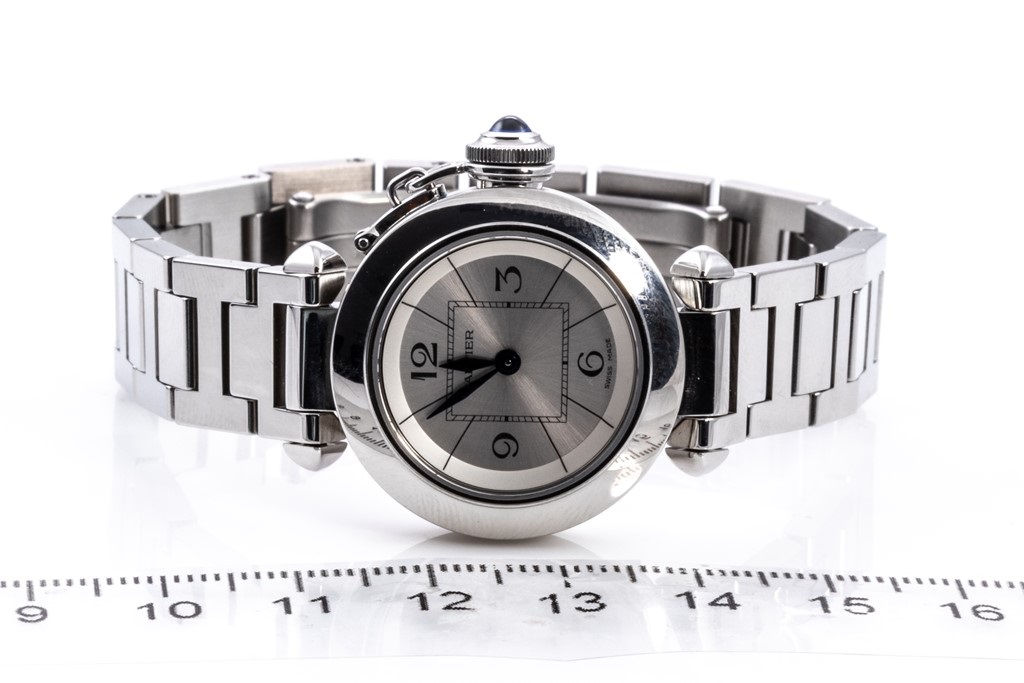 Cartier Miss Pasha stainless steel quartz ladies watch. Silver dial, case diameter: 27mm, wrist size: 16cm, Swiss made. Ref# W3140007/2973. With Cartier stainless steel bracelet and clasp. With Certificate of Authenticity and Cartier box with Cartier gift bag. 3 month FSA warranty. (Pre-owned)