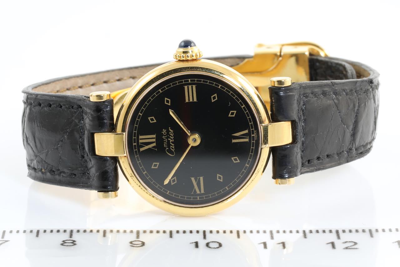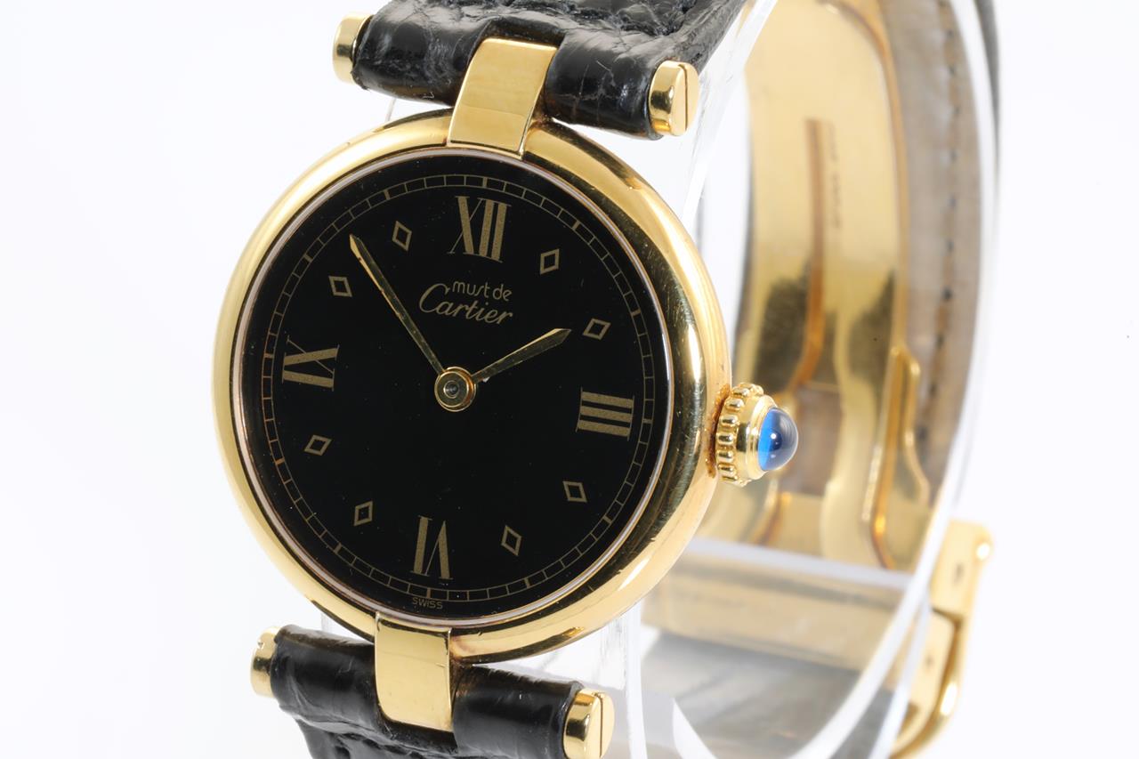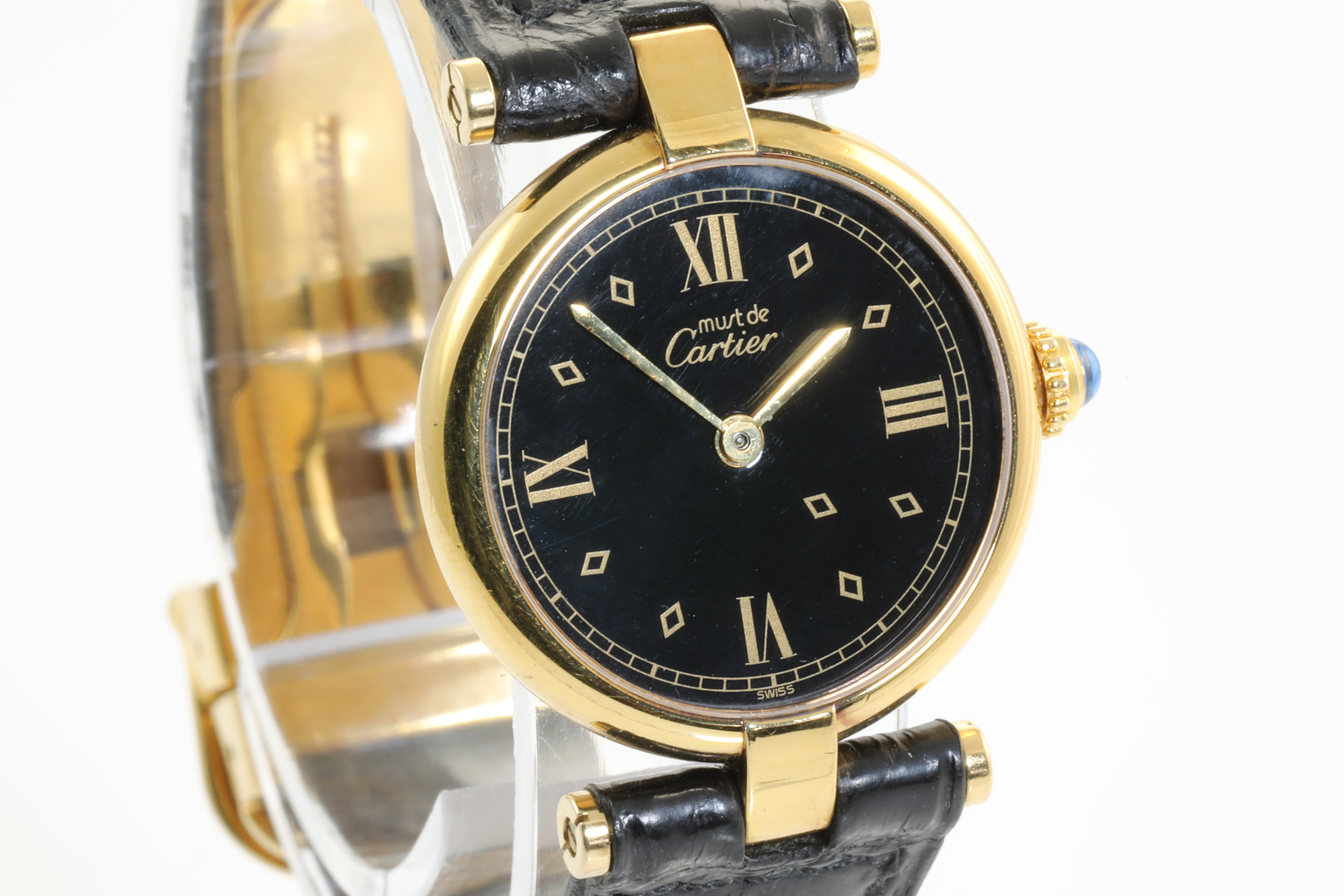 Cartier Must Vermeil gold plated silver quartz ladies watch. Black dial, case diameter: 24mm, wrist size: 14cm (adjustable up to 15cm), Swiss made. Ref #590004. With Cartier black leather strap and clasp. With certificate of authenticity. 3 month FSA warranty. (Pre-owned)