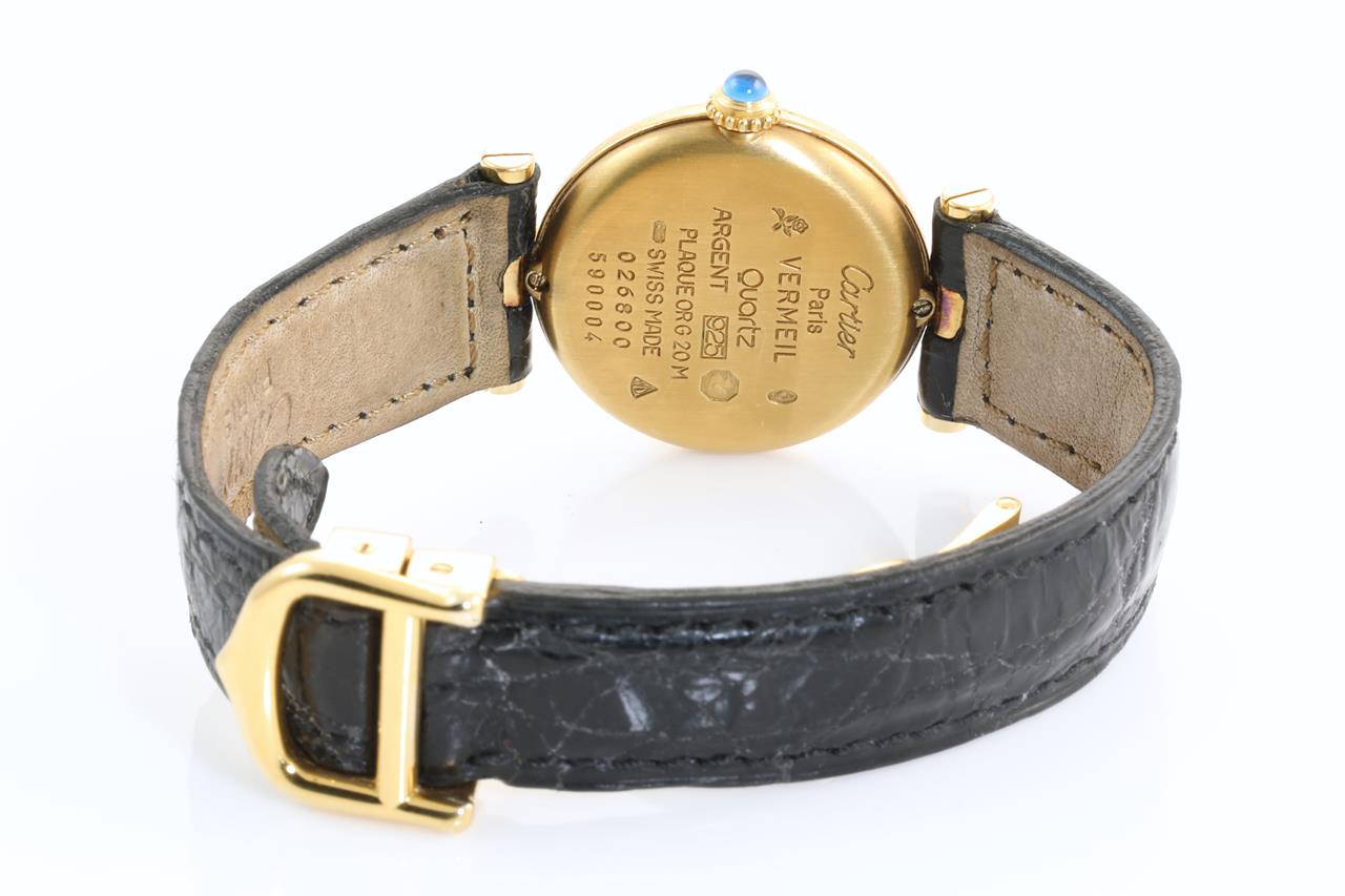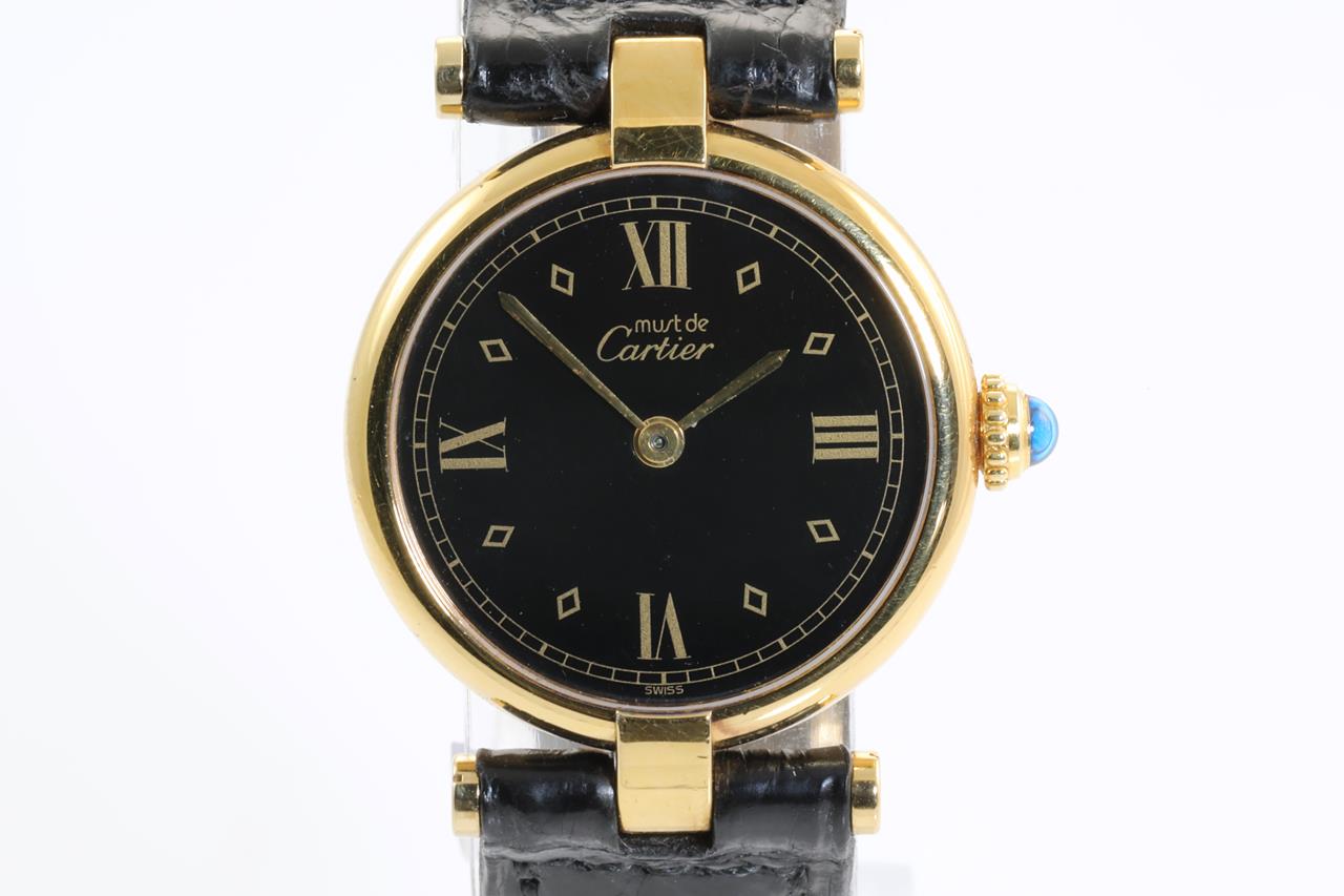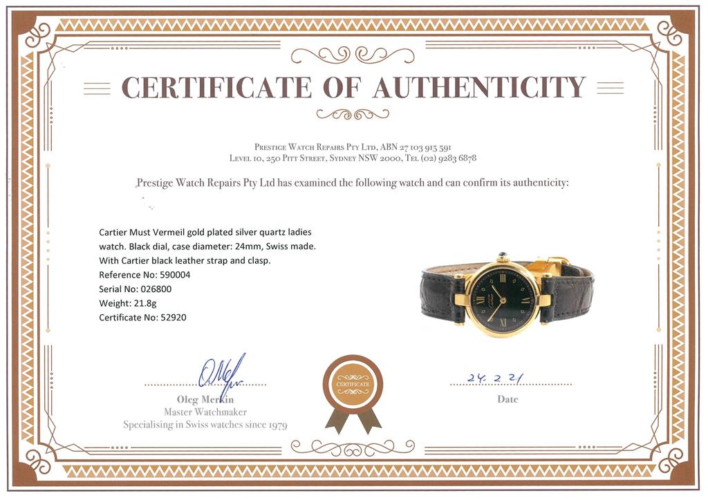 Cartier Must Vermeil gold plated silver quartz ladies watch. Black dial, case diameter: 24mm, wrist size: 14cm (adjustable up to 15cm), Swiss made. Ref #590004. With Cartier black leather strap and clasp. With certificate of authenticity. 3 month FSA warranty. (Pre-owned)