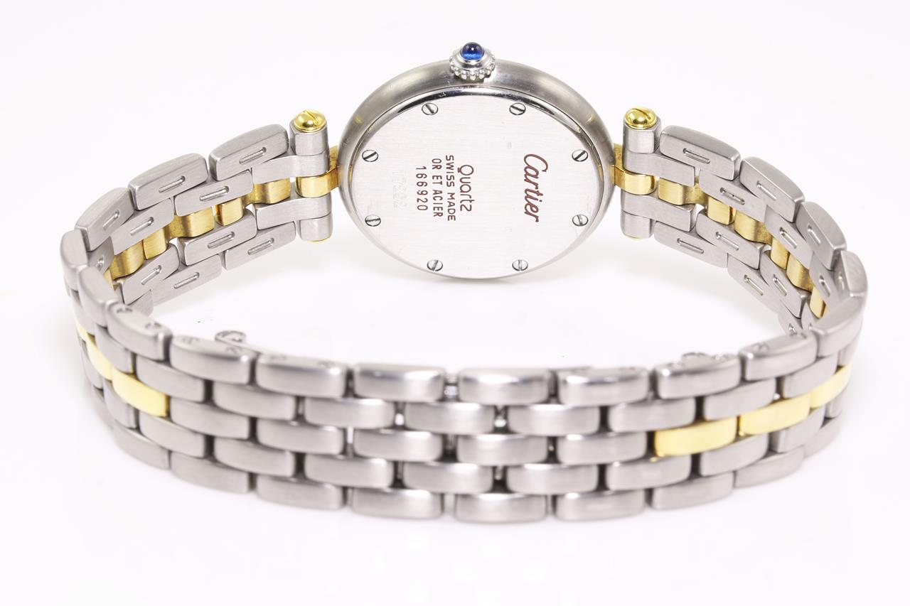 Cartier Panthere 18ct yellow gold and stainless steel quartz ladies watch. Silver dial, case diameter: 24mm, wrist size: 15cm, Swiss made. Ref# 166920. With Cartier two tone bracelet and clasp. With certificate of authenticity. 3 month FSA warranty. (Pre-owned)