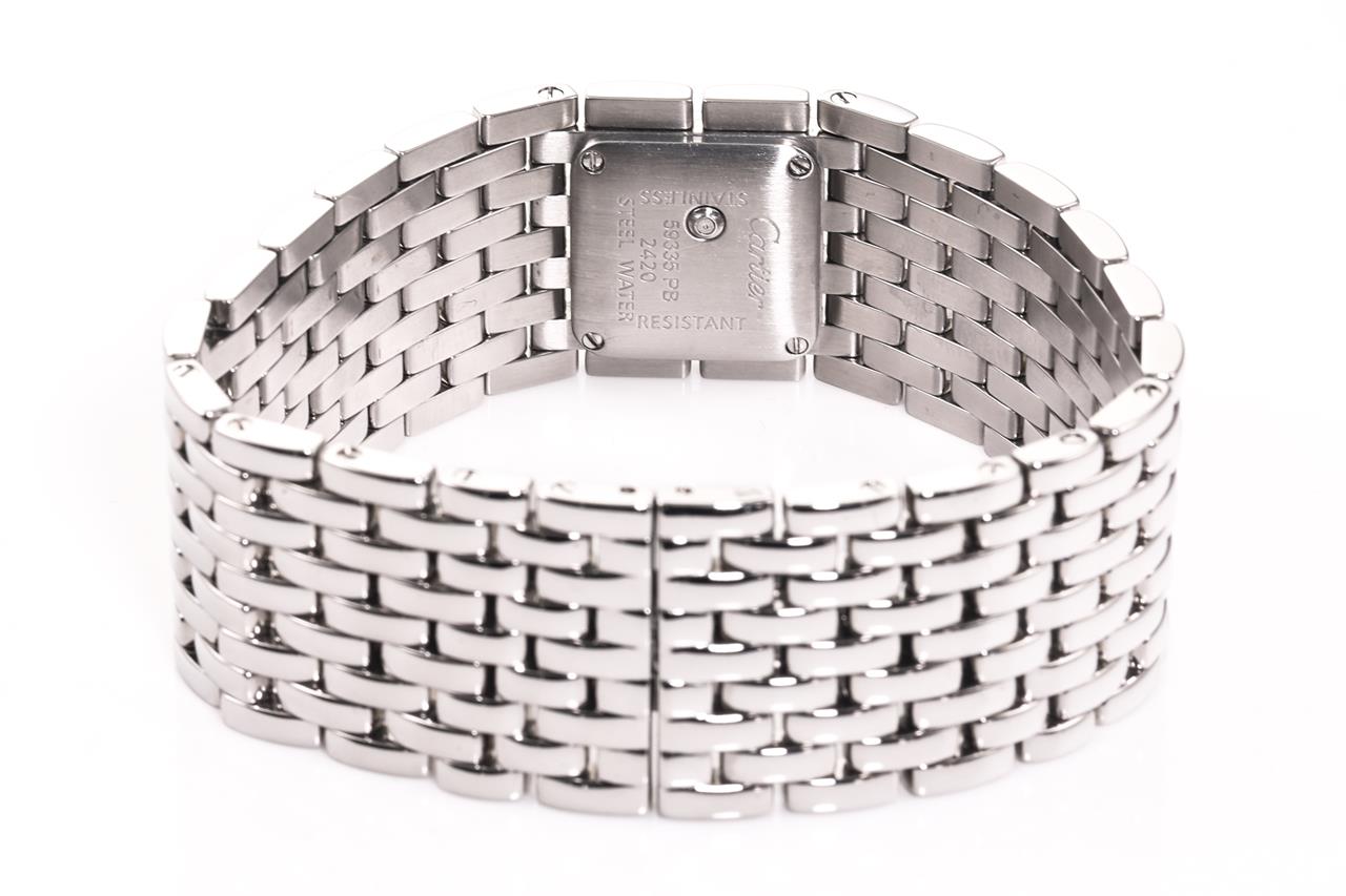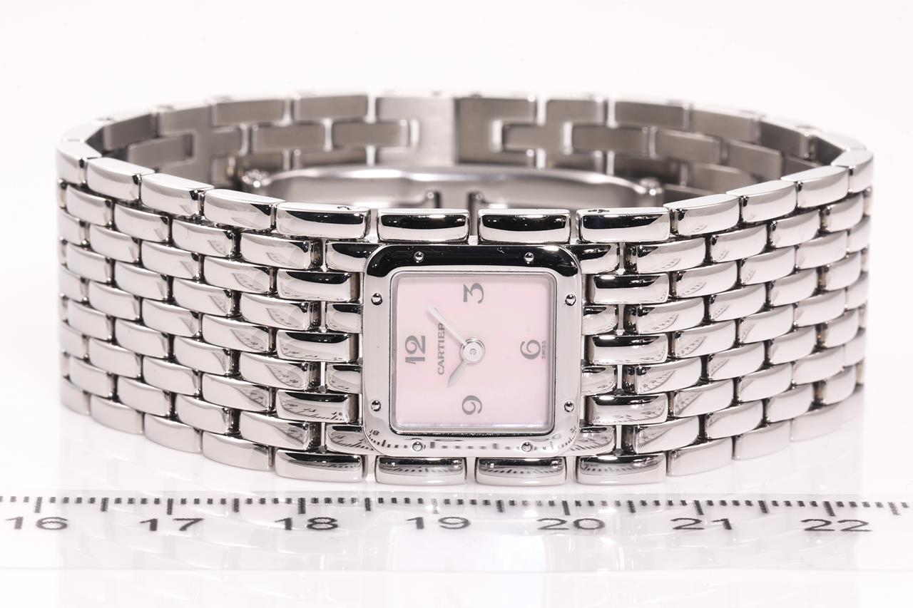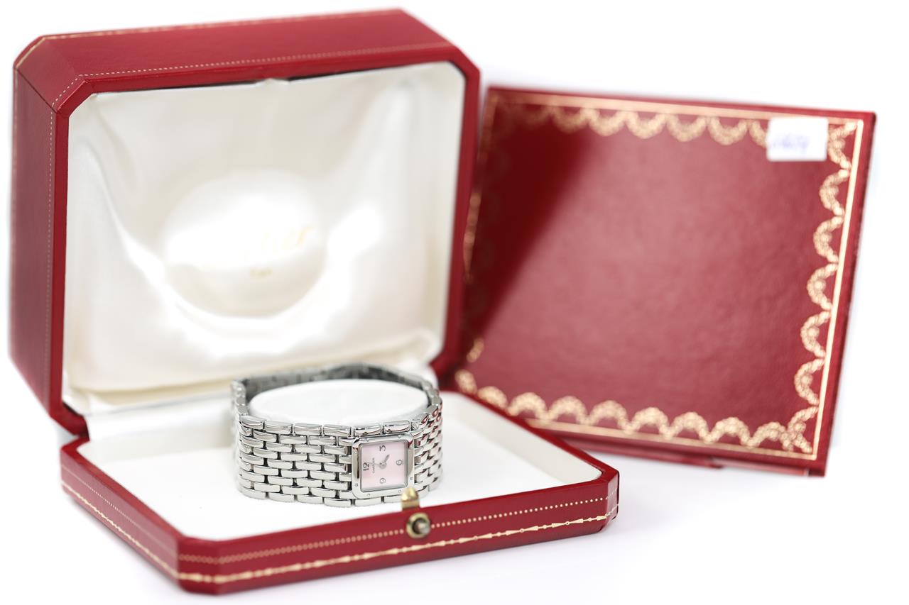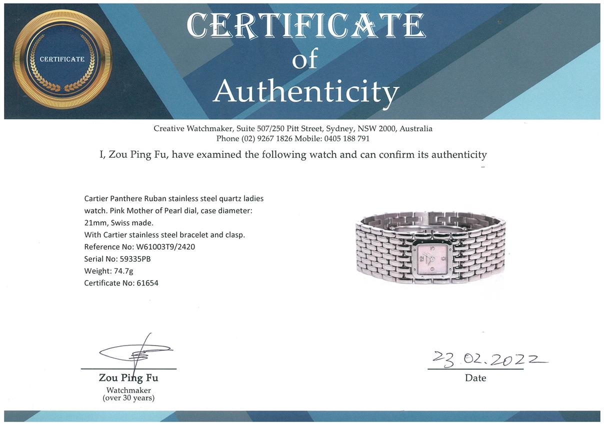 Cartier Panthere Ruban stainless steel quartz ladies watch. Pink Mother of Pearl dial, case diameter: 21mm, wrist size: 16cm, Swiss made. Ref# W61003T9/2420. With Cartier stainless steel bracelet and clasp. With Certificate of Authenticity and Cartier box. 3 month FSA warranty. (Pre-owned)