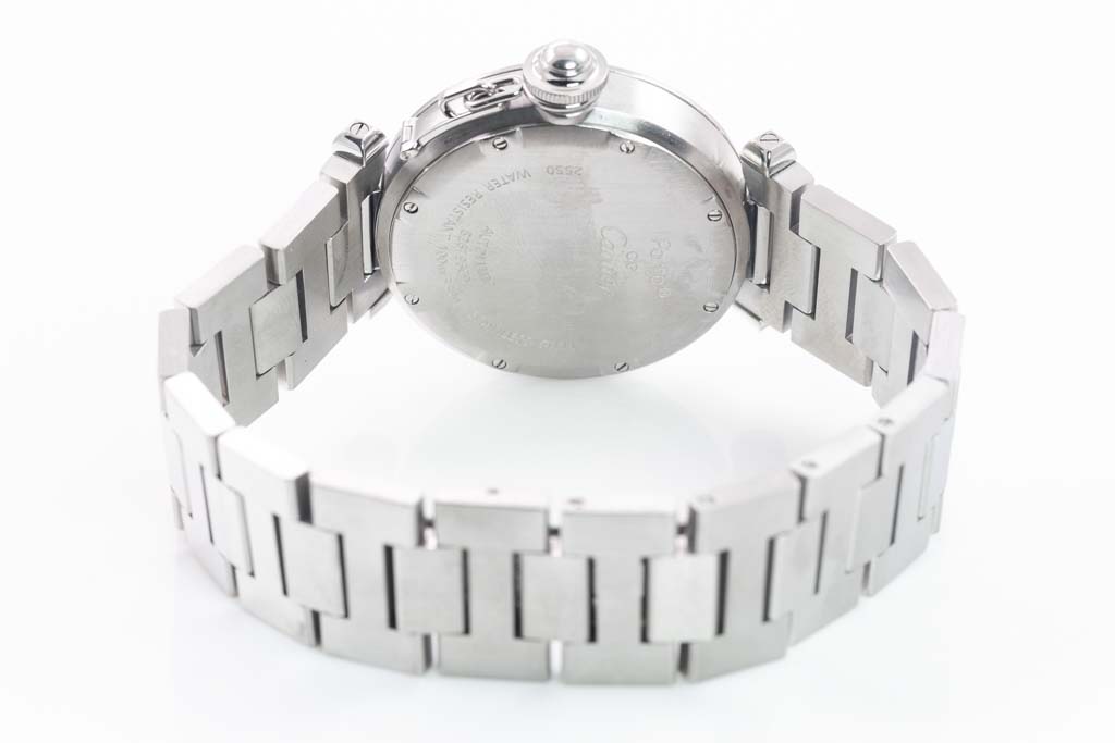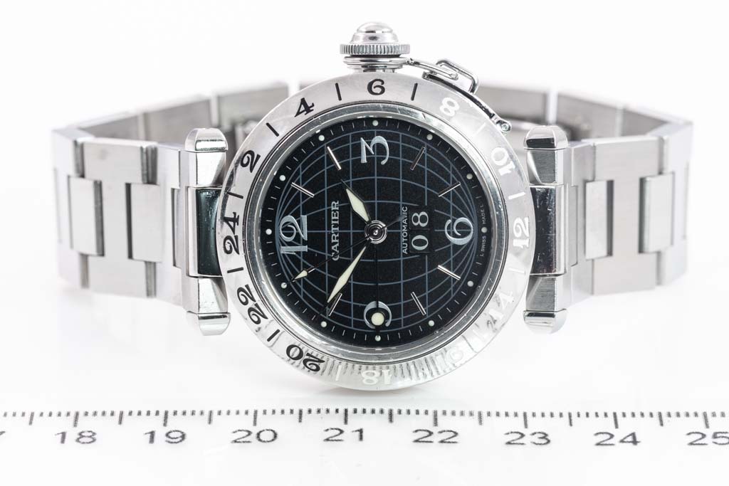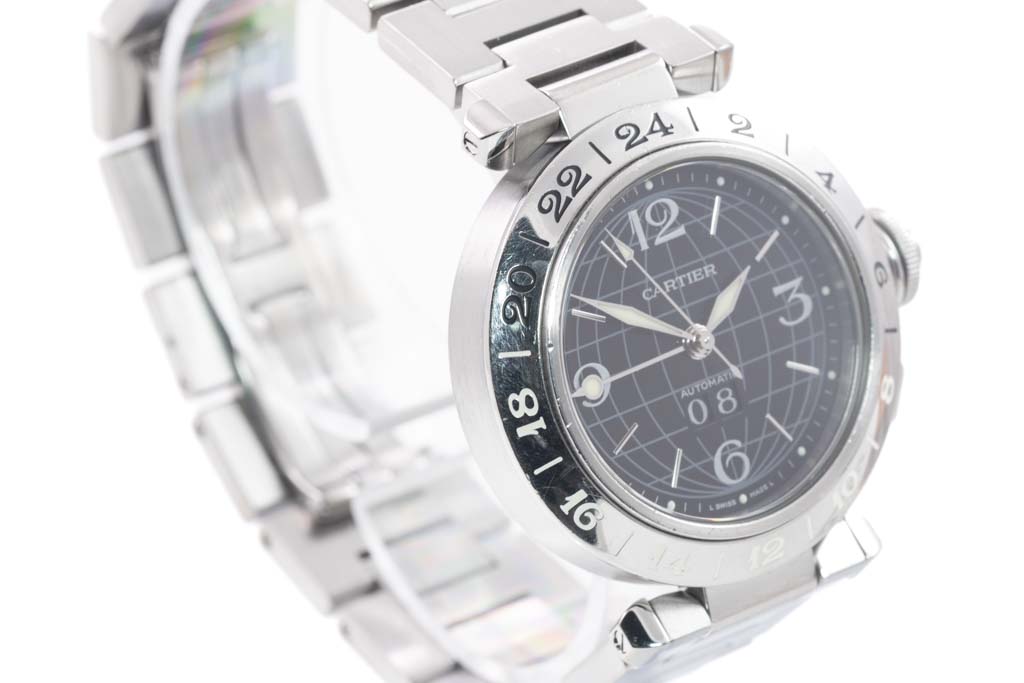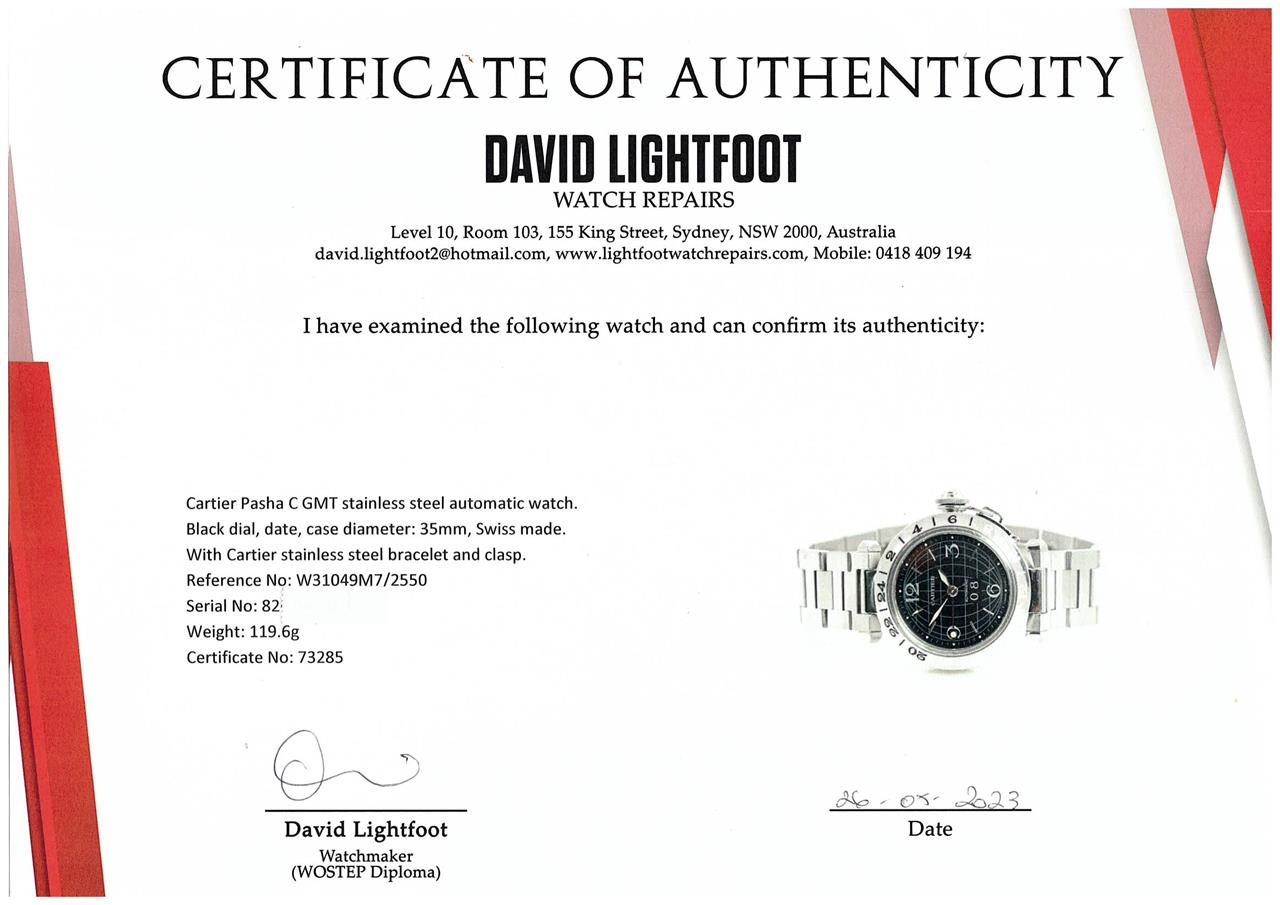 Cartier Pasha C GMT stainless steel automatic watch. Black dial, date, case diameter: 35mm, wrist size: 17.5cm, Swiss made. Ref# W31049M7/2550. With Cartier stainless steel bracelet and clasp. With Certificate of Authenticity. 3 month FSA warranty. (Pre-owned)