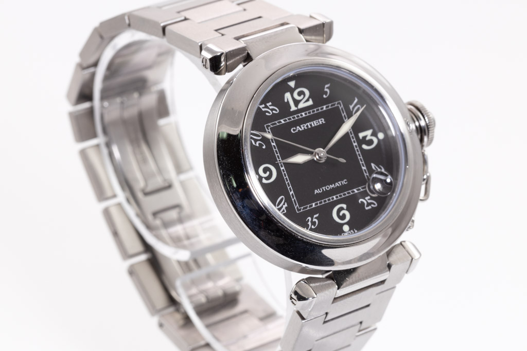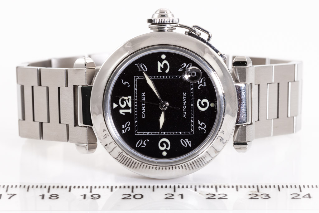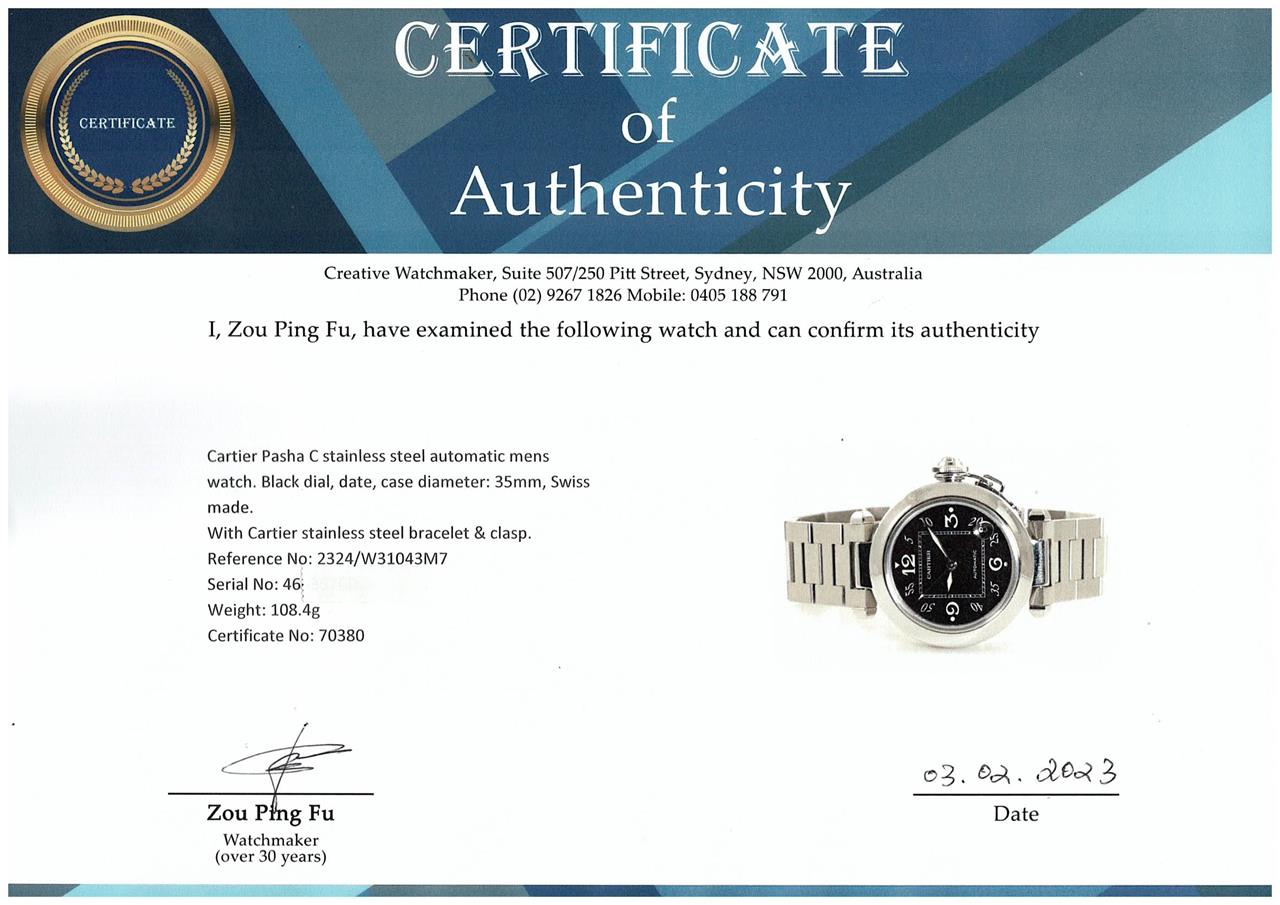 Cartier Pasha C stainless steel automatic men's watch. Black dial, date, case diameter: 35mm, wrist size: 17cm, Swiss made. Ref# 2324/W31043M7. With Cartier stainless steel bracelet & clasp. With Certificate of Authenticity and Cartier pouch. 3 month FSA warranty. (Pre-owned)