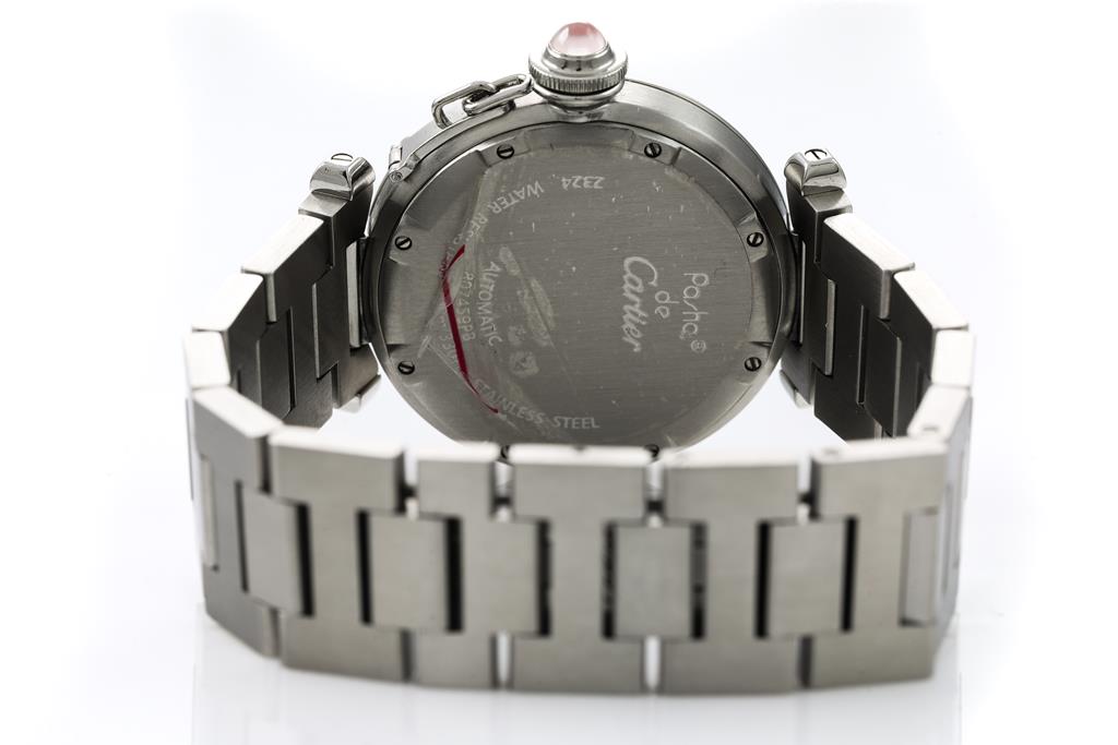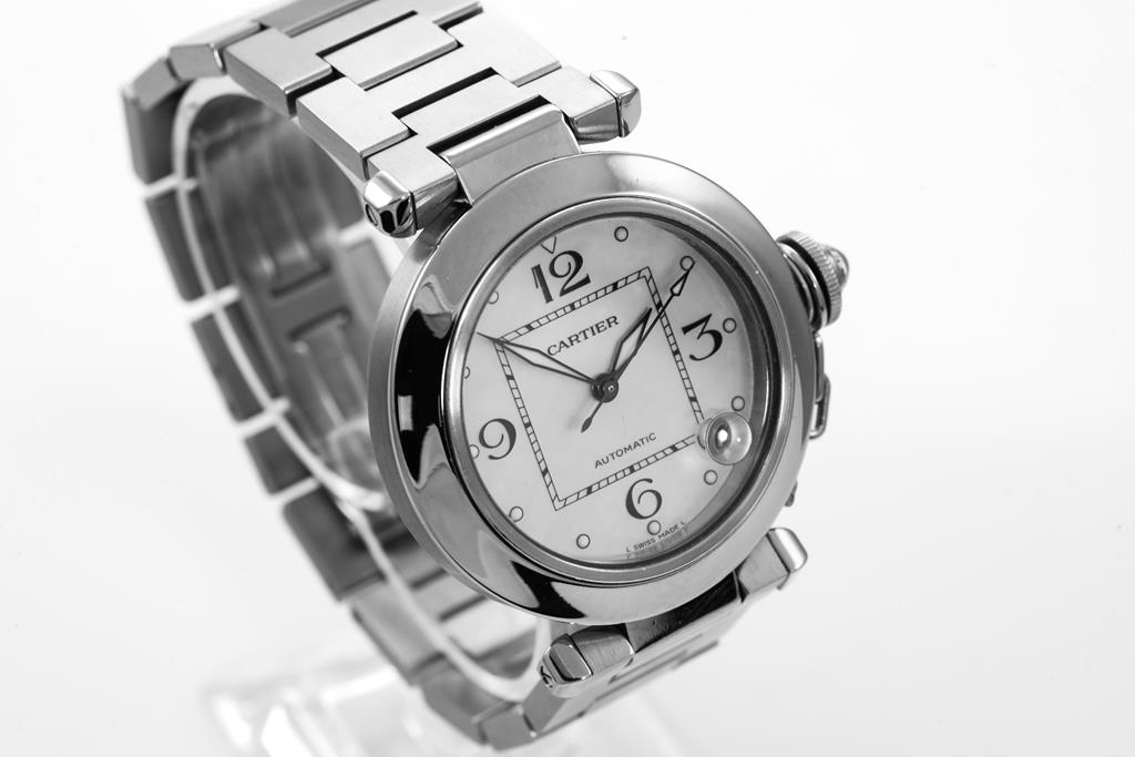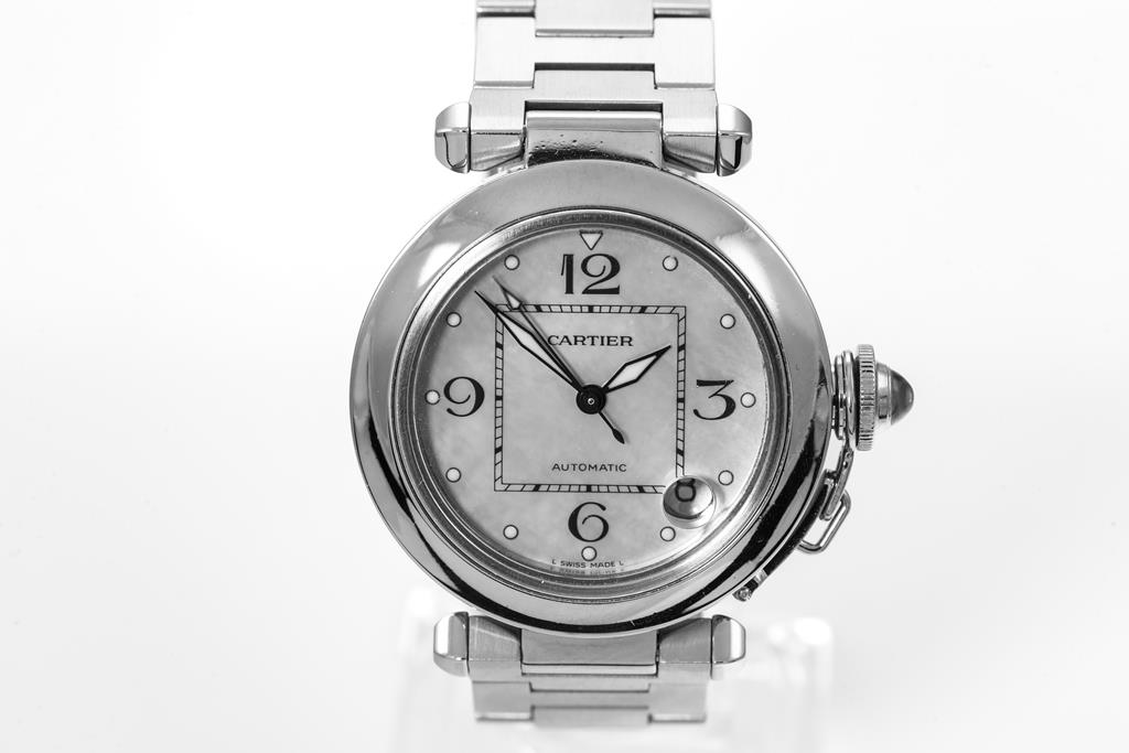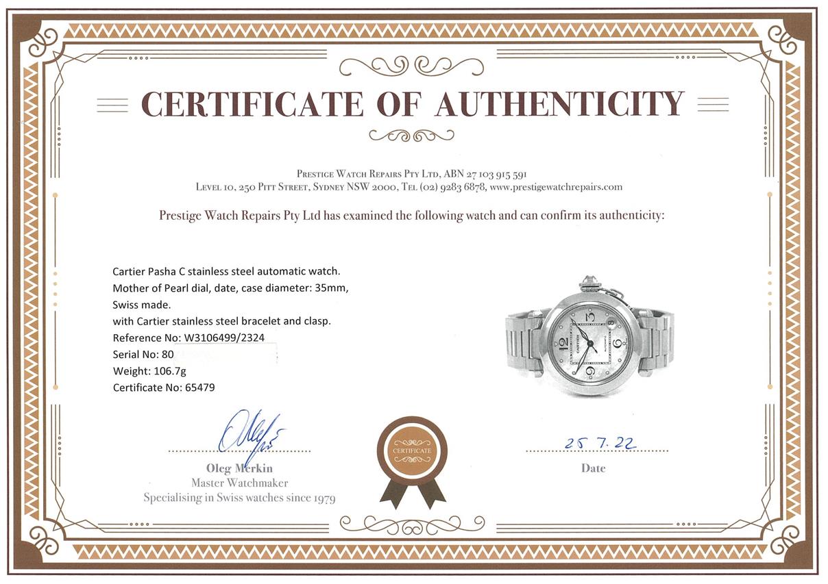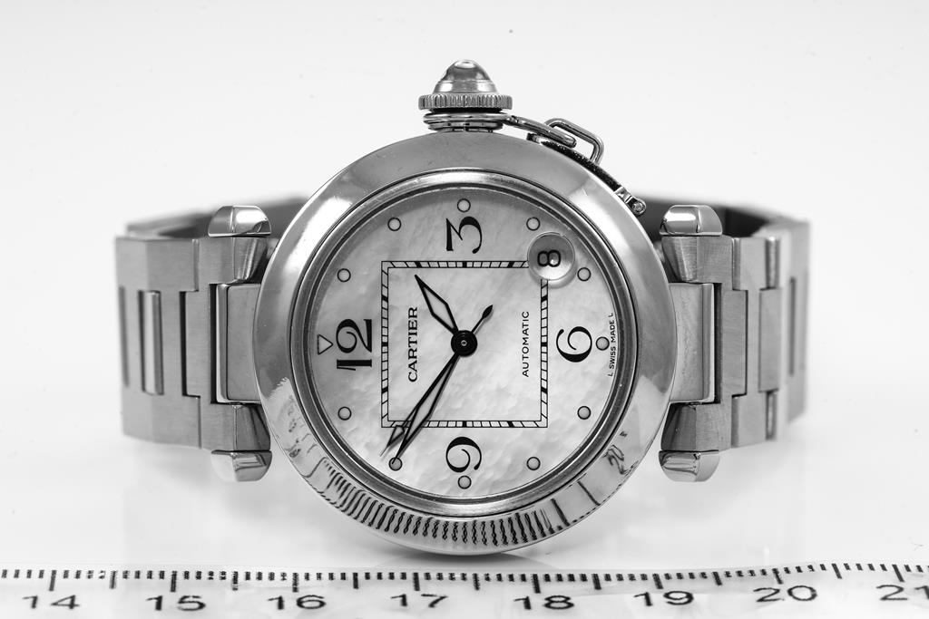 Cartier Pasha C stainless steel automatic watch. Mother of Pearl dial, date, case diameter: 35mm, wrist size: 16cm, Swiss made. Ref# W3106499/2324. with Cartier stainless steel bracelet and clasp. With Certificate of Authenticity. 3 month FSA warranty. (Pre-owned)