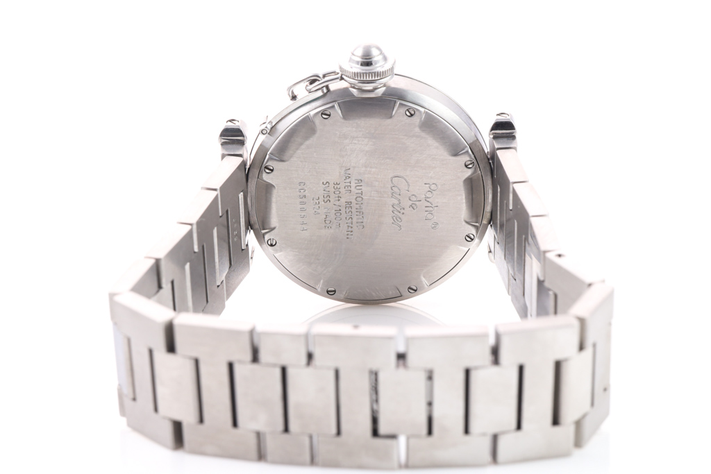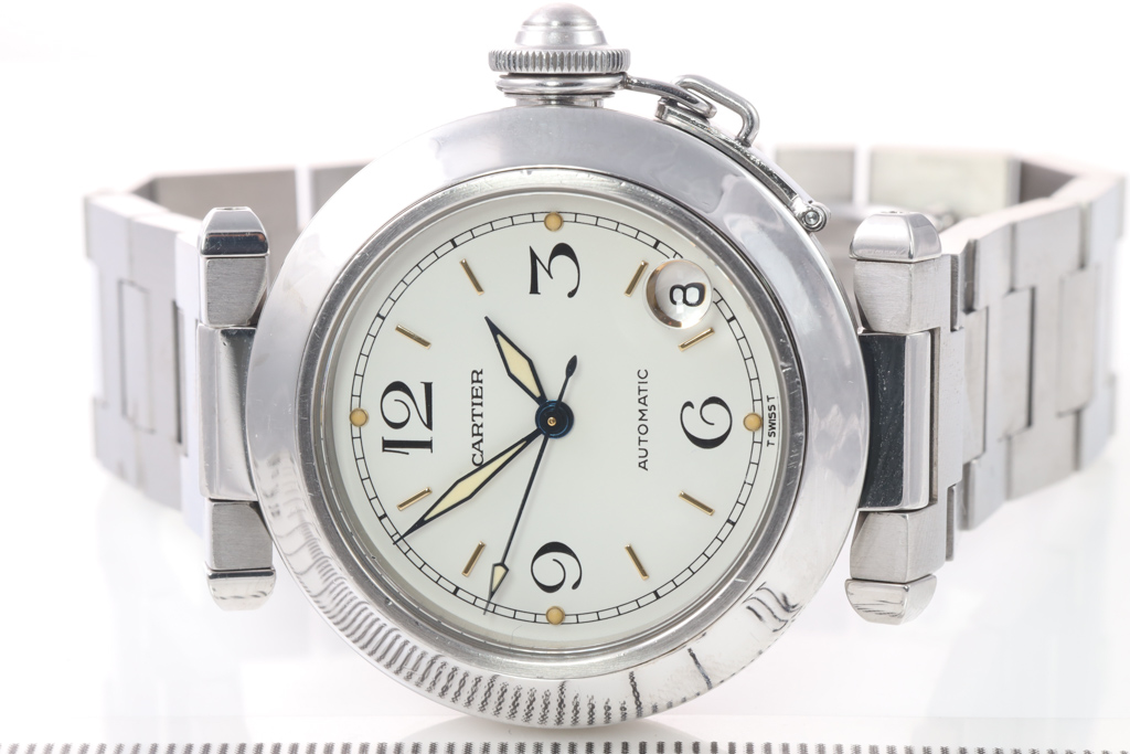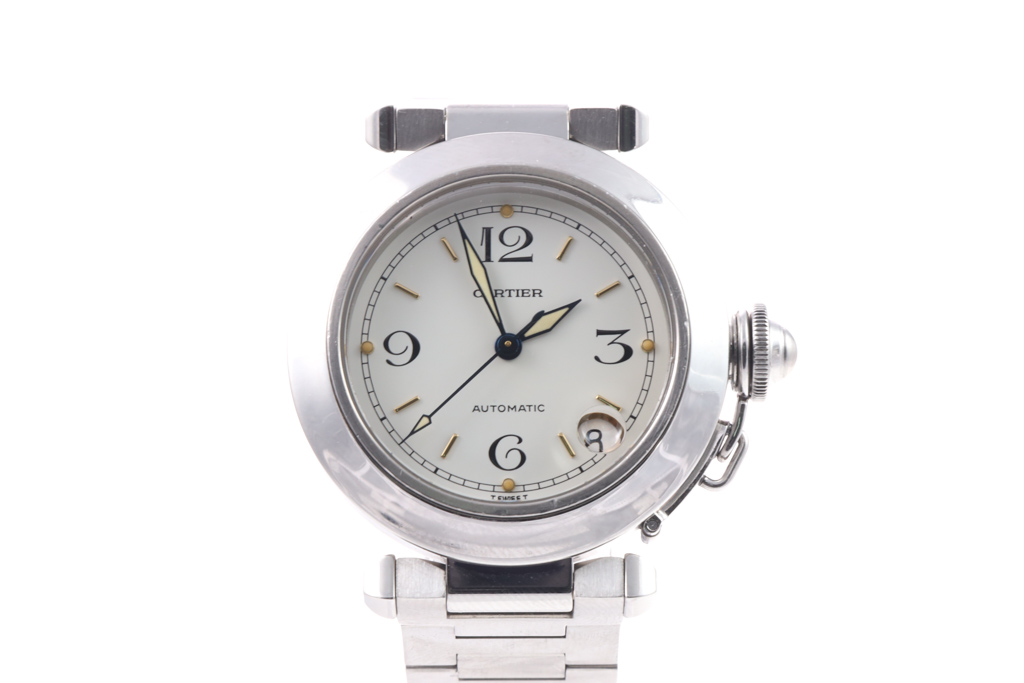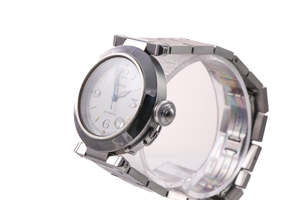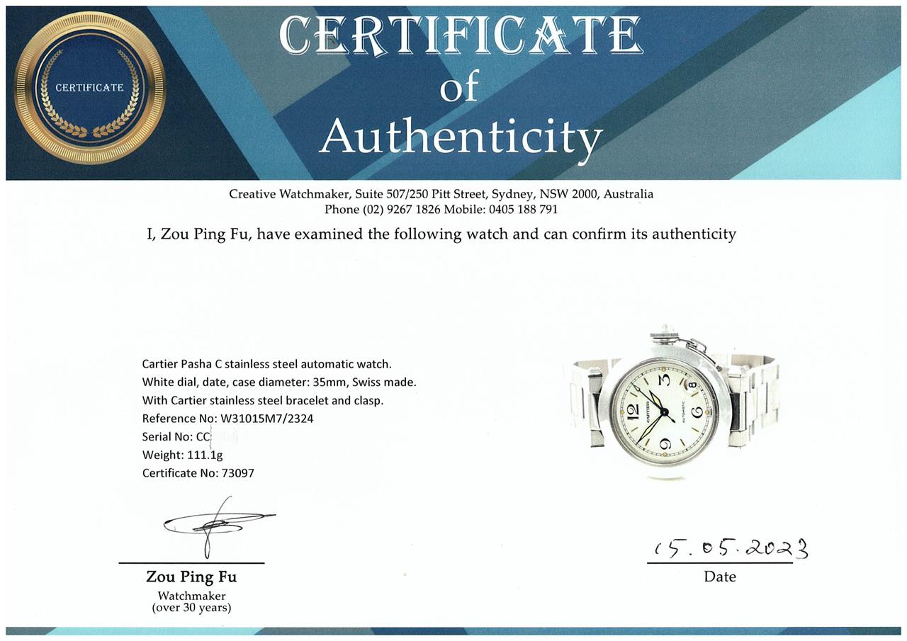 Cartier Pasha C stainless steel automatic watch. White dial, date, case diameter: 35mm, wrist size: 18.5cm, Swiss made. Ref# W31015M7/2324. With Cartier stainless steel bracelet and clasp. With Certificate of Authenticity, Cartier International Guarantee Certificate booklet dated 06/05/1998 and Cartier box. 3 month FSA warranty. (Pre-owned)